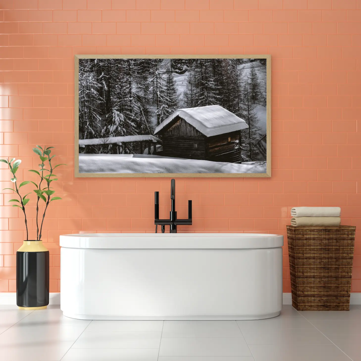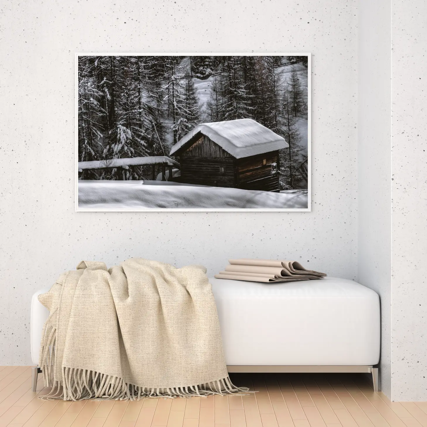 تجسد هذه اللوحة جمال الطبيعة في أبهى صوره، حيث تتناغم الألوان الباردة مع تفاصيل المنظر الخلاب. تعكس الأجواء الهادئة التي تثيرها الثلوج المتساقطة على السقف الخشبي، مما يضفي شعورًا بالسكينة والراحة. تخلق هذه القطعة الفنية جوًا من الدفء في أي مساحة، مما يجعلها مثالية لتزيين الجدران في المنازل أو المكاتب، حيث تساهم في تعزيز نمط الحياة العصري.