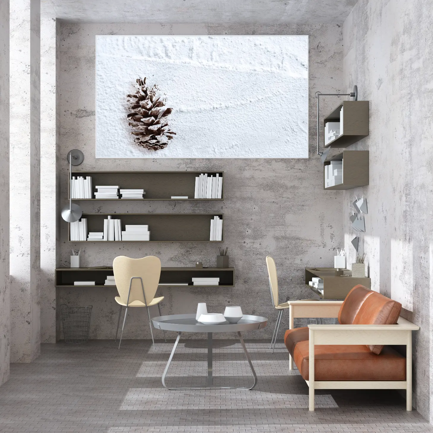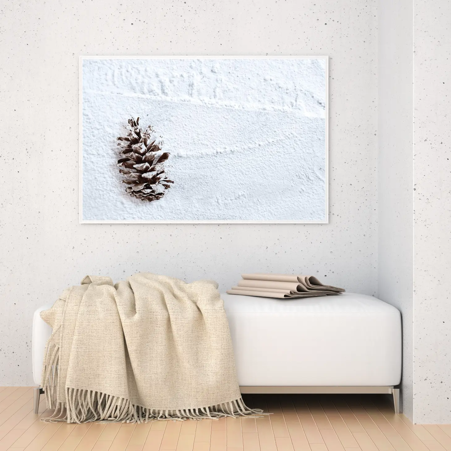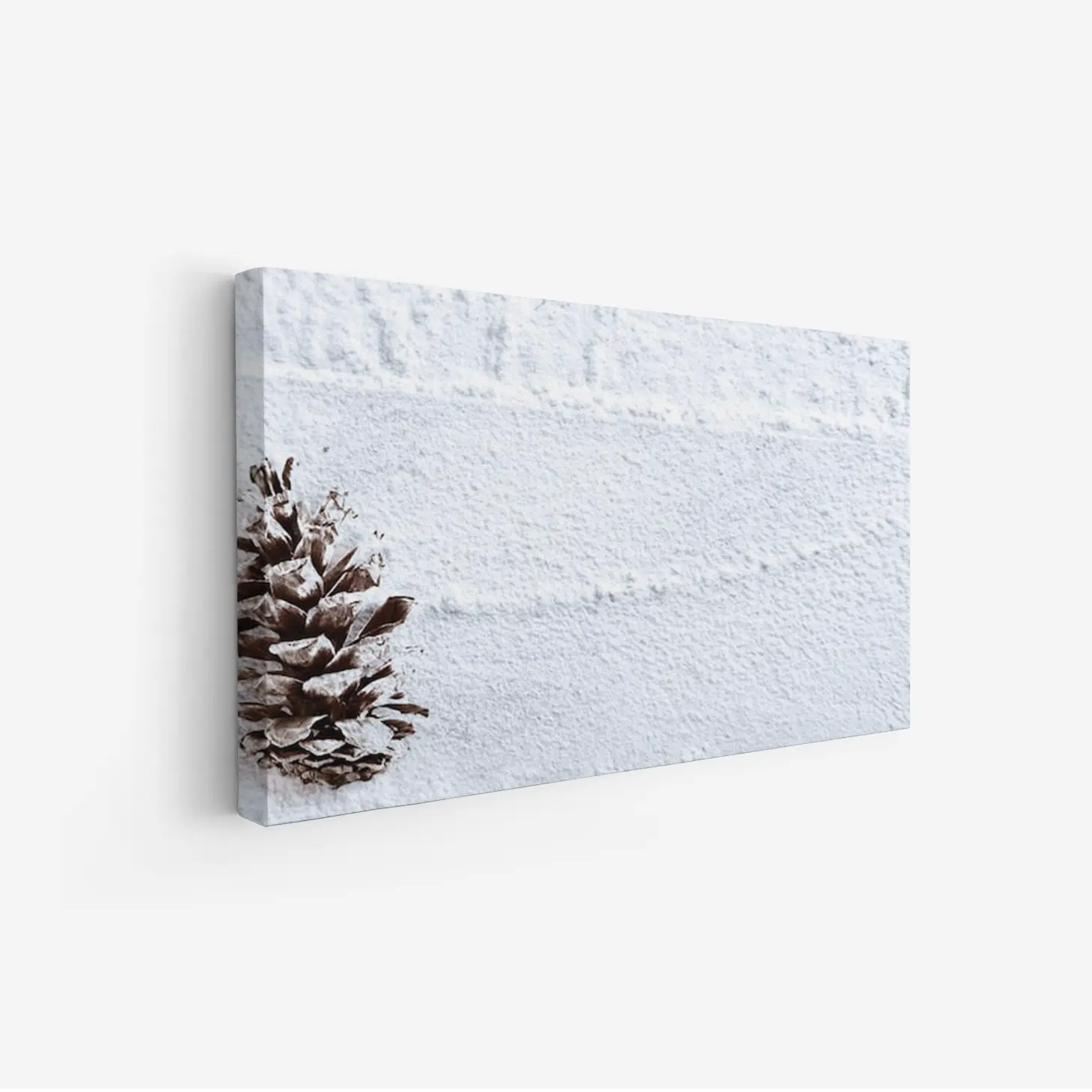 لوحة طبيعة هادئة مع مخروط صنوبر على خلفية بيضاء ناعمة، تعكس إحساس السكون والهدوء، لوحات طبيعة، لوحات كانفاس.