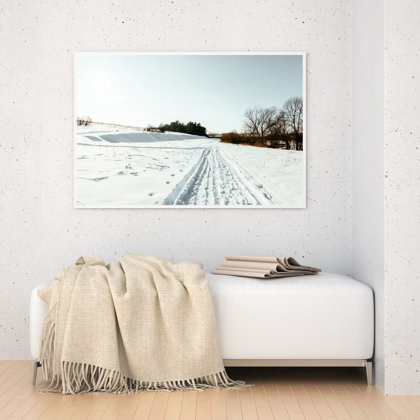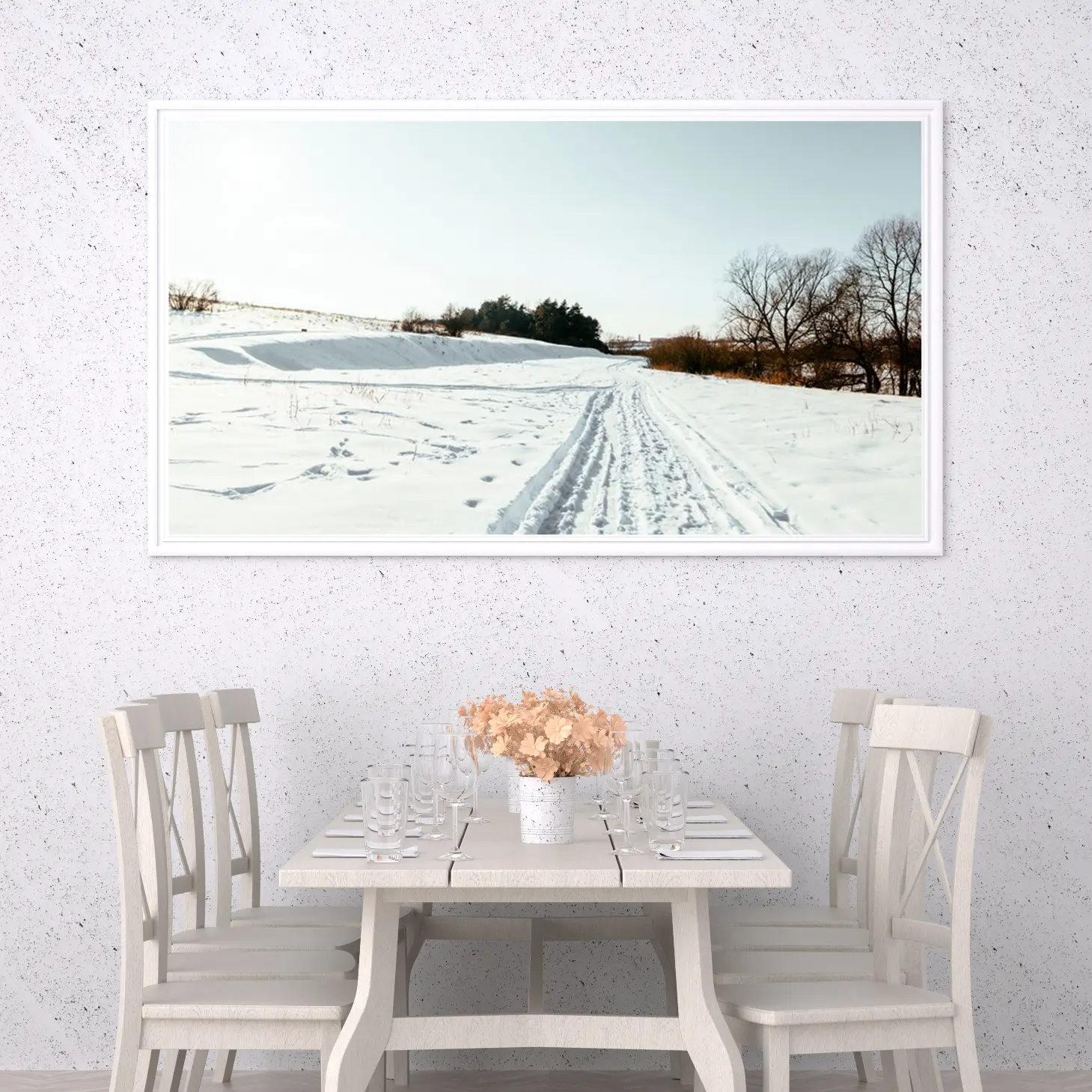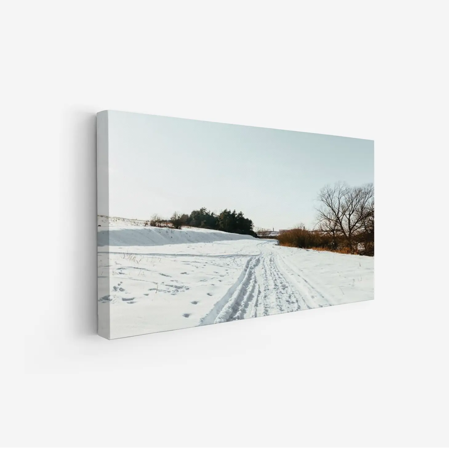 تتجلى في هذه اللوحة جماليات الطبيعة الخلابة، حيث يلتقي البياض الناصع للثلوج مع زرقة السماء الهادئة، مما يخلق إحساسًا بالسكينة والهدوء. تعكس المشاهد الطبيعية المرسومة هنا روح الشتاء، حيث تمتد المسارات المعبدة عبر الثلوج، مما يدعو الناظر إلى استكشاف ما وراء الأفق. إن هذه القطعة الفنية ليست مجرد ديكور جداري، بل هي نافذة إلى عالم من الصفاء والجمال، تضفي على المكان أجواءً من الراحة والسكينة، مما يجعلها خيارًا مثاليًا لمن يسعى لإضفاء لمسة من الأناقة على منزله.