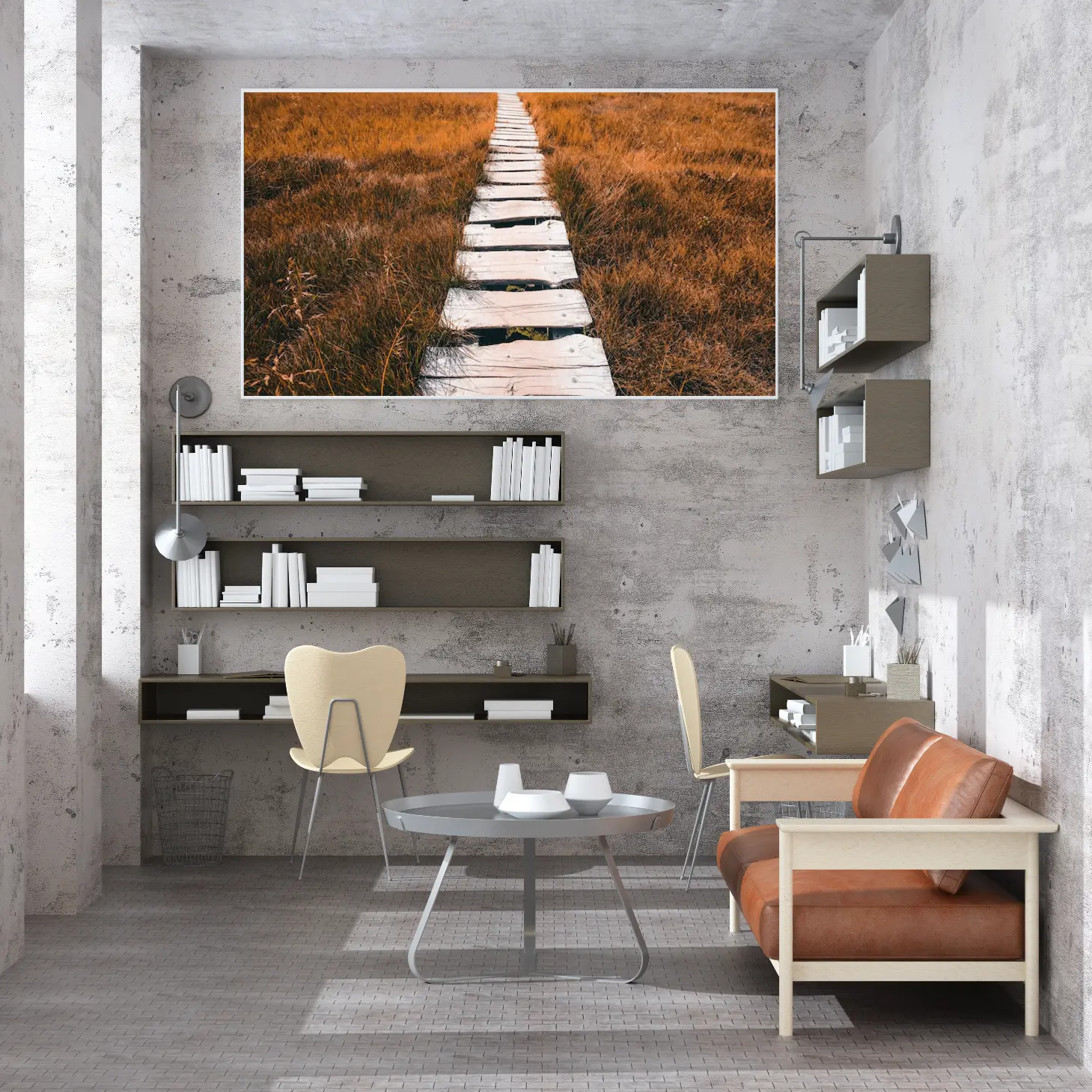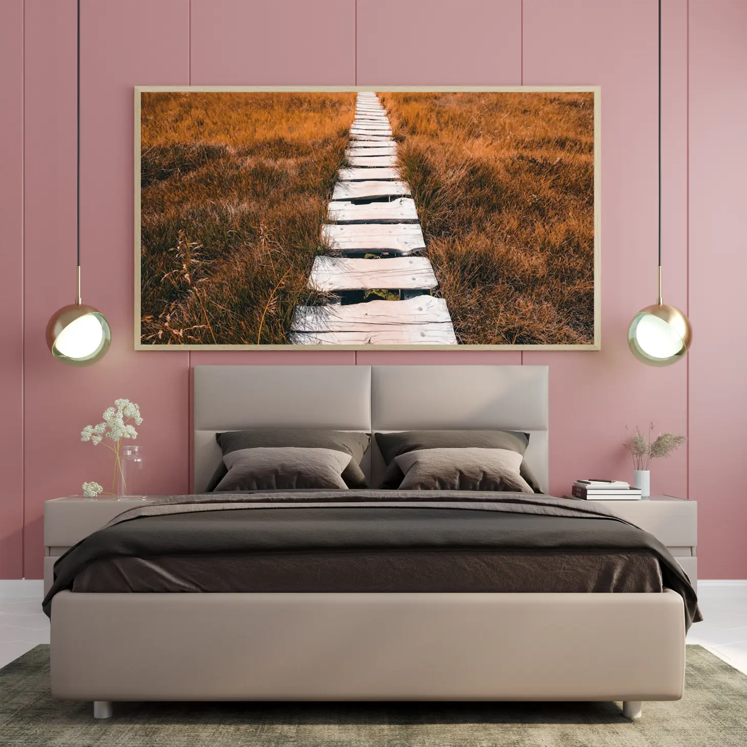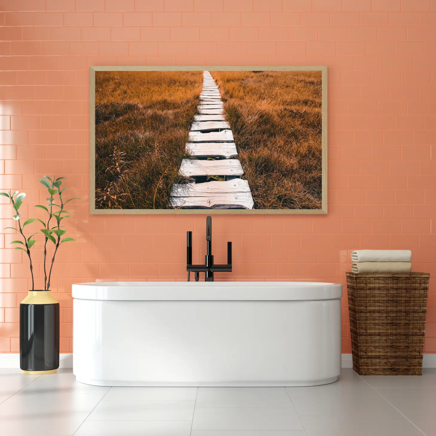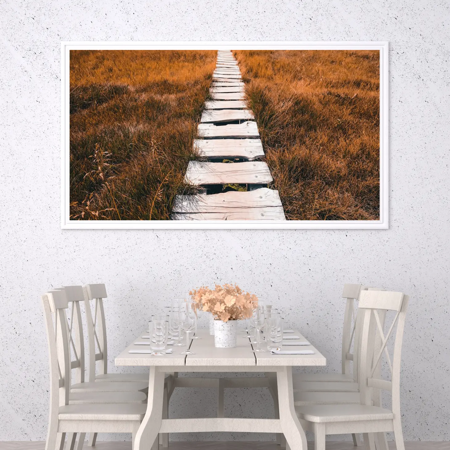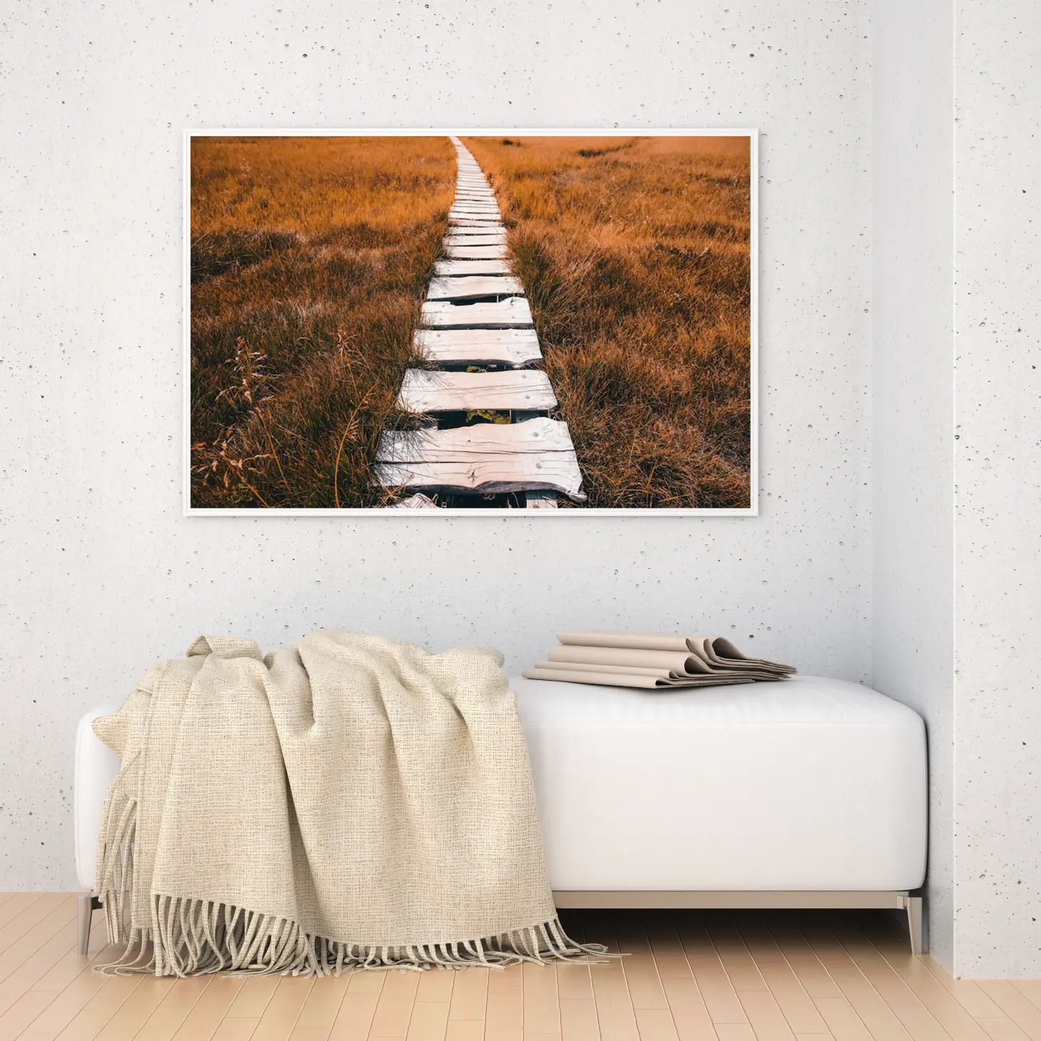 تتجلى في هذه اللوحة الفنية مسارات خشبية تمتد عبر حقل من الأعشاب الذهبية، مما يخلق إحساسًا بالهدوء والتواصل مع الطبيعة. تضفي الألوان الدافئة لمسة من السكينة على المكان، مما يجعلها خيارًا مثاليًا لإضفاء جو من الاسترخاء والراحة في أي مساحة. تبرز هذه القطعة كعنصر أساسي في الديكور المنزلي، حيث تعكس نمط حياة متوازن يجمع بين الجمال الطبيعي والأناقة العصرية.
