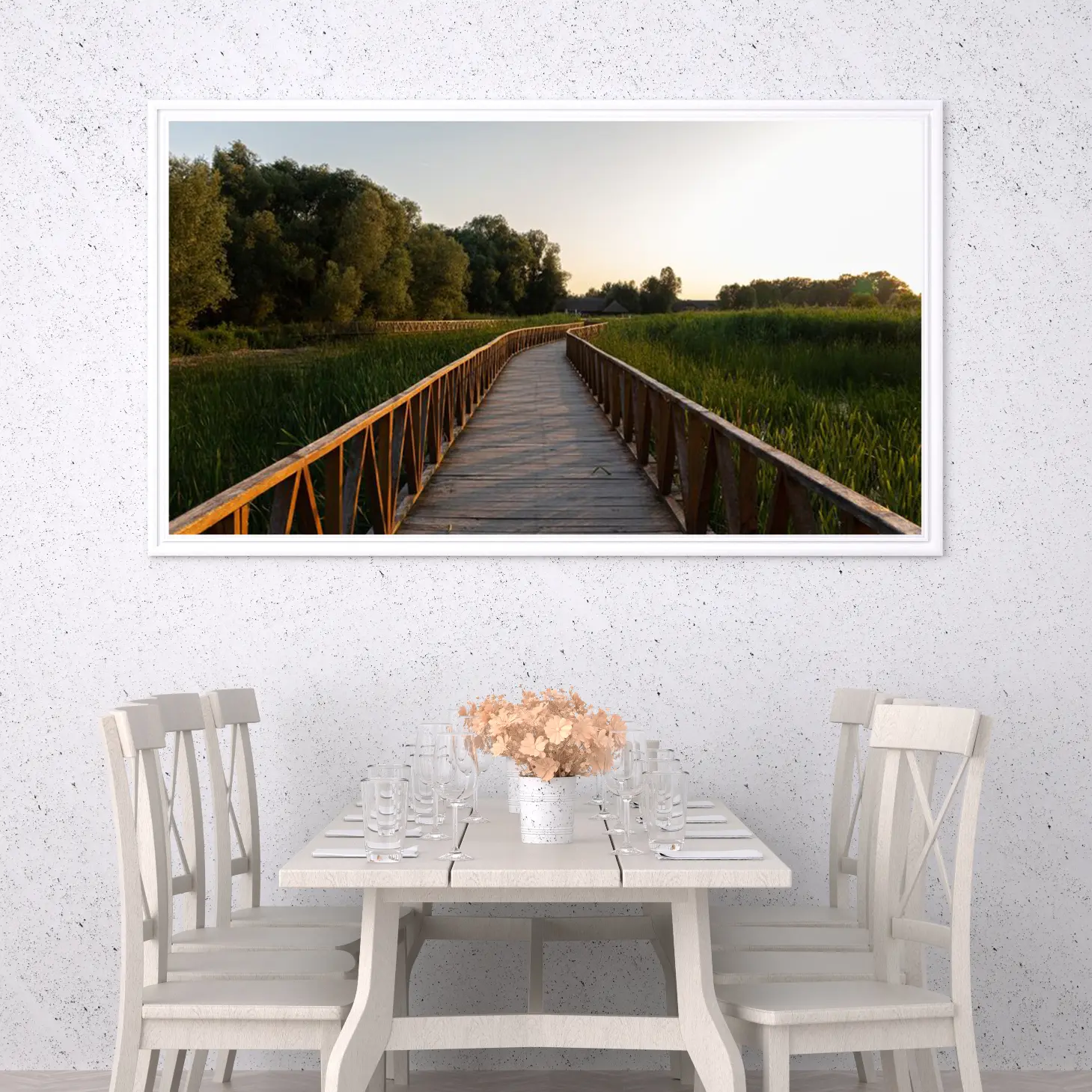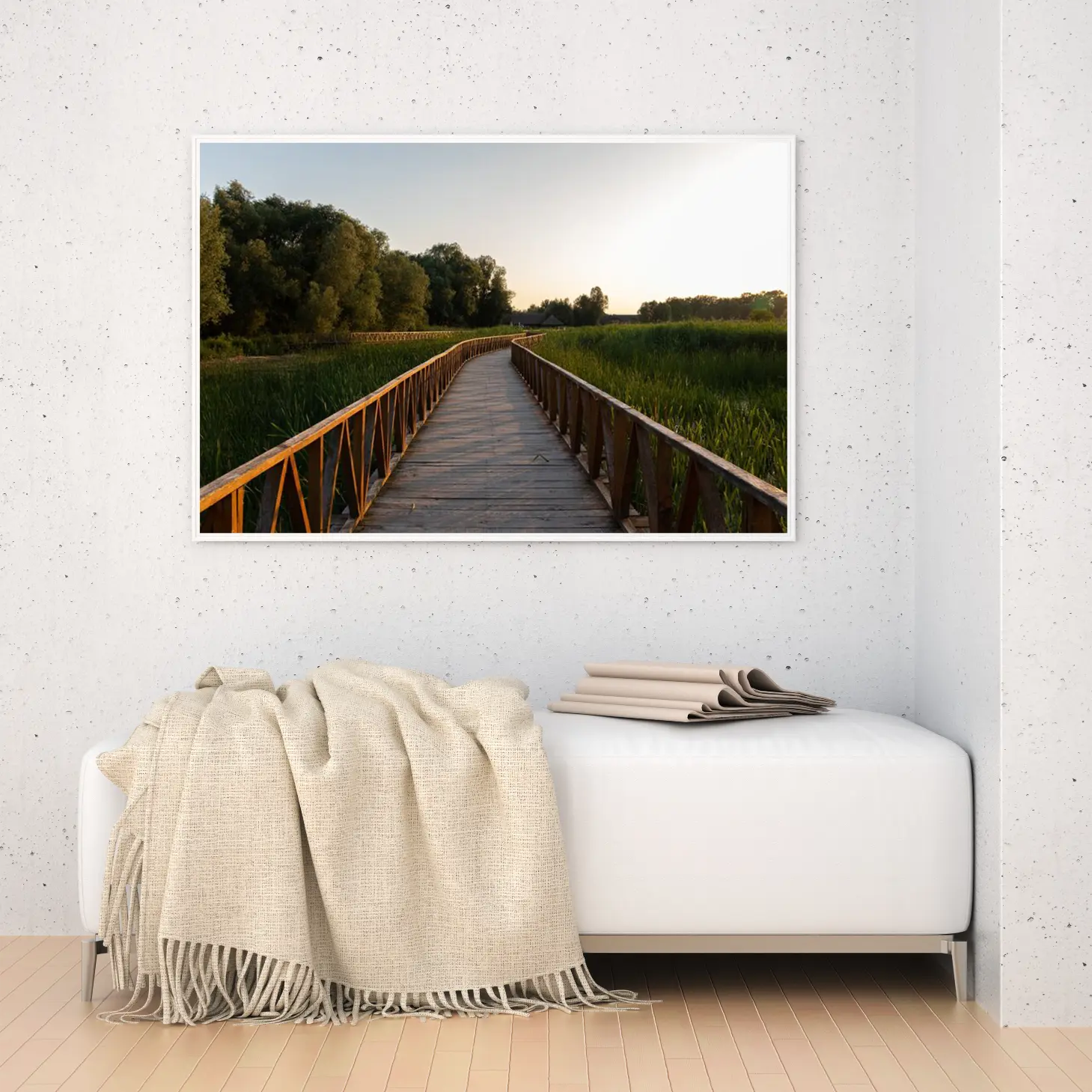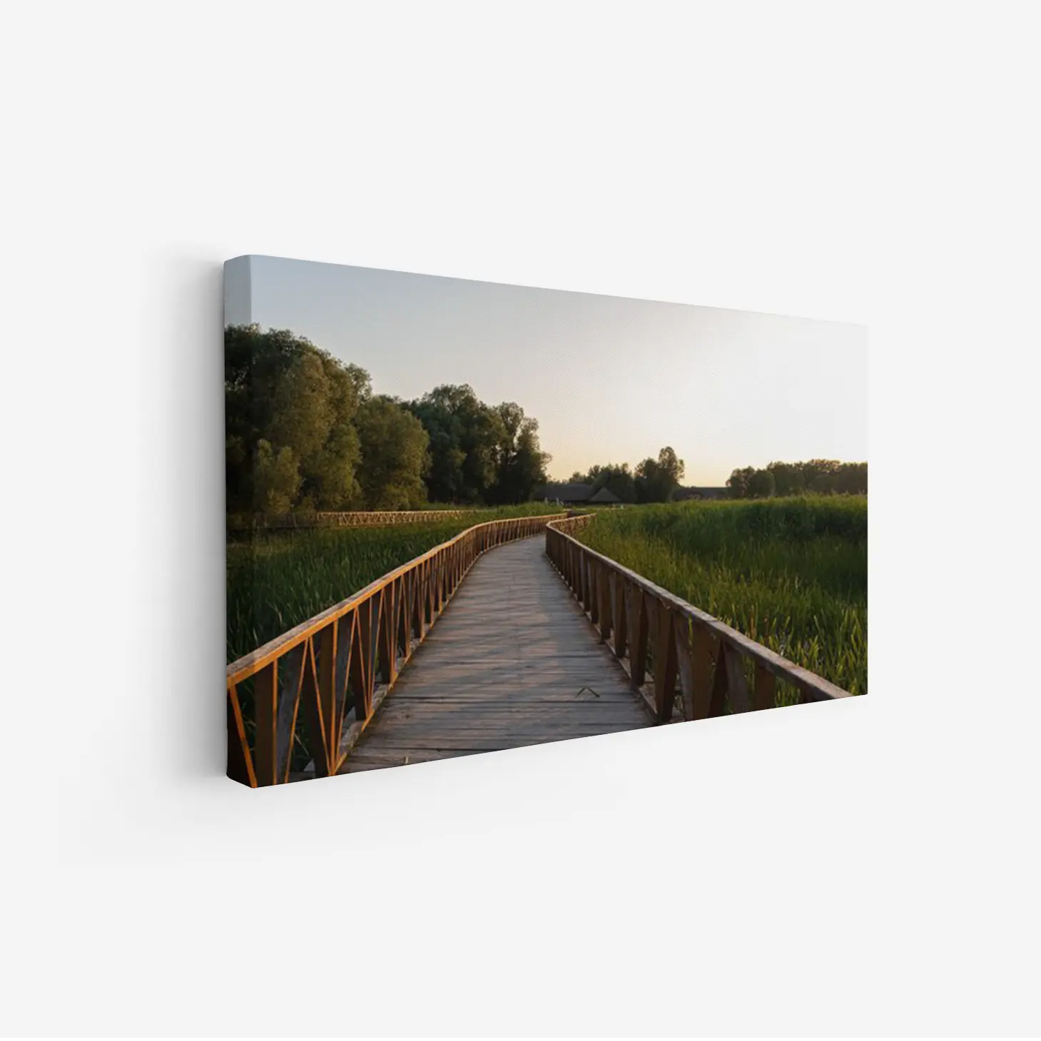 تتجلى في هذه اللوحة جماليات الطبيعة الخلابة، حيث يمتد الممر الخشبي بين أحضان المساحات الخضراء، محاطًا بأشجار كثيفة تعكس ألوانها الهادئة في ضوء الغروب. يخلق هذا المشهد إحساسًا بالسكينة والهدوء، مما يجعله خيارًا مثاليًا لإضفاء لمسة من الجمال الطبيعي على أي مساحة. إن وجود هذه القطعة الفنية في منزلك أو مكتبك سيعزز من أجواء المكان، ويعكس نمط حياة متوازن ومتناغم.