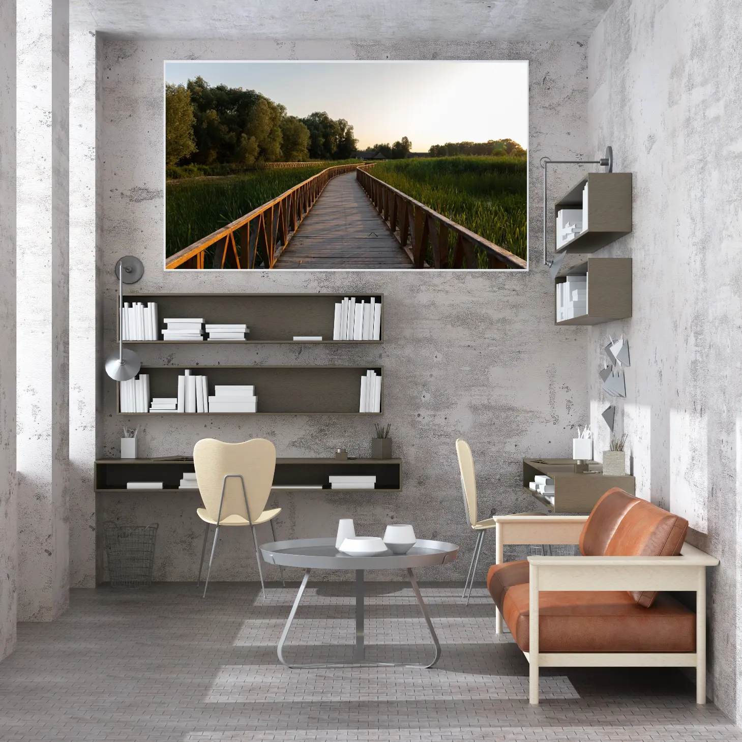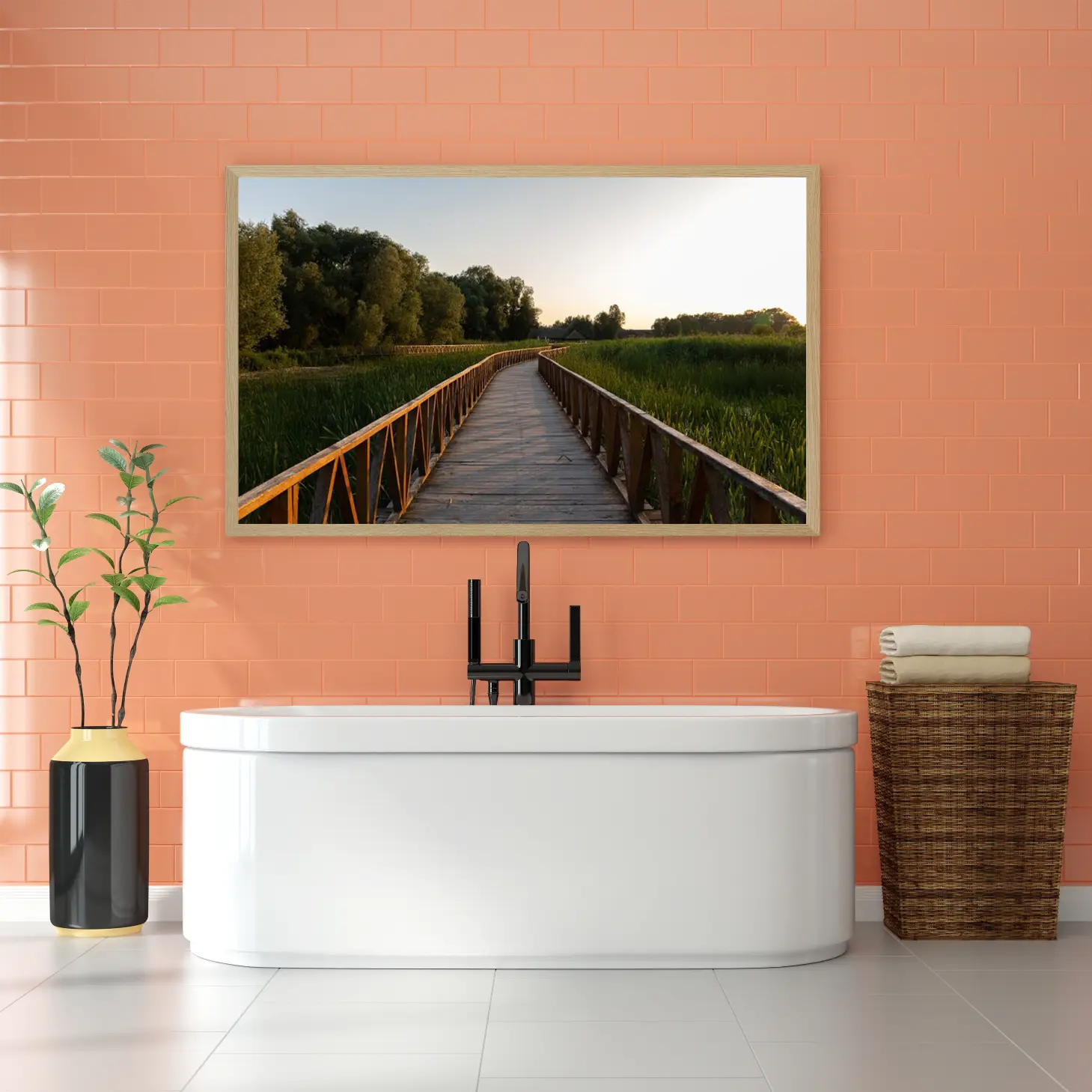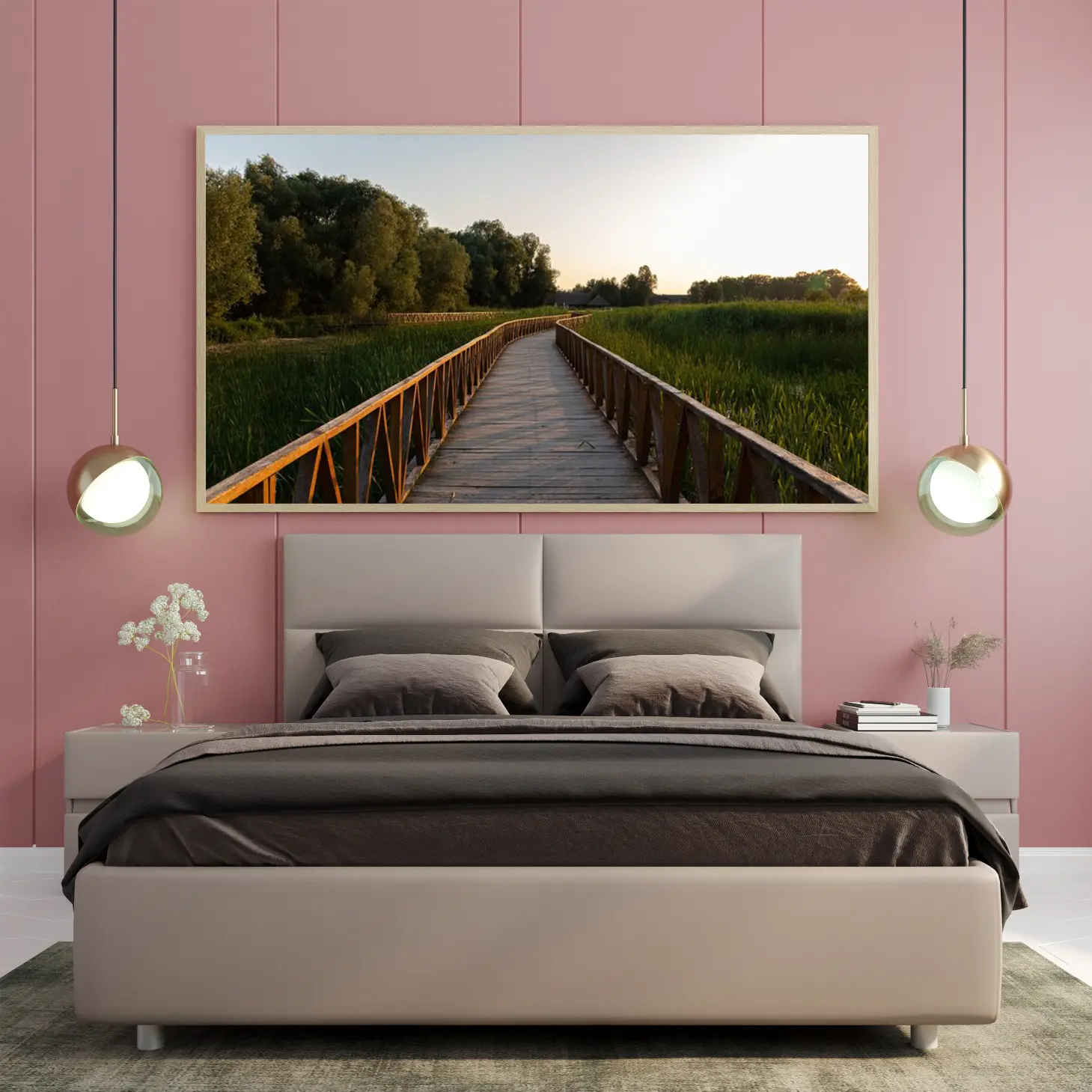 تتجلى في هذه اللوحة جماليات الطبيعة الخلابة، حيث يمتد الممر الخشبي بين أحضان المساحات الخضراء، محاطًا بأشجار كثيفة تعكس ألوانها الهادئة في ضوء الغروب. يخلق هذا المشهد إحساسًا بالسكينة والهدوء، مما يجعله خيارًا مثاليًا لإضفاء لمسة من الجمال الطبيعي على أي مساحة. إن وجود هذه القطعة الفنية في منزلك أو مكتبك سيعزز من أجواء المكان، ويعكس نمط حياة متوازن ومتناغم.