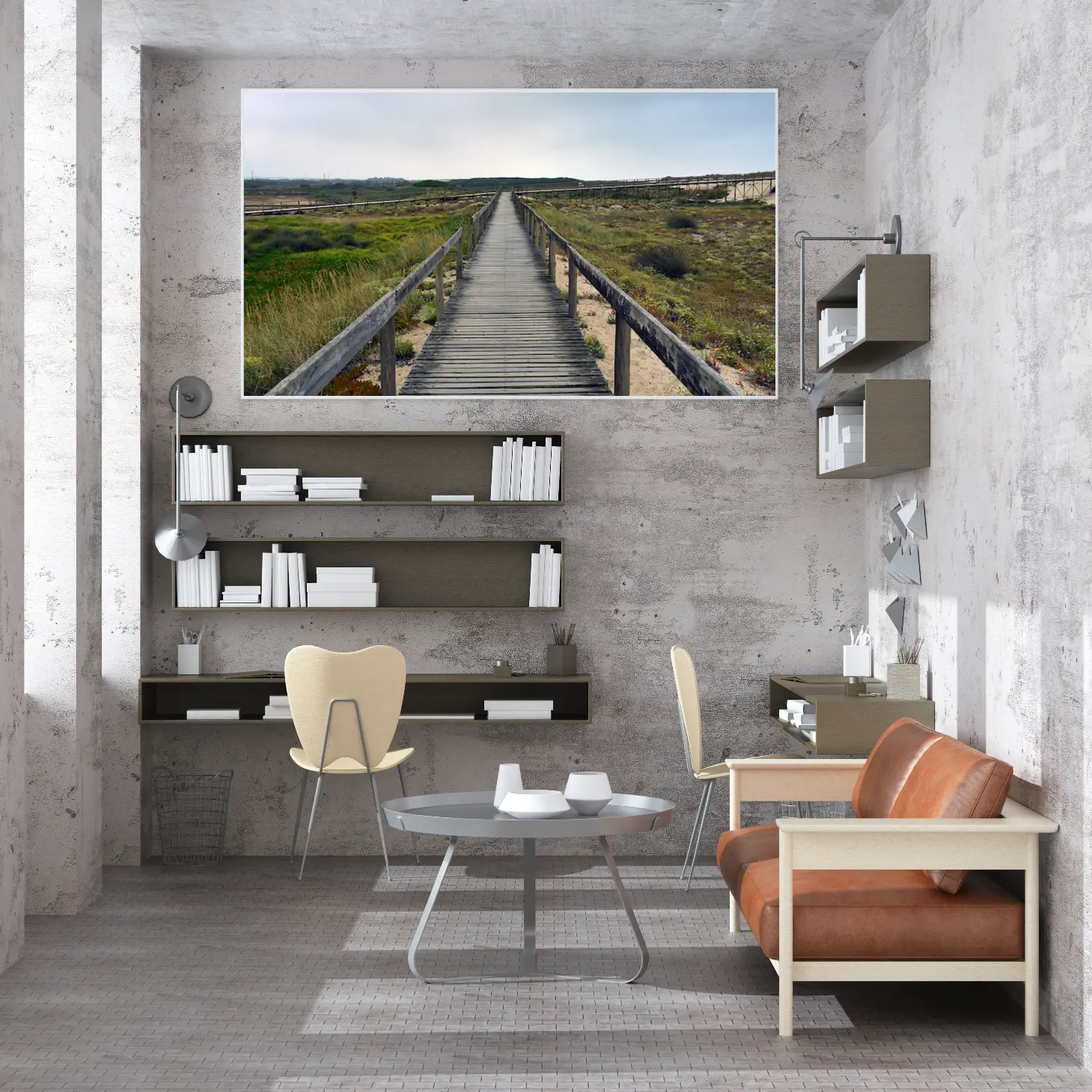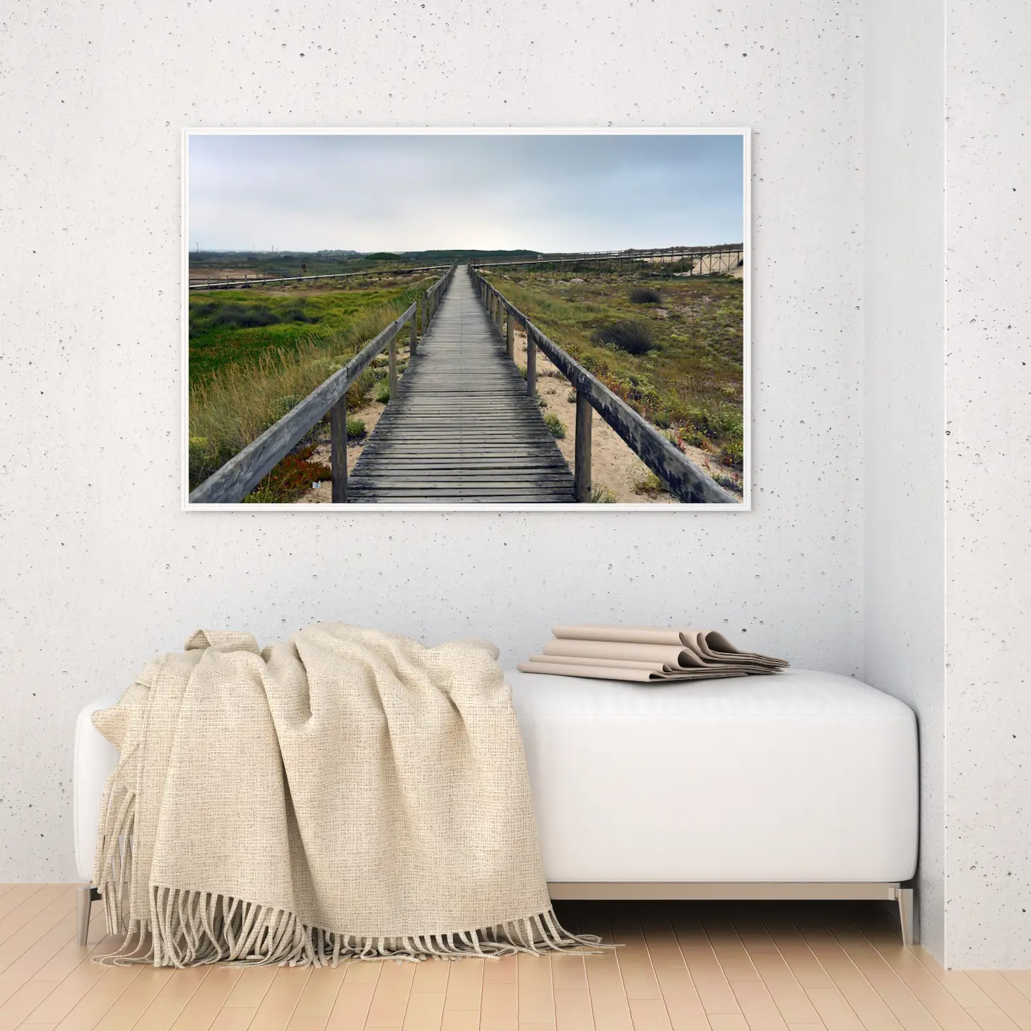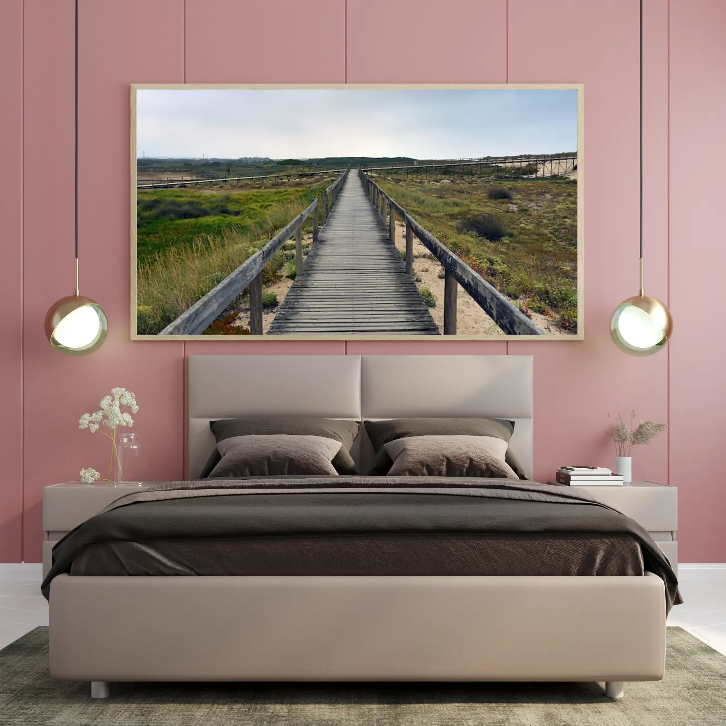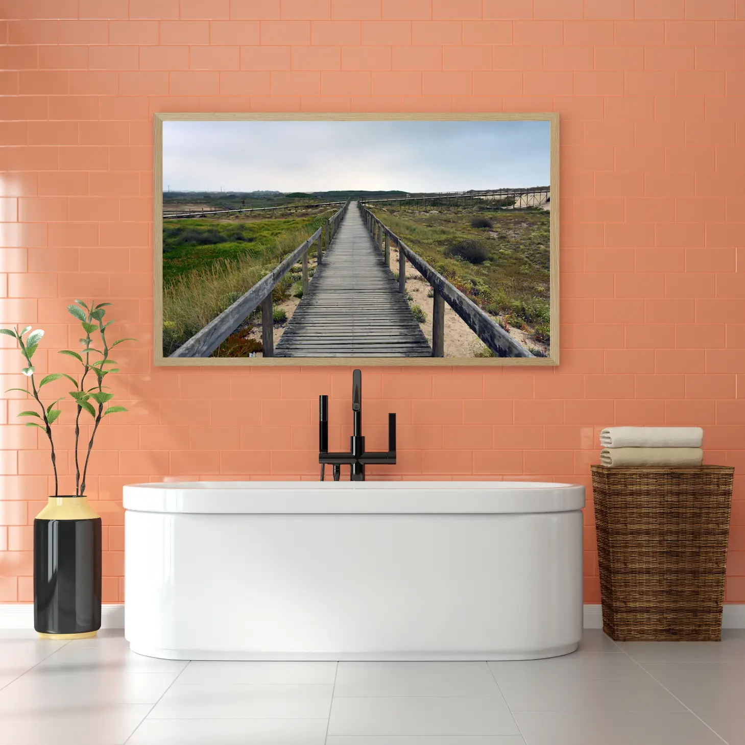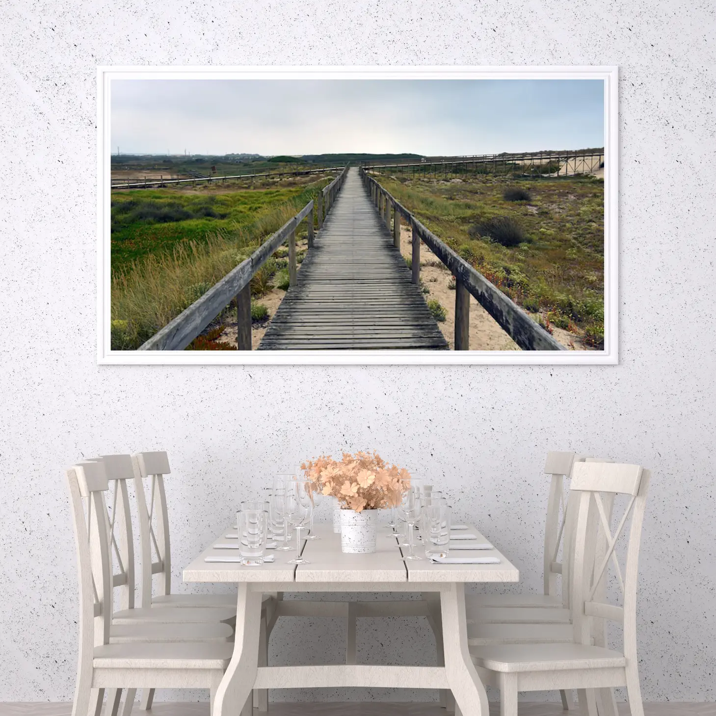 تتجلى في هذه اللوحة مشهد طبيعي يأخذ الأنفاس، حيث يمتد الممر الخشبي بين أحضان الطبيعة الخلابة، محاطًا بالأعشاب الخضراء والنباتات المتنوعة. يبعث هذا المشهد شعورًا بالهدوء والسكينة، مما يجعله خيارًا مثاليًا لإضفاء لمسة من الجمال الطبيعي على أي مساحة. إن تأثير هذه اللوحة على أجواء المكان لا يقتصر على الجمال البصري فحسب، بل يمتد ليعكس نمط حياة متوازن ومتناغم مع الطبيعة.