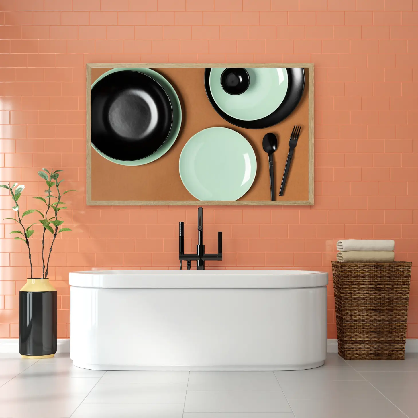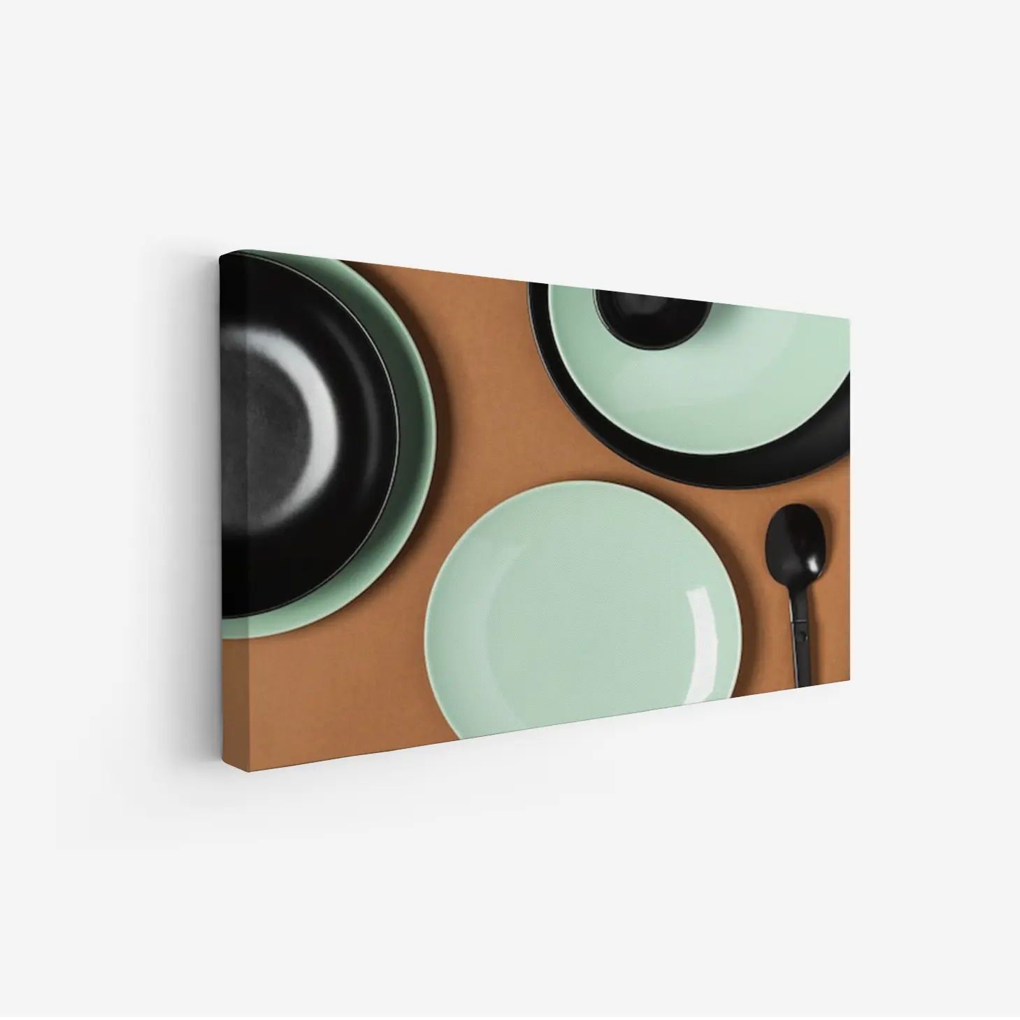 تتجلى في هذه اللوحة الفنية رؤية فريدة تعكس تناغم الألوان والأشكال، حيث تتوزع الأطباق بألوانها المتباينة بين الأسود والأخضر الفاتح على خلفية دافئة من اللون البني. يخلق هذا التوزيع البصري إحساسًا بالهدوء والترتيب، مما يجعلها إضافة مثالية لأي مساحة. إن تأثير هذه القطعة الفنية على أجواء المكان لا يقتصر فقط على الجمال، بل يمتد ليعكس نمط حياة متوازن ومتناغم، مما يجعلها خيارًا مثاليًا لمن يسعى لإضفاء لمسة من الأناقة على منزله.