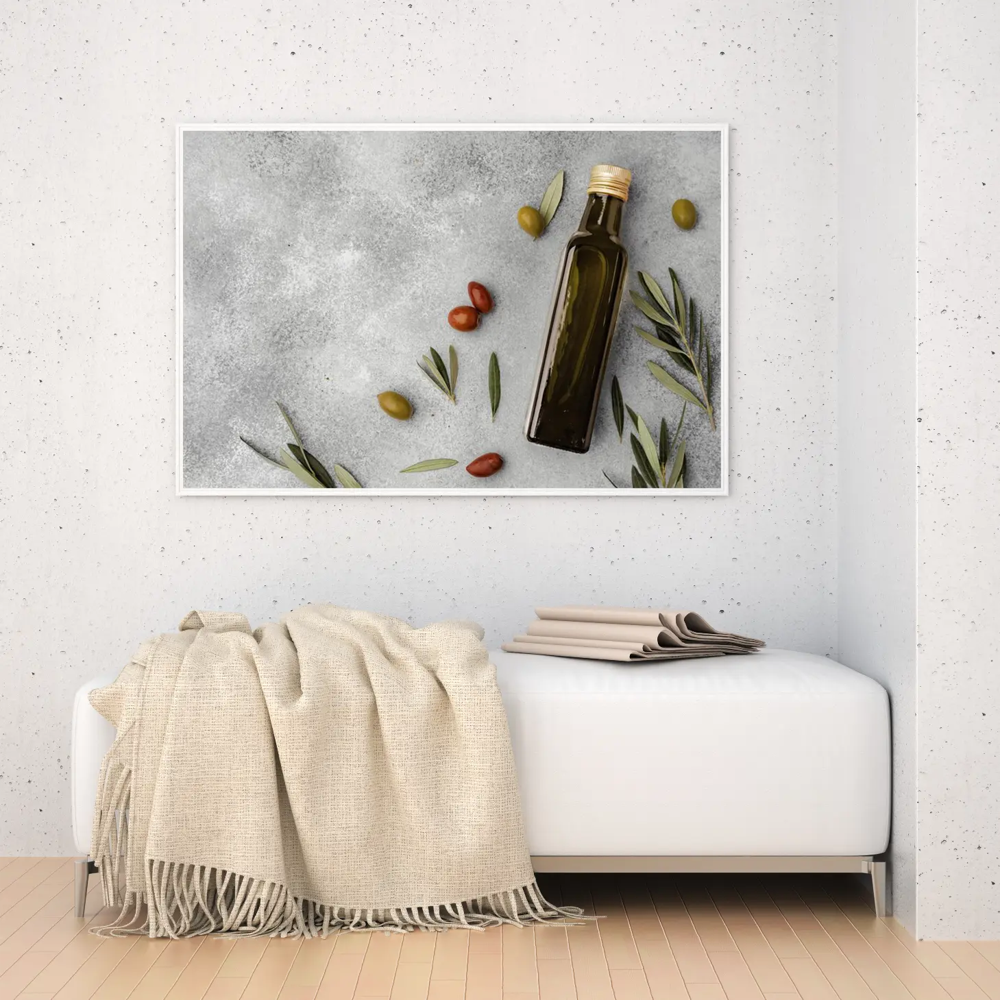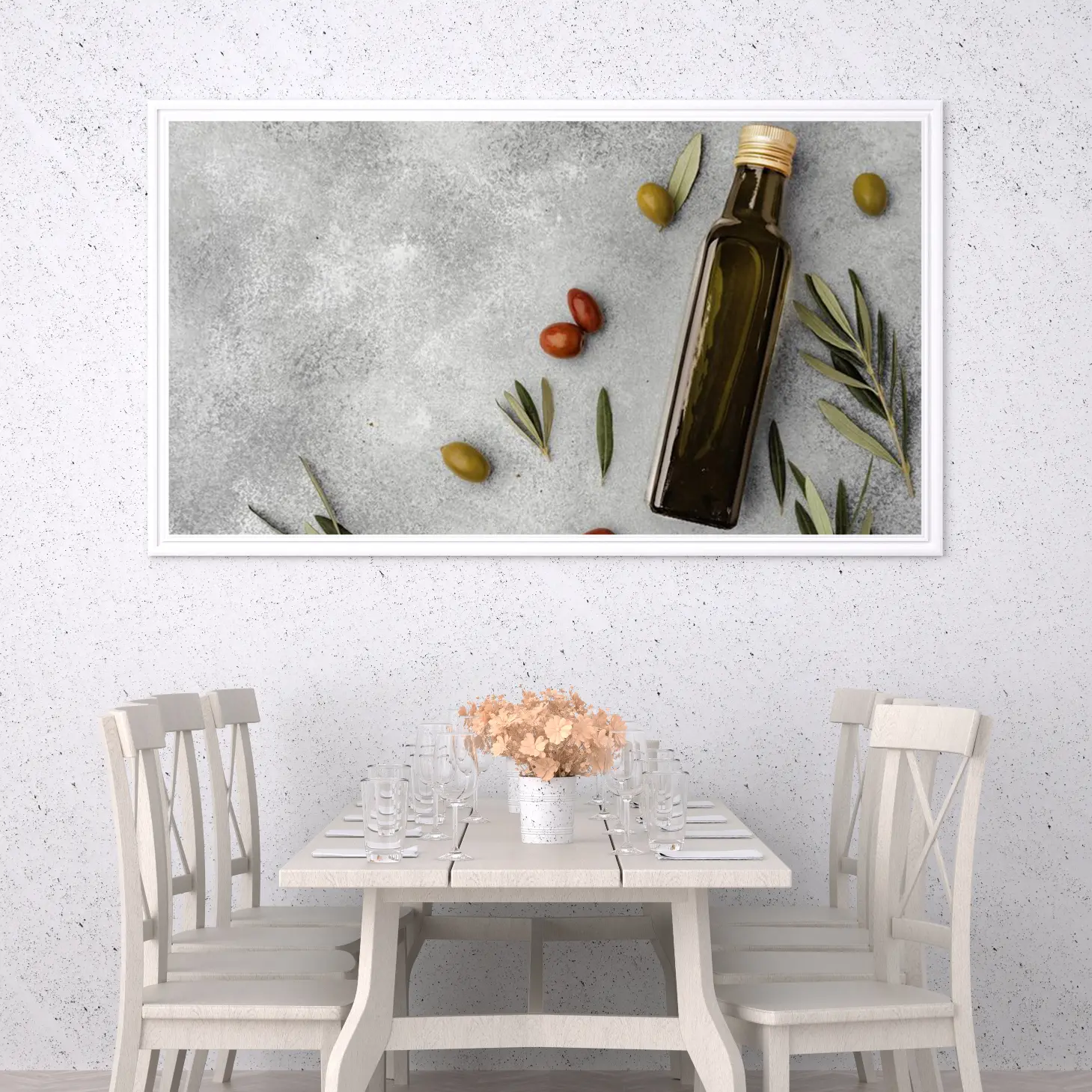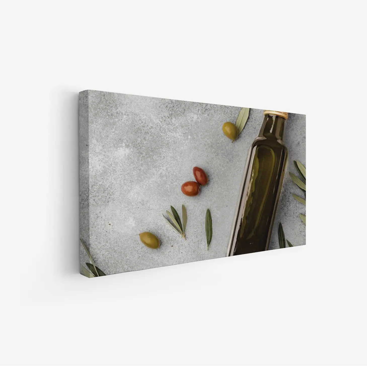 تتجلى في هذه اللوحة الفنية لمسة من الأناقة العصرية، حيث تتناغم الألوان الطبيعية مع الخلفية الرمادية الهادئة. تعكس الصورة مشهدًا مفعمًا بالحياة، حيث تتواجد زجاجة زيت الزيتون بجانب حبات الزيتون والطماطم، مما يضفي إحساسًا بالدفء والراحة. هذا العمل الفني ليس مجرد ديكور جداري، بل هو تعبير عن نمط حياة صحي ومتناغم، يجذب الأنظار ويعزز من أجواء المكان.
