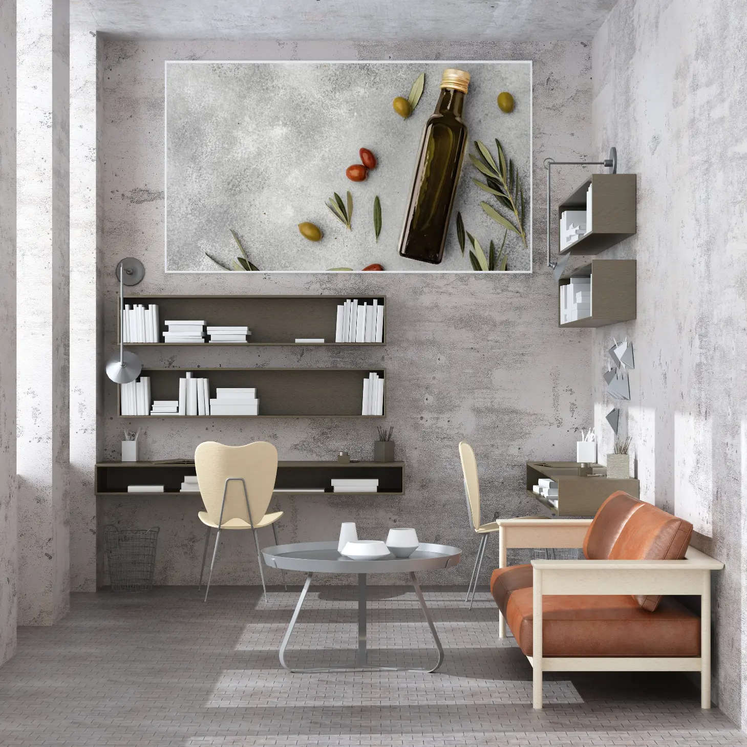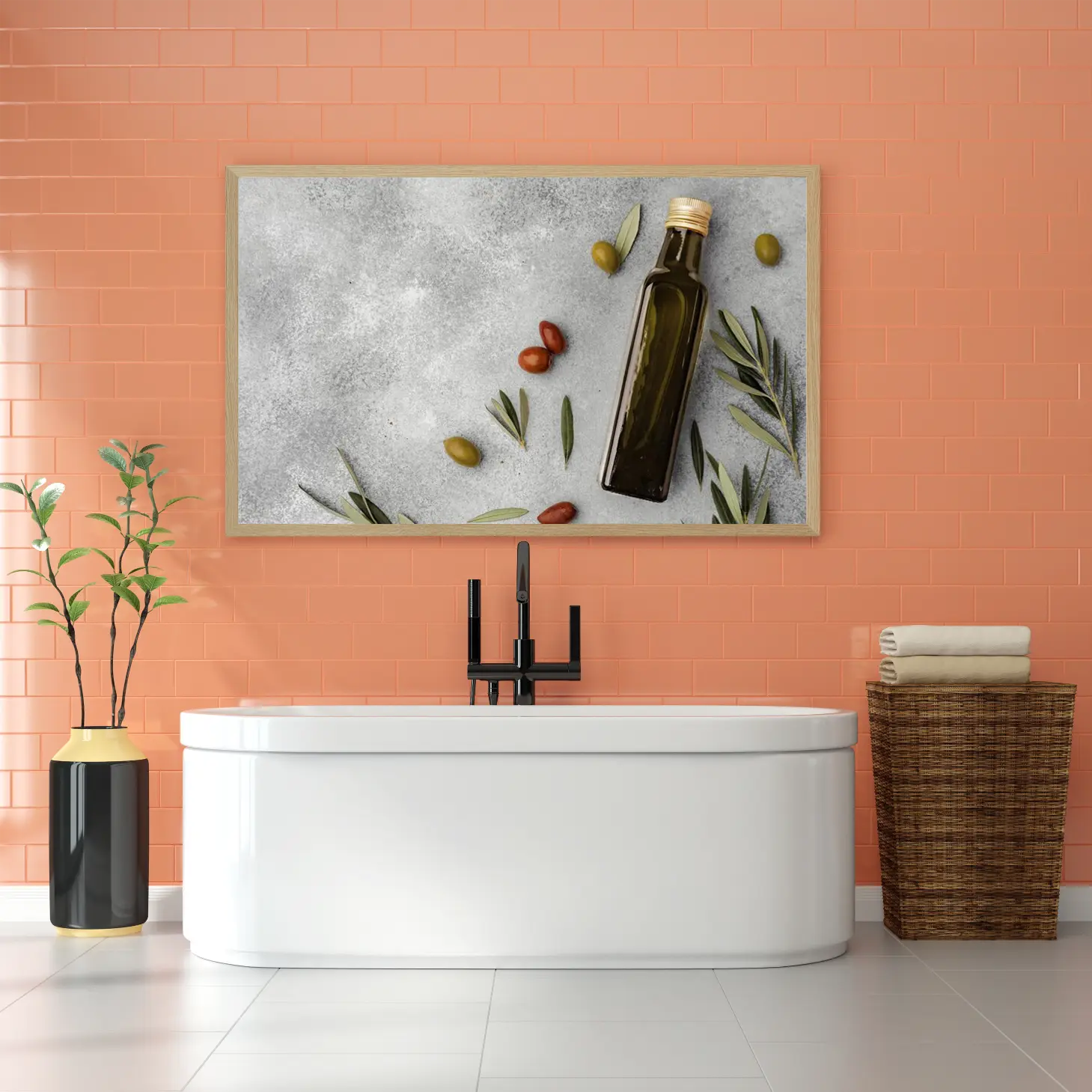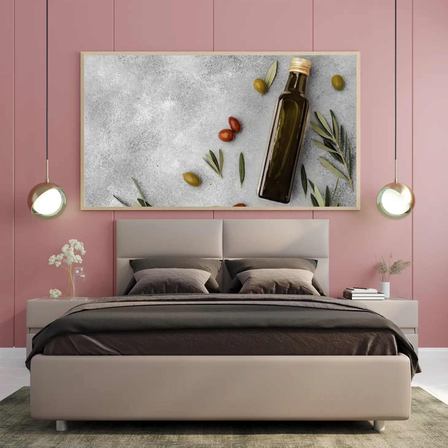 تتجلى في هذه اللوحة الفنية لمسة من الأناقة العصرية، حيث تتناغم الألوان الطبيعية مع الخلفية الرمادية الهادئة. تعكس الصورة مشهدًا مفعمًا بالحياة، حيث تتواجد زجاجة زيت الزيتون بجانب حبات الزيتون والطماطم، مما يضفي إحساسًا بالدفء والراحة. هذا العمل الفني ليس مجرد ديكور جداري، بل هو تعبير عن نمط حياة صحي ومتناغم، يجذب الأنظار ويعزز من أجواء المكان.