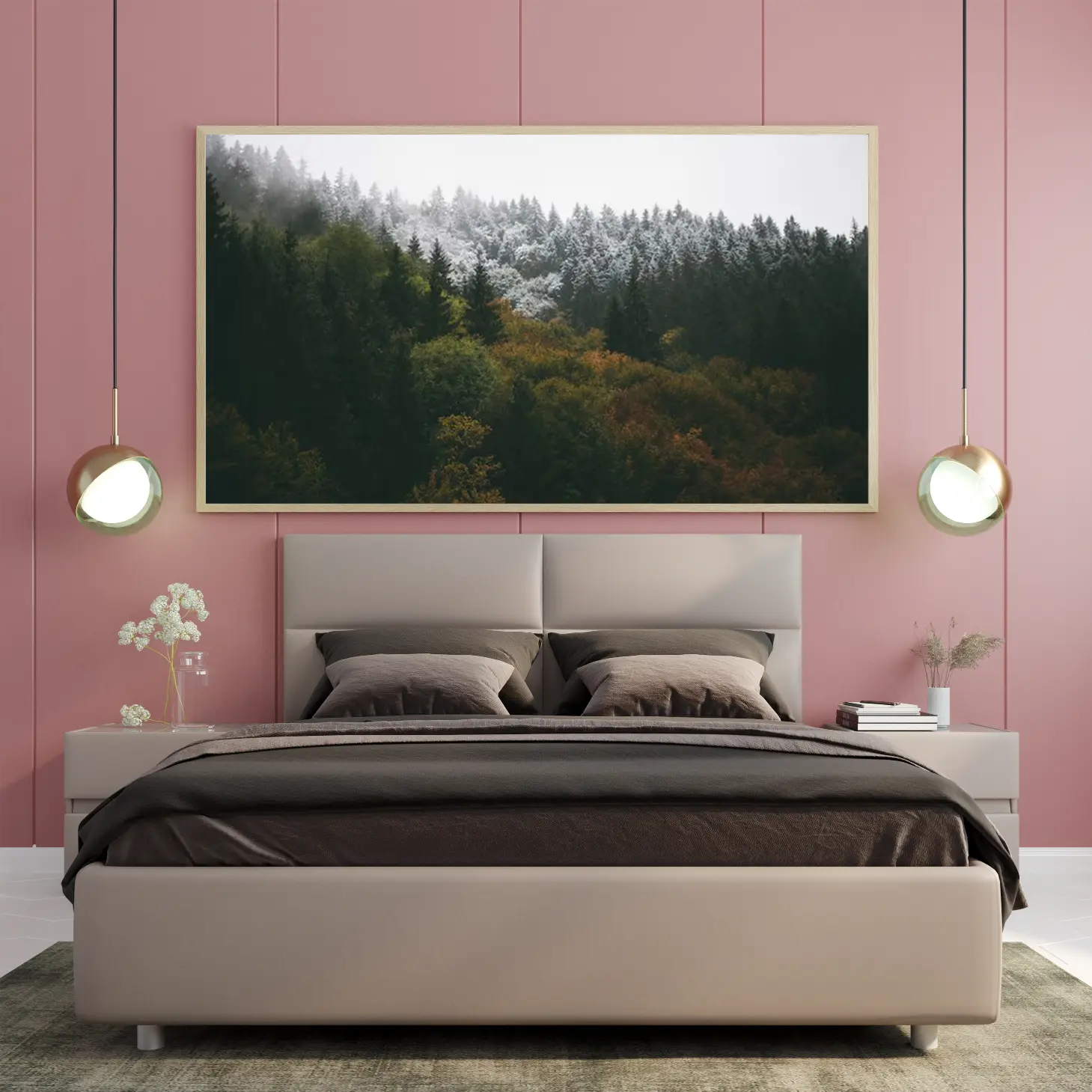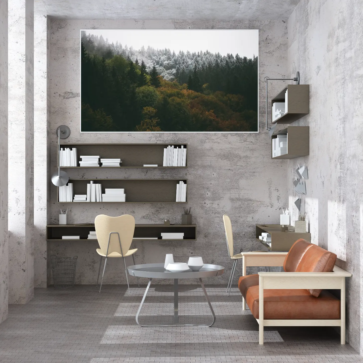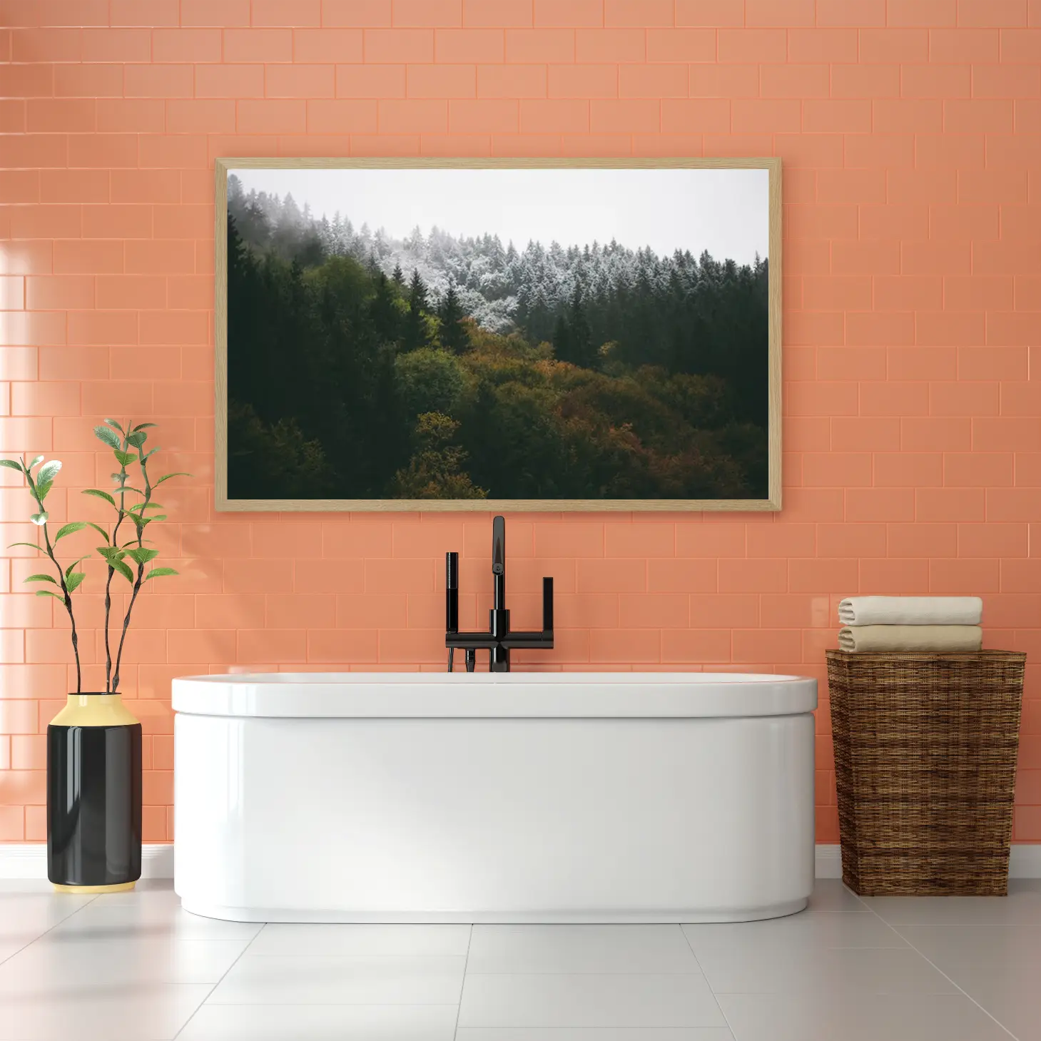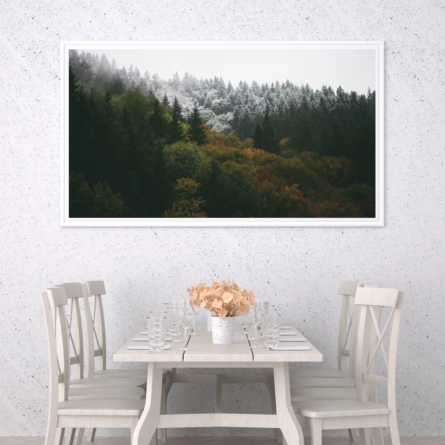 تتجلى في هذه اللوحة جماليات الطبيعة الخلابة، حيث تتناغم ألوان الغابات مع لمسات الثلج التي تغطي قمم الأشجار. تعكس الأجواء العامة شعورًا بالهدوء والسكينة، مما يجعلها خيارًا مثاليًا لإضفاء لمسة من السحر على أي مساحة. إن هذه القطعة الفنية ليست مجرد ديكور جداري، بل هي استثمار جمالي يعكس ذوقًا رفيعًا ويضفي توازنًا وأناقة على المكان.