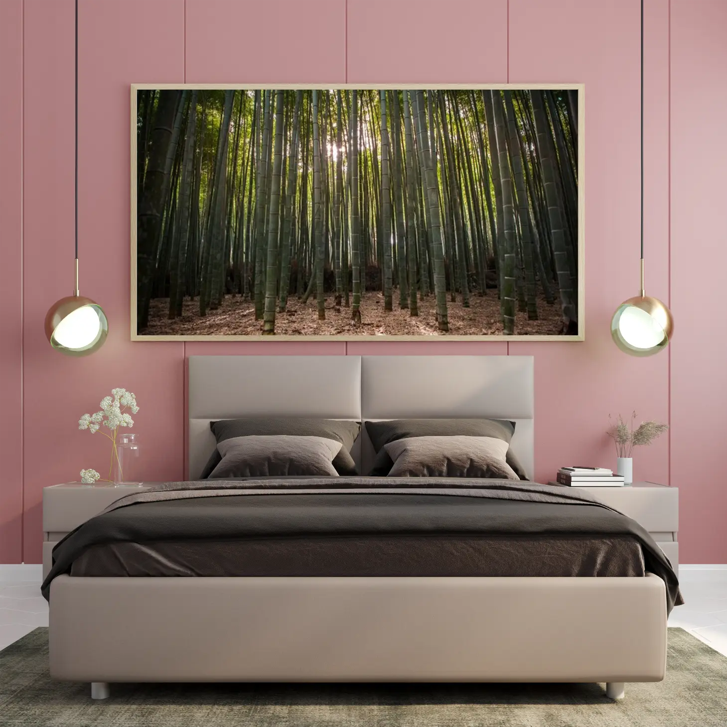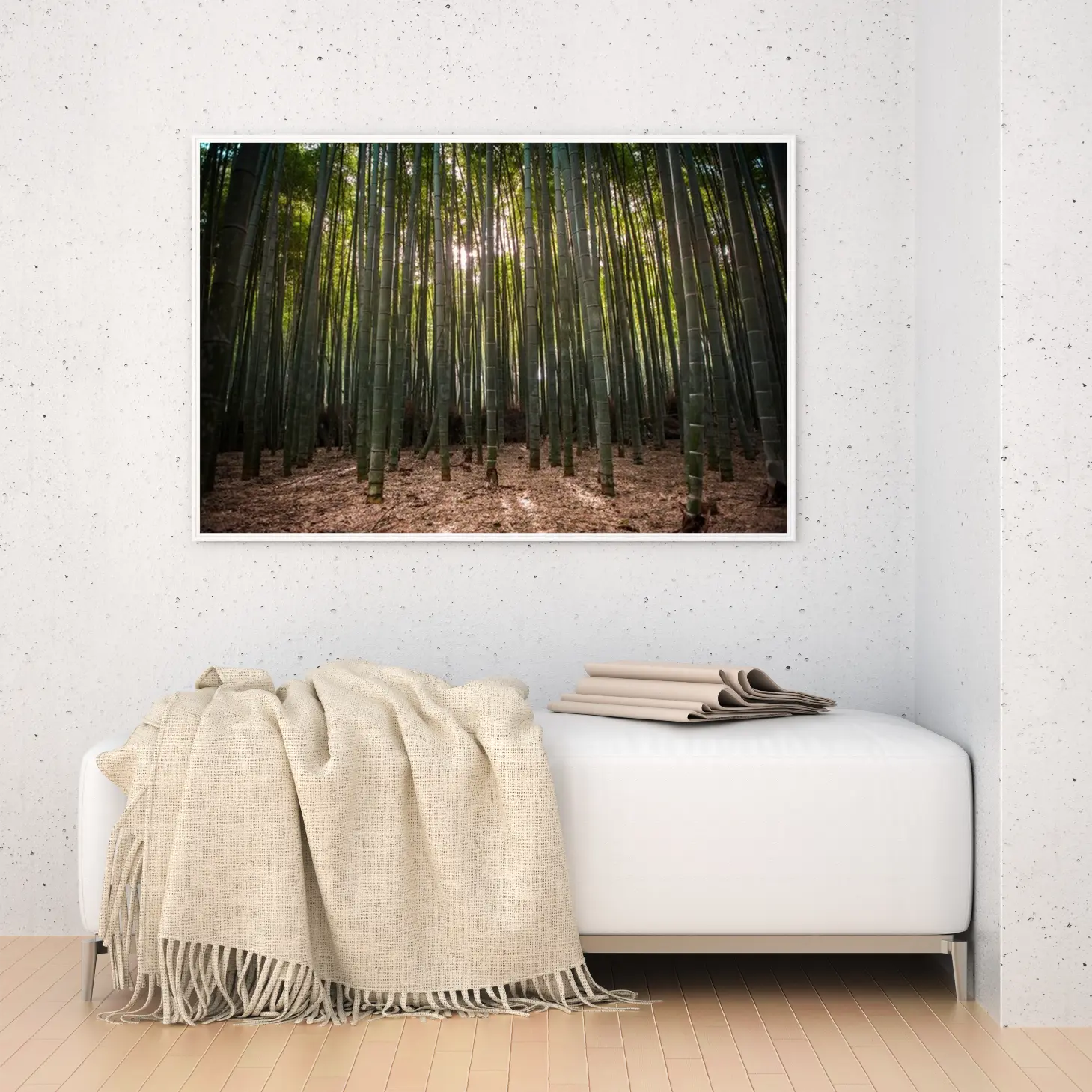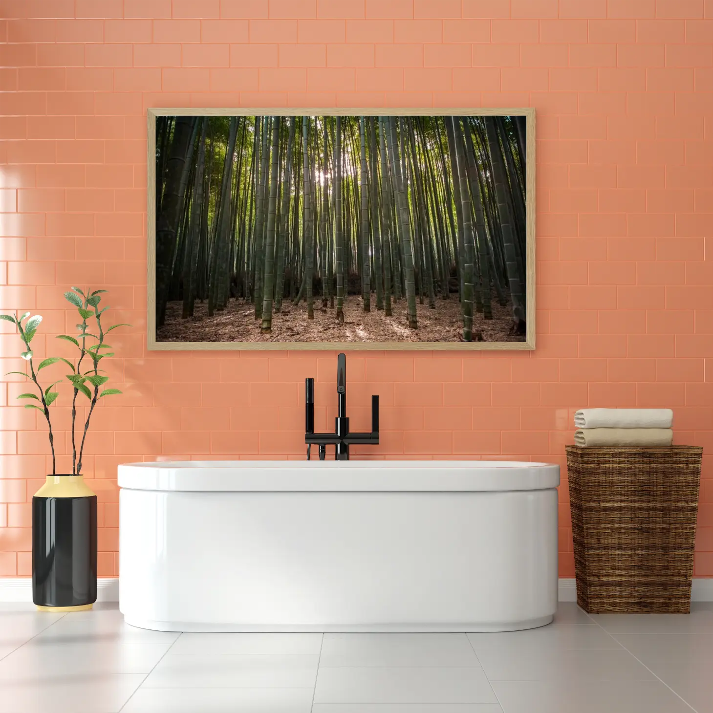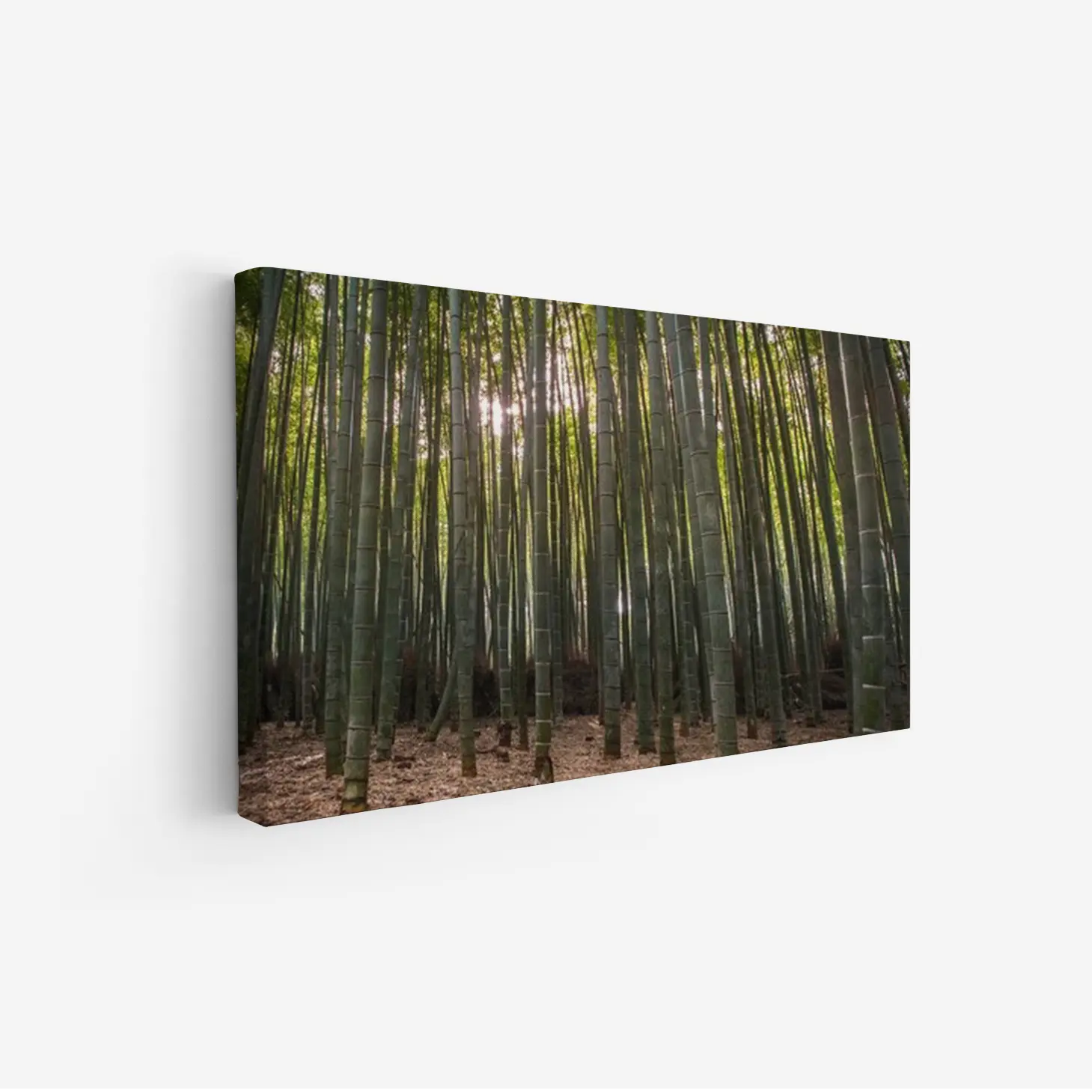 تجسد هذه اللوحة جمال الطبيعة في أبهى صوره، حيث تتناغم أعمدة الخيزران الخضراء في تنسيق رائع، مما يخلق إحساسًا بالهدوء والسكينة. تتسلل أشعة الشمس من بين الأوراق، مضفيةً لمسة سحرية على المشهد، مما يجعلها قطعة فنية تضفي أجواءً مريحة ومليئة بالحيوية على أي مساحة. إن وجود هذه اللوحة في منزلك أو مكتبك يعكس أسلوب حياة متوازن ومتناغم مع الطبيعة.