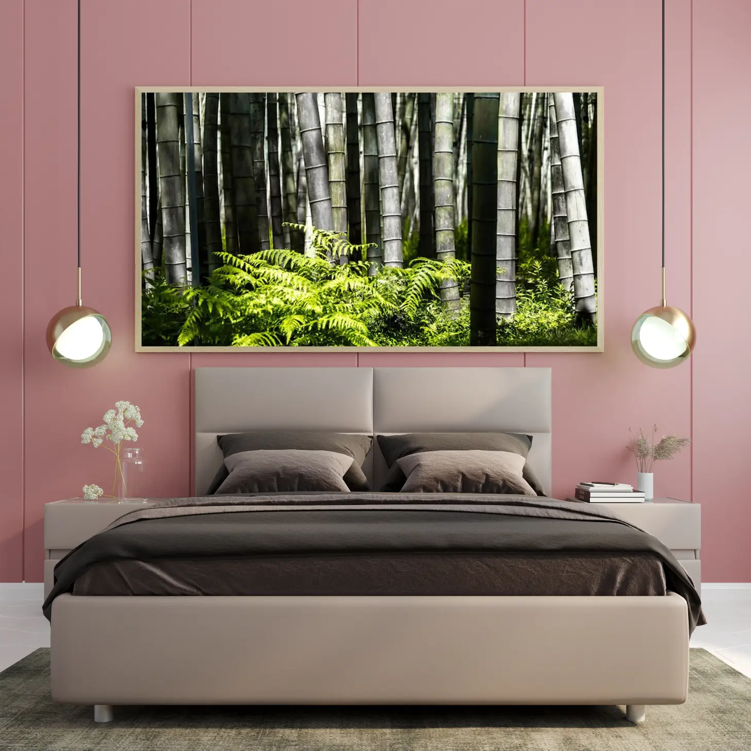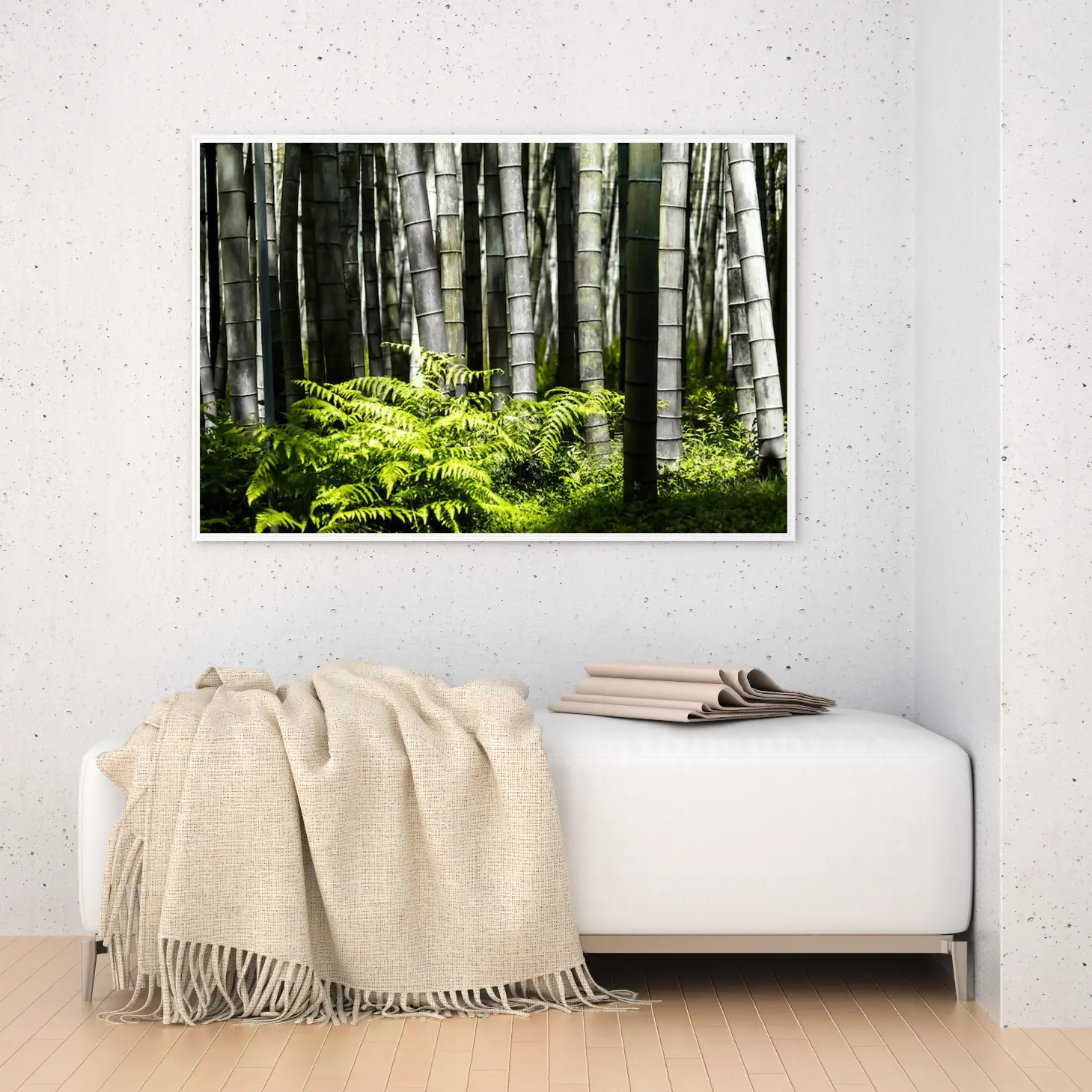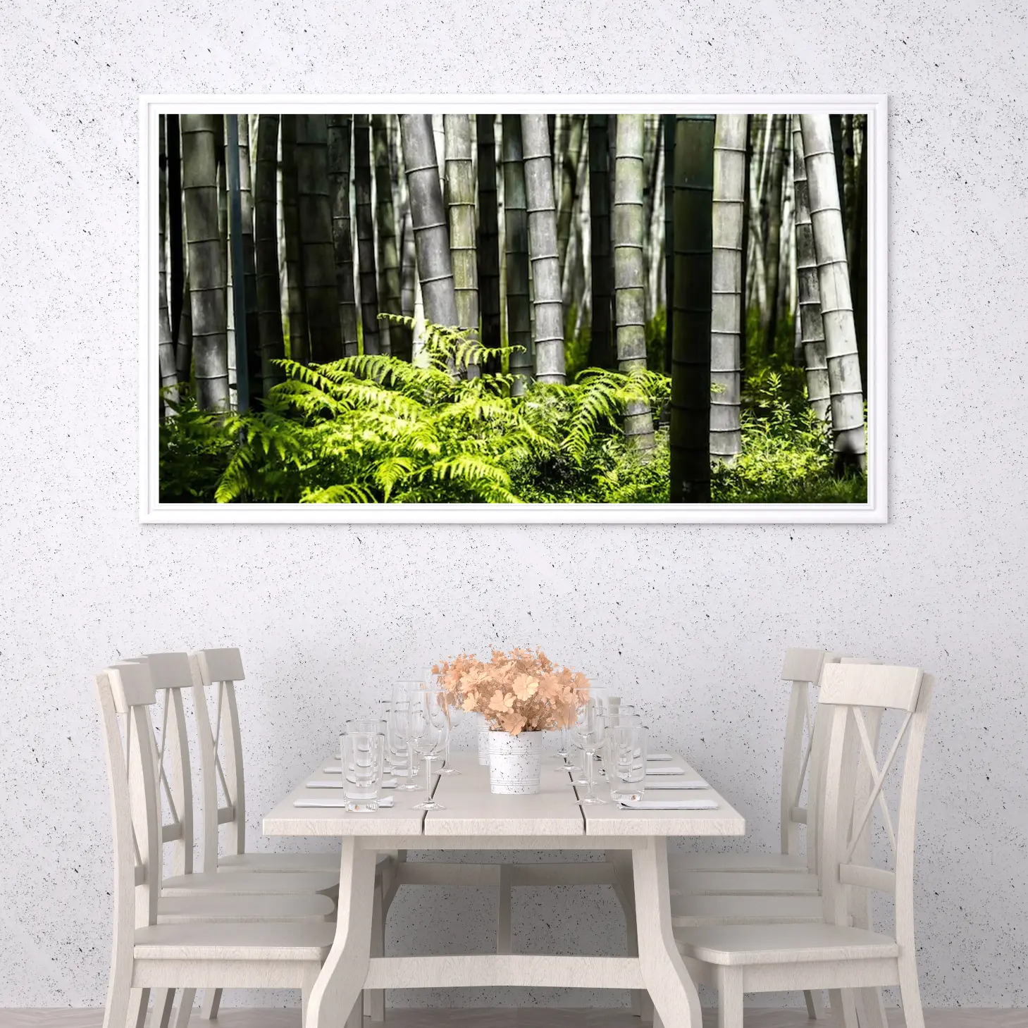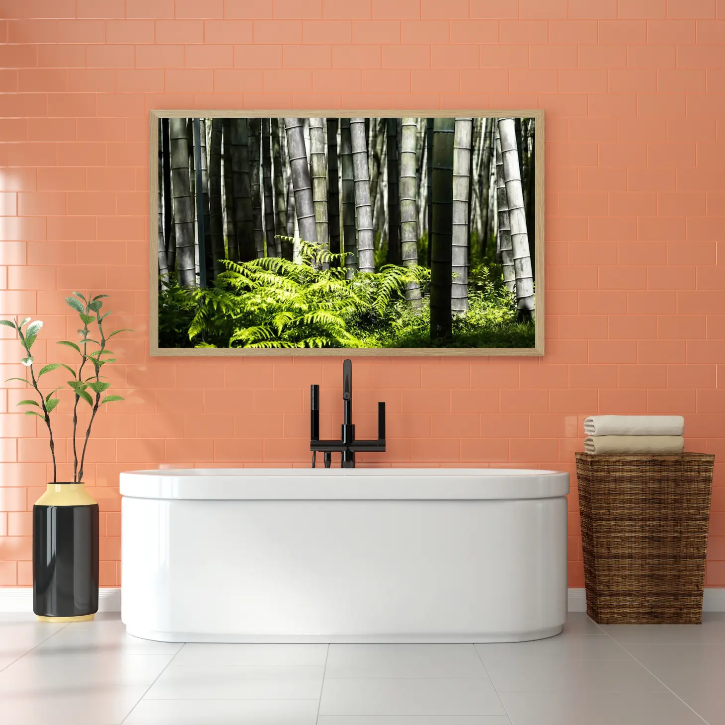 تجسد هذه اللوحة جمال الطبيعة الخلابة من خلال مشهد ساحر يتألف من أعمدة البامبو الخضراء التي ترتفع بفخر، محاطة بنباتات السرخس الزاهية. تعكس الألوان الهادئة والظلال المتناغمة إحساسًا بالسكينة والهدوء، مما يجعلها خيارًا مثاليًا لإضفاء لمسة من الانتعاش على أي مساحة. إن هذا العمل الفني لا يقتصر فقط على كونه قطعة ديكور جداري، بل هو استثمار جمالي يضيف توازنًا وأناقة إلى نمط الحياة.