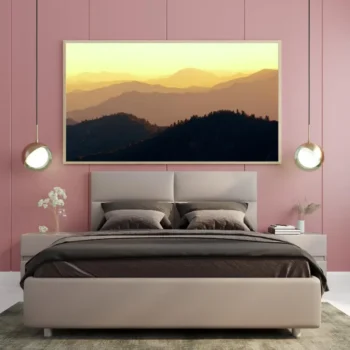 استمتع بجمال الطبيعة الخلاب مع هذه اللوحة الفنية التي تجسد تدرجات الألوان الدافئة في غروب الشمس. تضفي الأشكال الجبلية المتداخلة إحساسًا بالهدوء والسكينة، مما يجعلها إضافة مثالية لأي مساحة تبحث عن لمسة من الأناقة والراحة.