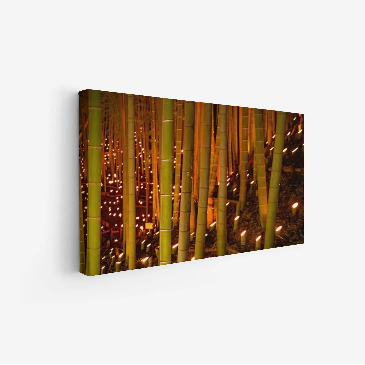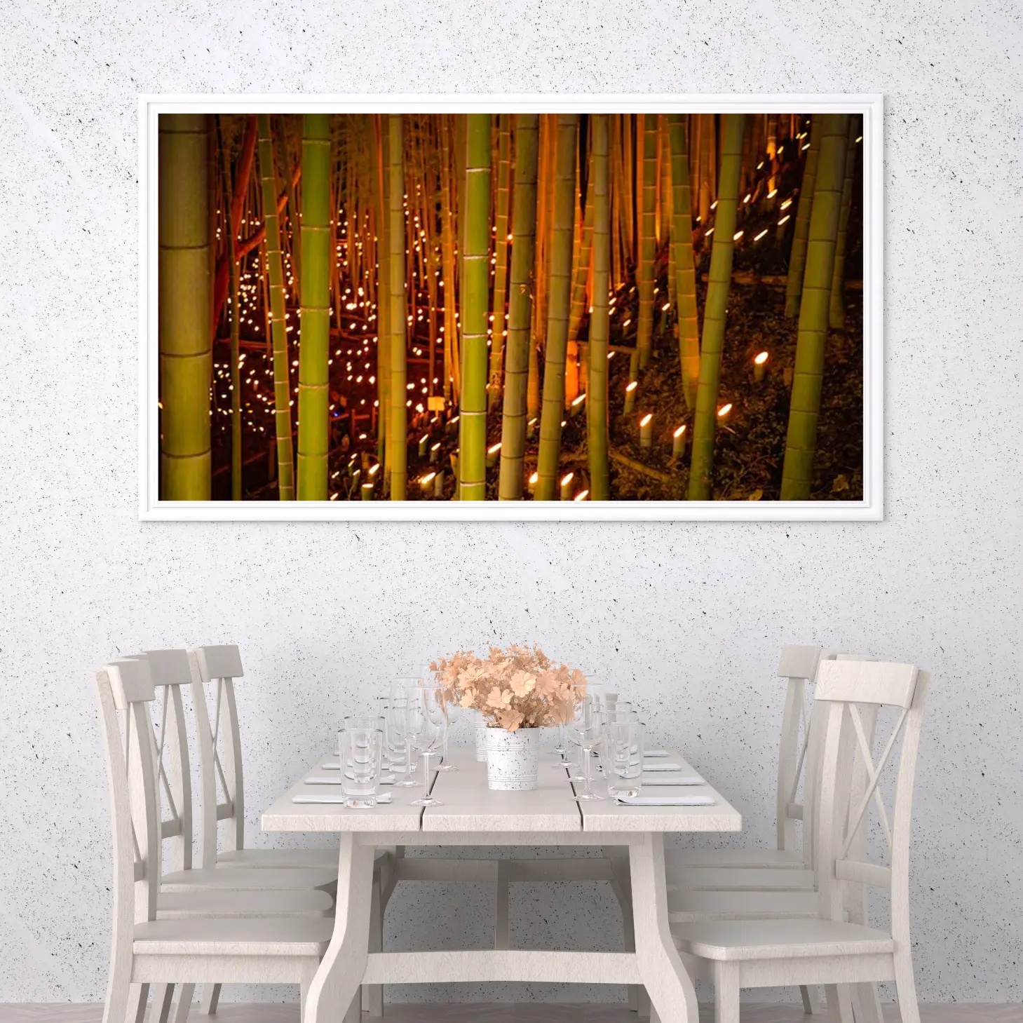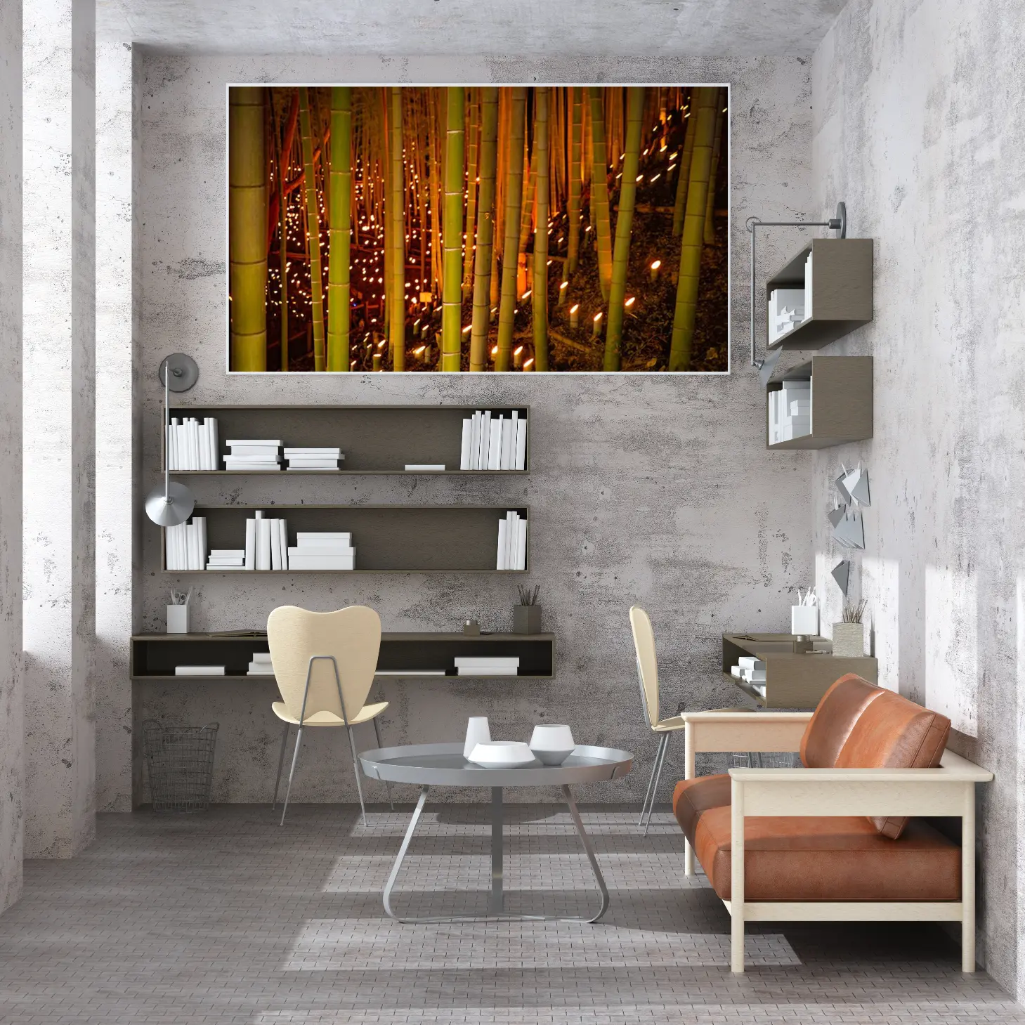 تتجلى في هذه اللوحة جماليات الطبيعة الخلابة، حيث تتناغم أعمدة الخيزران الخضراء مع الأضواء الدافئة التي تتلألأ في المساء، مما يخلق أجواءً ساحرة تنقل المشاهد إلى عالم من السكينة والهدوء. تعكس هذه القطعة الفنية أسلوب حياة متوازن، حيث تندمج عناصر الطبيعة مع الفنون العصرية، مما يجعلها إضافة مثالية لأي مساحة داخلية.
