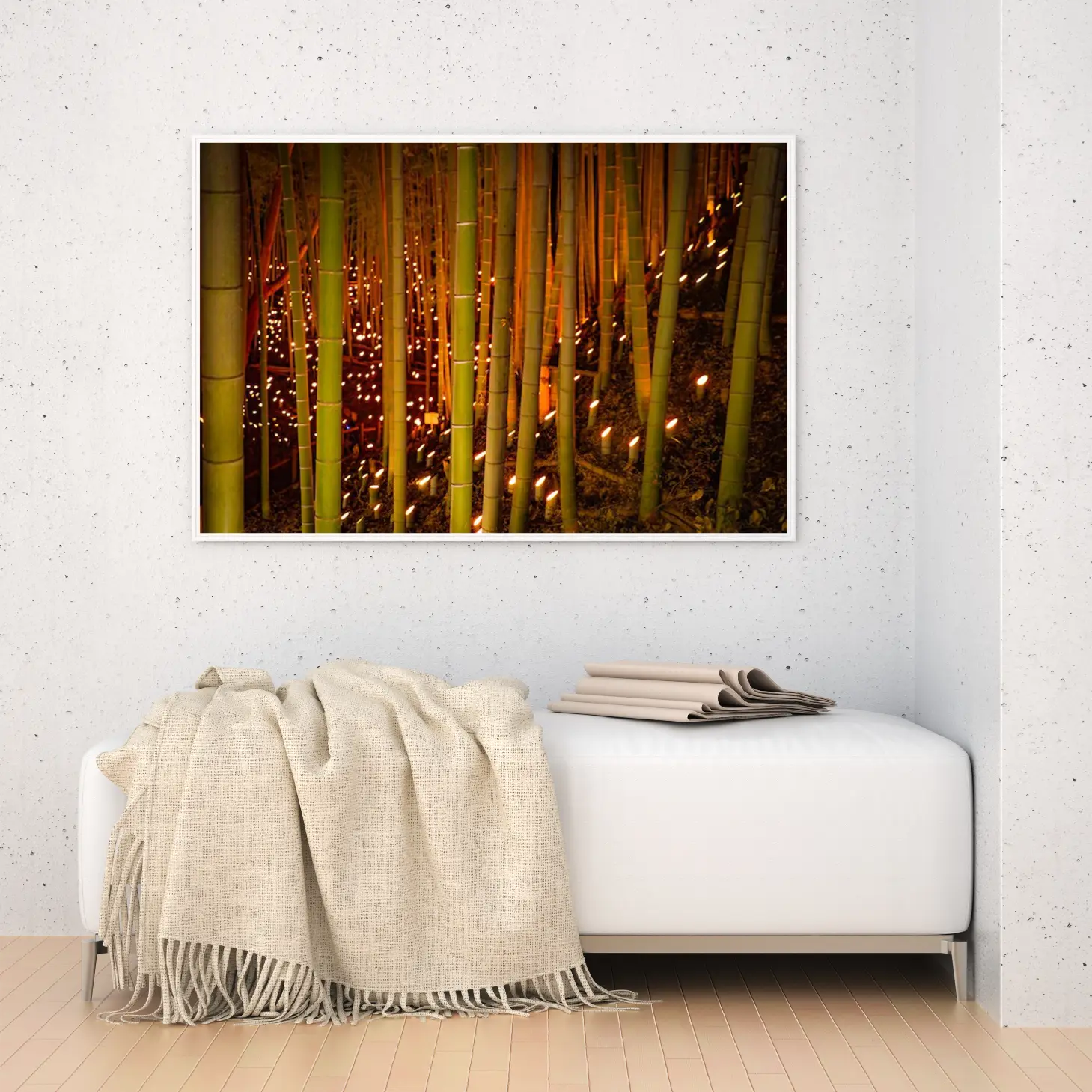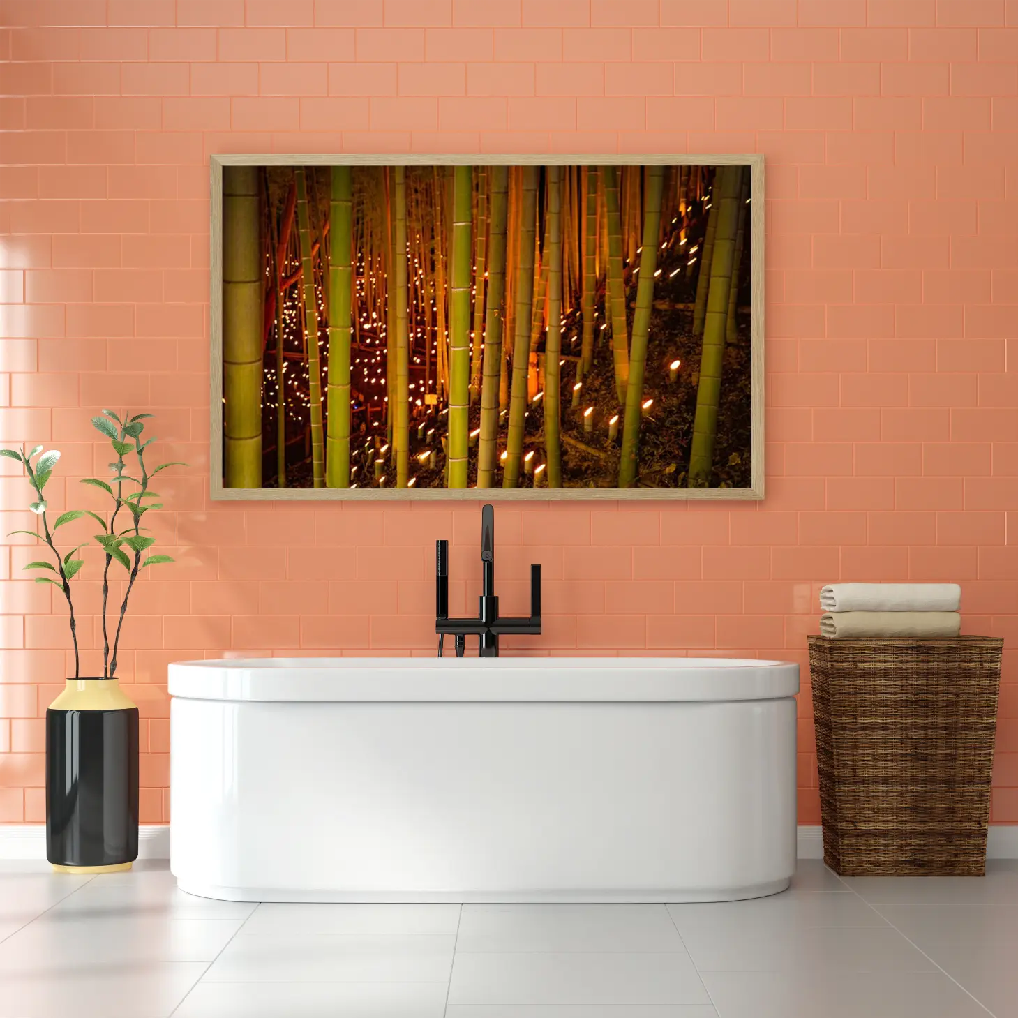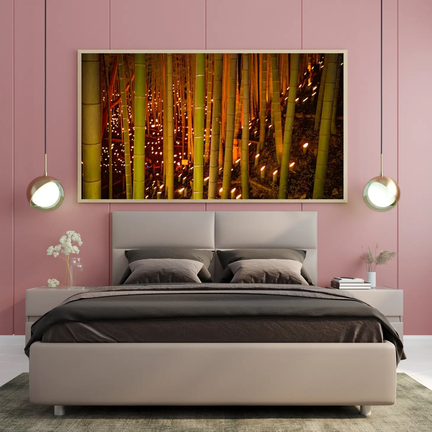 تتجلى في هذه اللوحة جماليات الطبيعة الخلابة، حيث تتناغم أعمدة الخيزران الخضراء مع الأضواء الدافئة التي تتلألأ في المساء، مما يخلق أجواءً ساحرة تنقل المشاهد إلى عالم من السكينة والهدوء. تعكس هذه القطعة الفنية أسلوب حياة متوازن، حيث تندمج عناصر الطبيعة مع الفنون العصرية، مما يجعلها إضافة مثالية لأي مساحة داخلية.