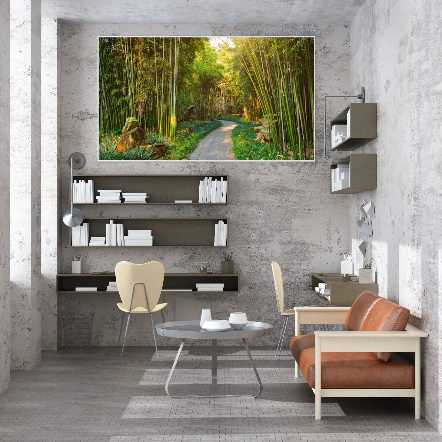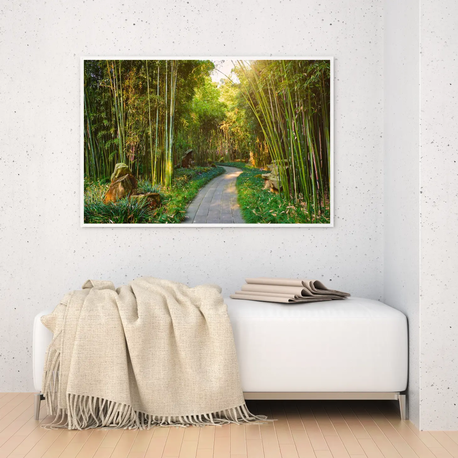تجسد هذه اللوحة جمال الطبيعة الخلابة، حيث يظهر ممر مكسو بالأخضر يلتف بين أعمدة من الخيزران الشاهق، مما يخلق إحساسًا بالهدوء والسكينة. تنعكس أشعة الشمس الذهبية على أوراق النباتات، مما يضفي لمسة سحرية على المشهد ويعزز من أجواء الاسترخاء والراحة. إن وجود هذه القطعة الفنية في أي مكان سيحول الفضاء إلى ملاذ هادئ، مما يعكس نمط حياة متوازن ومتناغم.