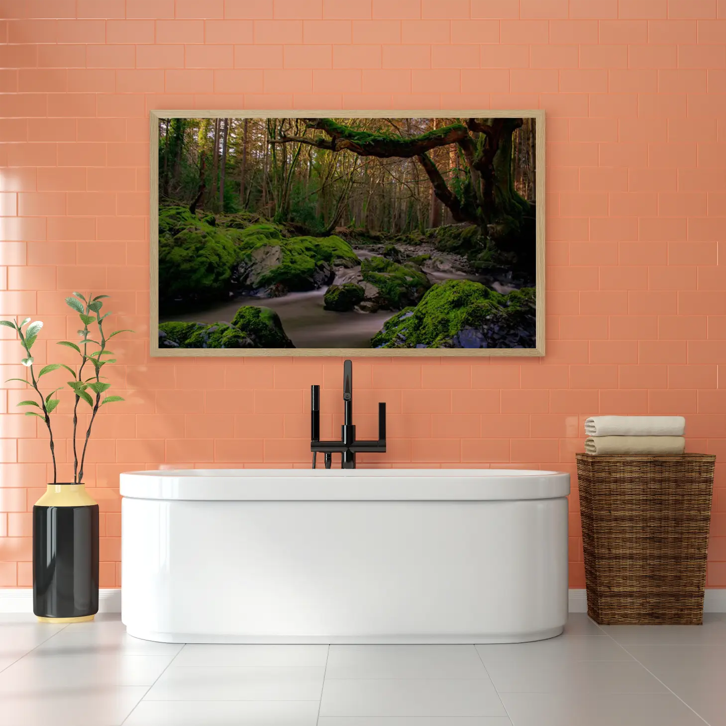 تتجلى في هذه اللوحة جماليات الطبيعة الخلابة، حيث تتناغم الألوان الزاهية مع تفاصيل المشهد الطبيعي. تتدفق المياه برفق بين الصخور المغطاة بالطحالب الخضراء، بينما تتعانق الأشجار في الخلفية، مما يخلق إحساسًا بالهدوء والسكون. تعكس هذه اللوحة روح الحياة البرية، مما يجعلها إضافة مثالية لأي مساحة، حيث تضفي أجواءً من الانتعاش والسكينة.