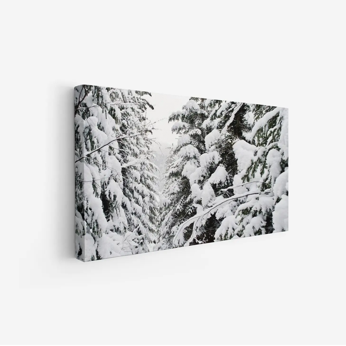 لوحة غابات مغطاة بالثلوج بألوان بيضاء وخضراء، تعكس هدوء الشتاء وجمال الطبيعة، لوحات طبيعة، لوحات كانفاس.