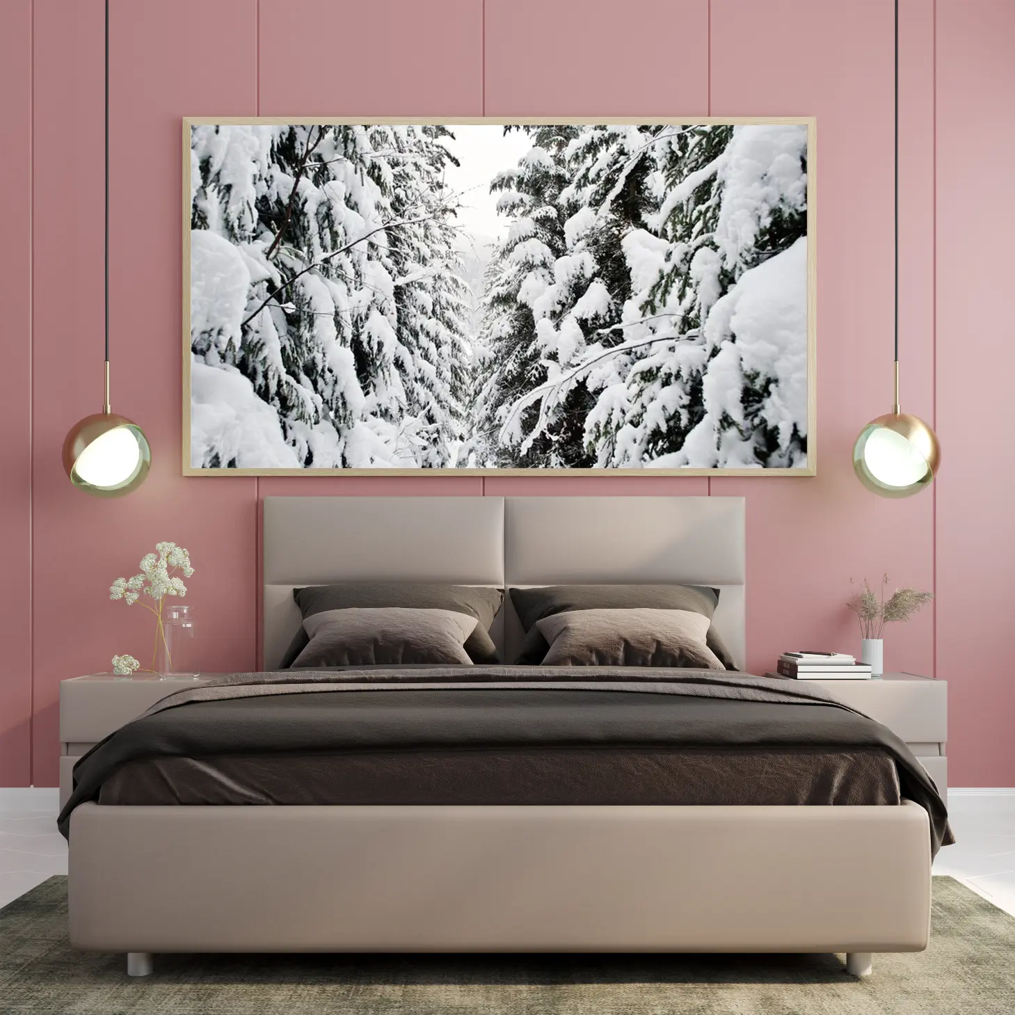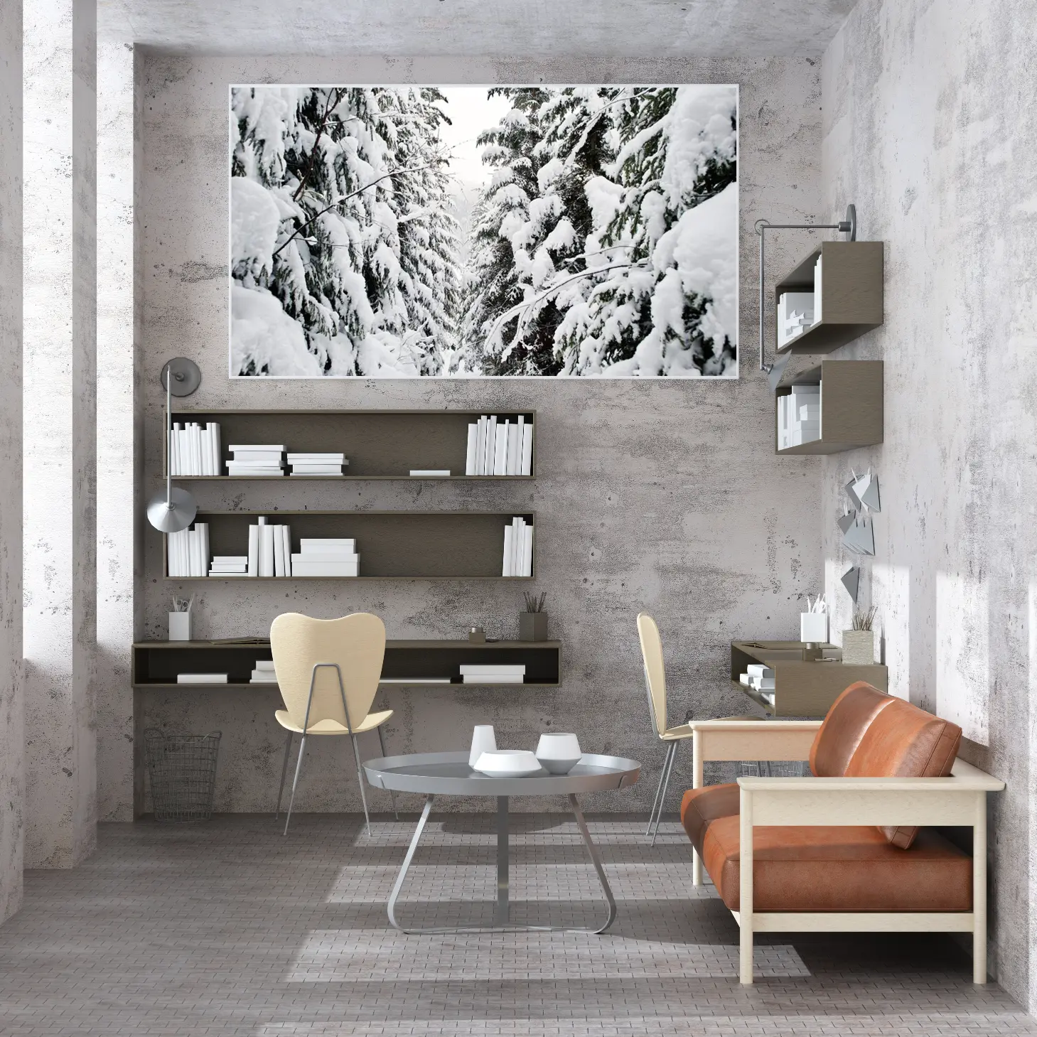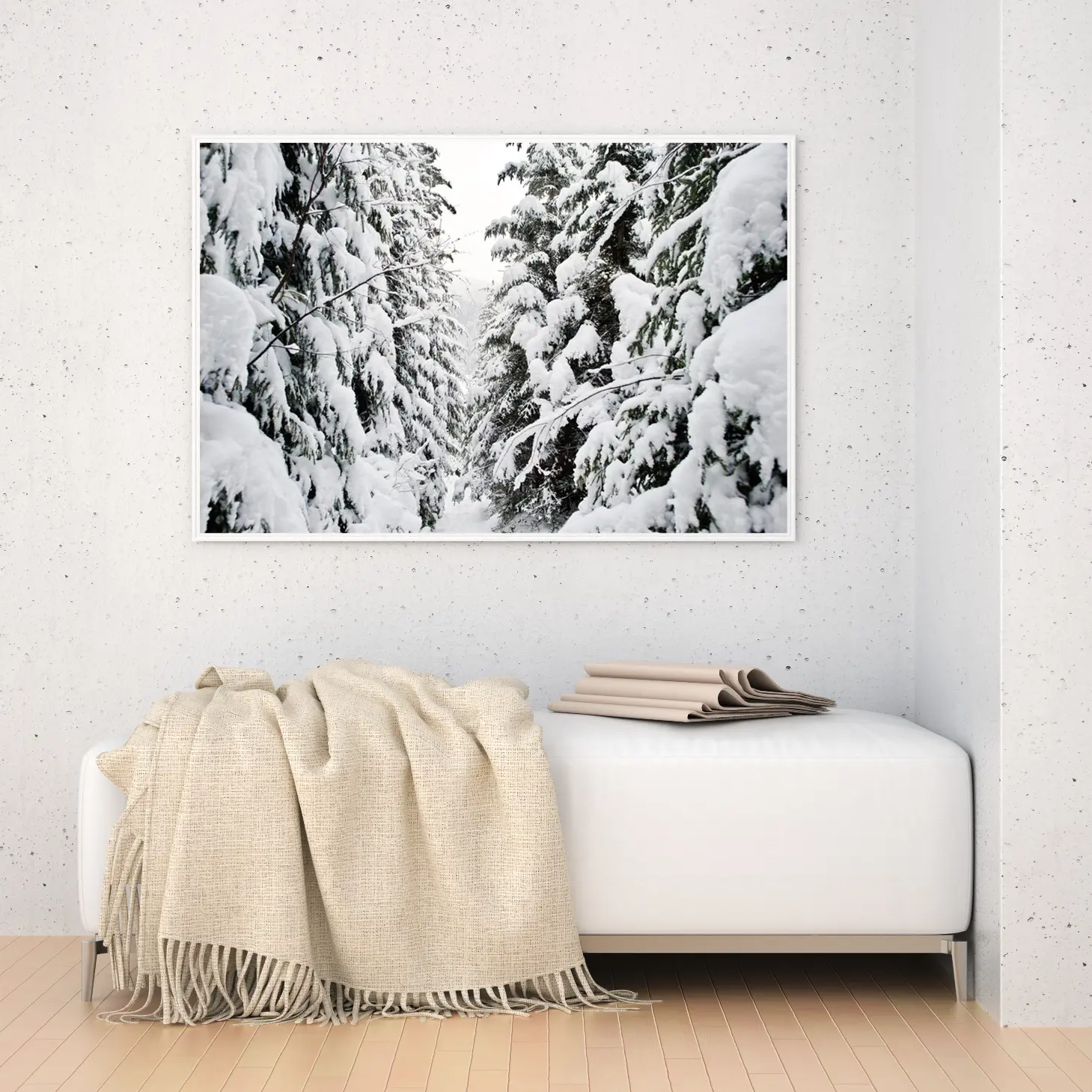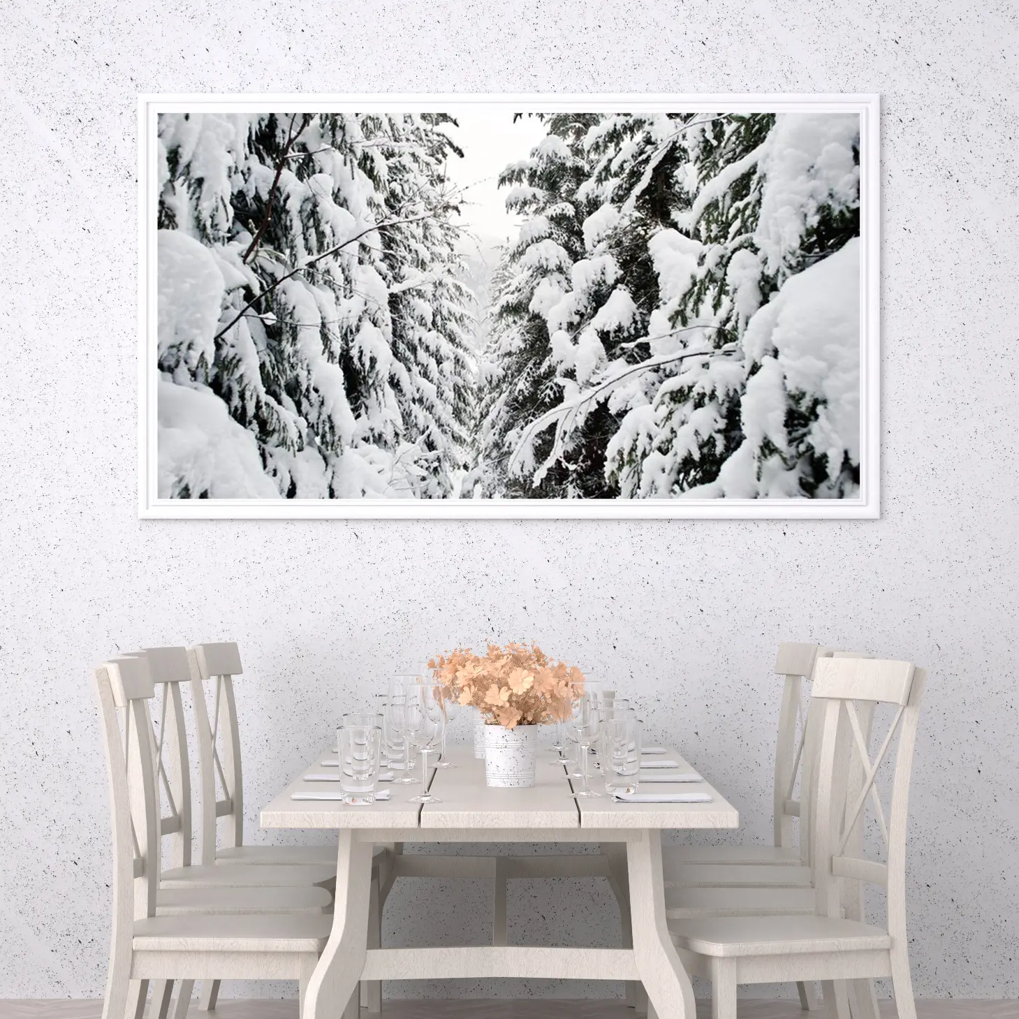 تجسد هذه اللوحة الفنية مشهدًا ساحرًا من الطبيعة، حيث تتناغم أشجار الصنوبر المغطاة بالثلوج مع الأجواء الهادئة والباردة. يخلق هذا المنظر إحساسًا بالسكينة والهدوء، مما يجعله خيارًا مثاليًا لإضفاء لمسة من الجمال الطبيعي على أي مساحة. تعكس الألوان البيضاء والرمادية توازنًا رائعًا، مما يضفي على المكان شعورًا بالانتعاش والنقاء، ويعزز من نمط الحياة العصري الذي يسعى الكثيرون لتحقيقه.