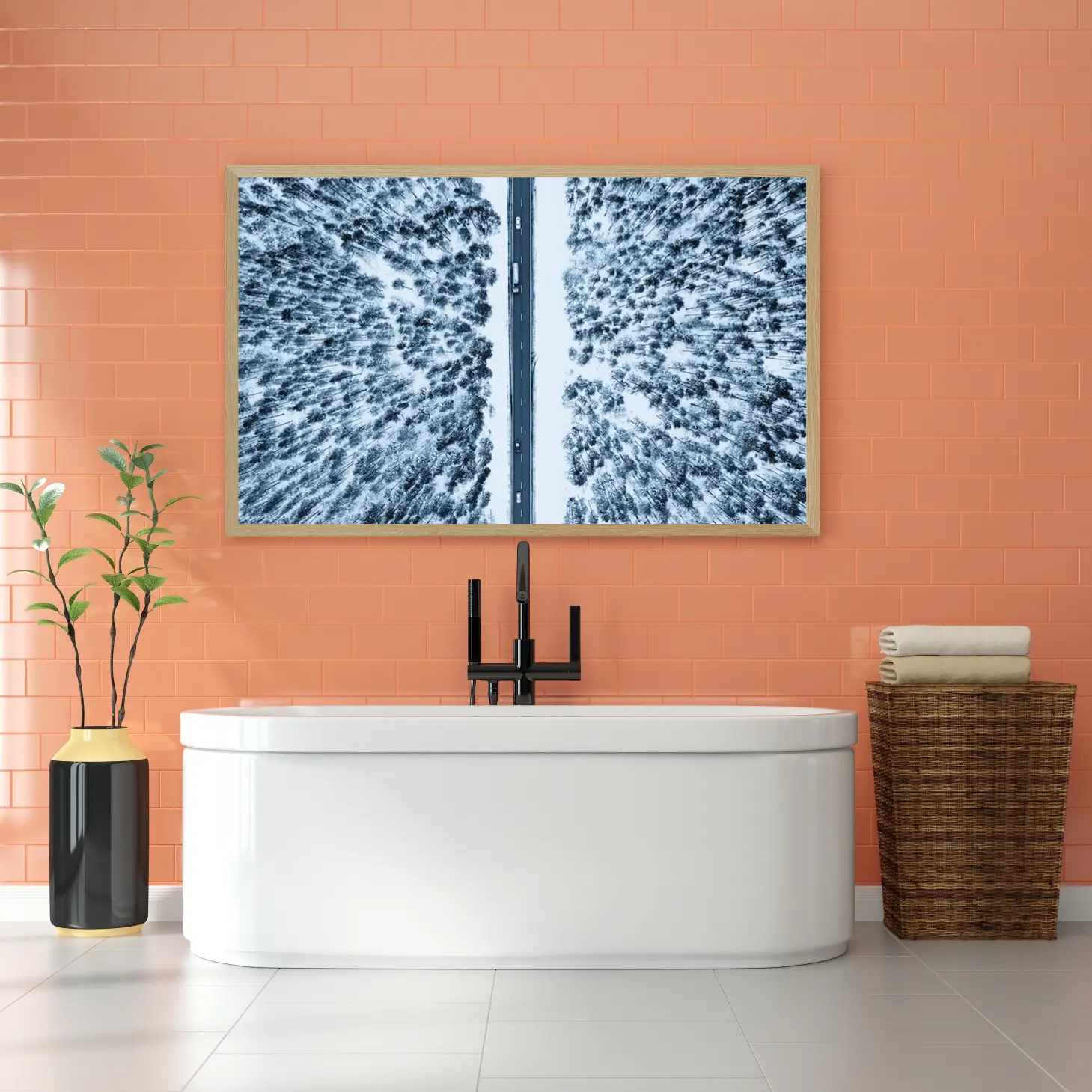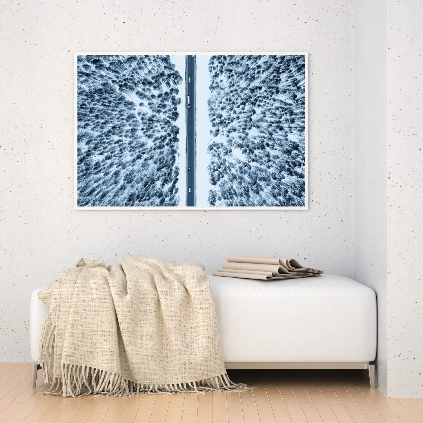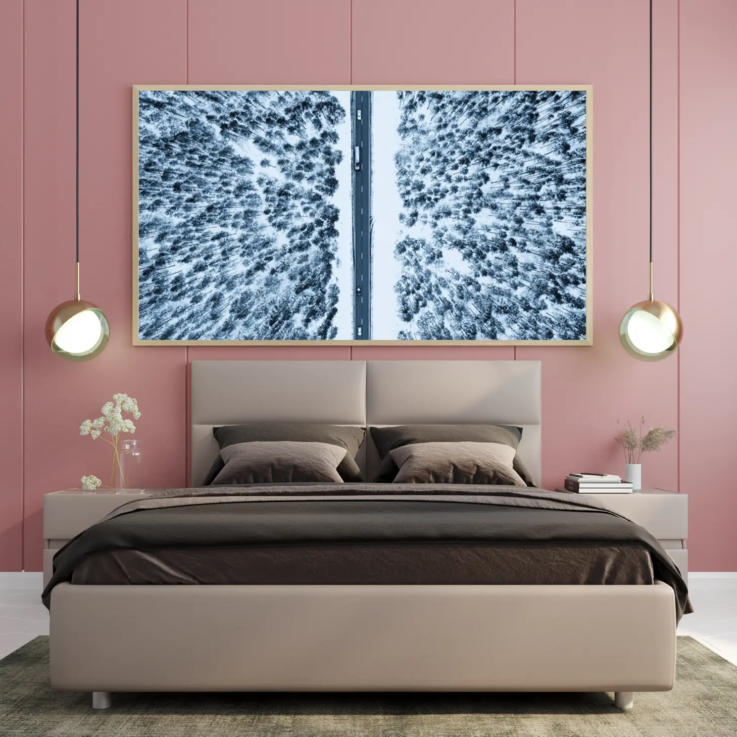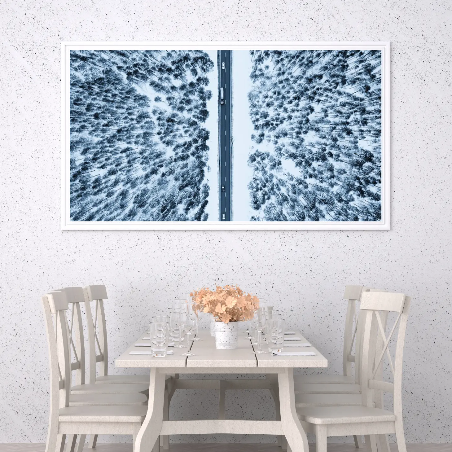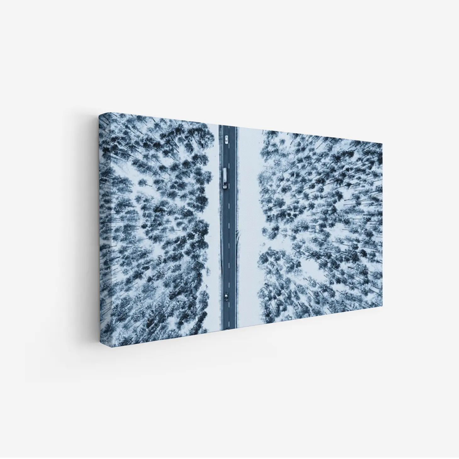 لوحة غابات مغطاة بالثلوج مع طريق يمر وسط الأشجار، ألوان باردة تعكس الهدوء، لوحات طبيعة، لوحات كانفاس.