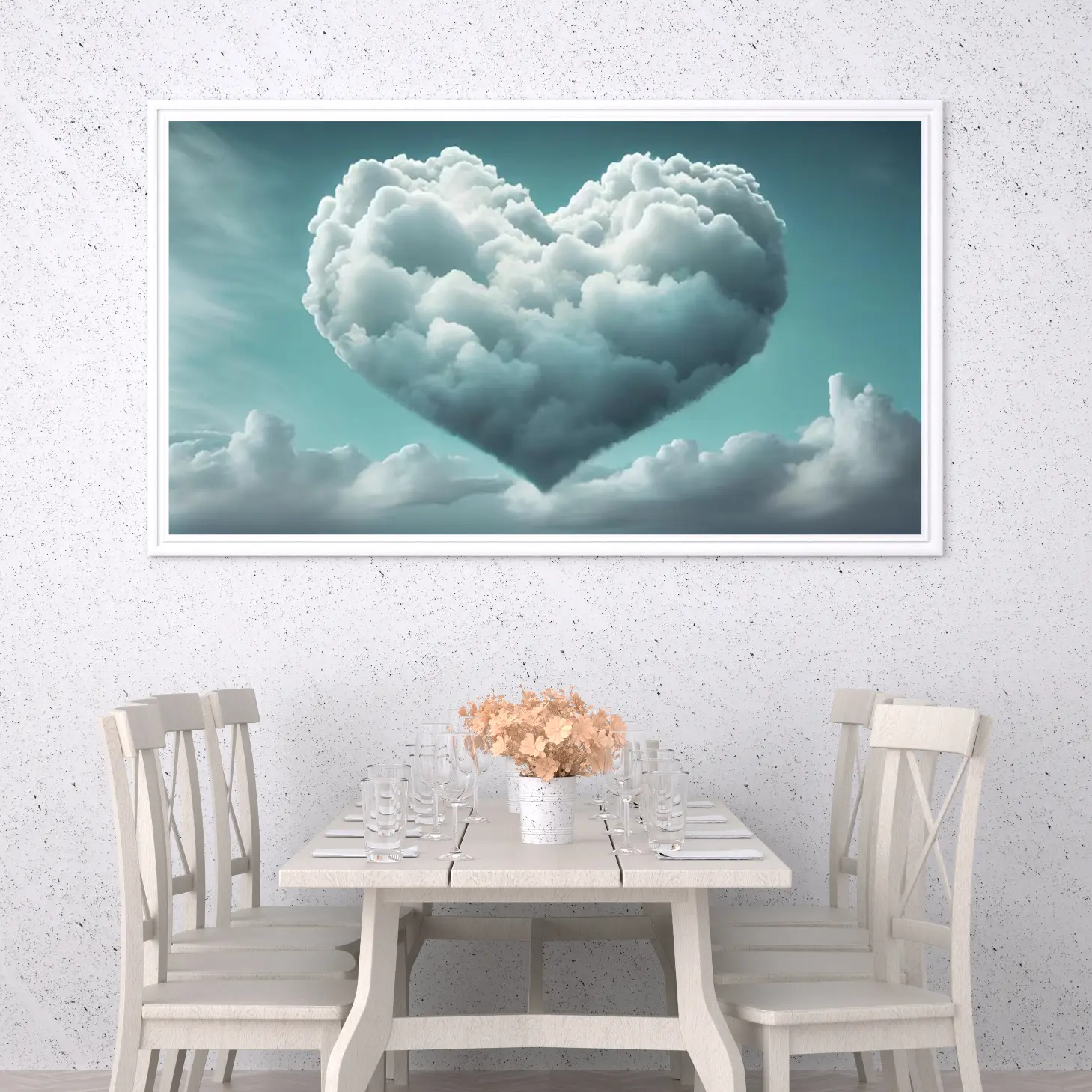 تضفي هذه اللوحة لمسة من السحر والهدوء على أي مساحة، حيث تتجلى فيها أشكال السحب في قلب يرمز إلى الحب والحنان. الألوان الهادئة التي تتناغم مع الخلفية الزرقاء تعكس شعوراً بالسكينة والراحة، مما يجعلها خياراً مثالياً لتزيين الجدران في المنازل أو المكاتب. تأثيرها البصري يخلق أجواءً مريحة تدعو للتأمل والاسترخاء، مما يعزز نمط الحياة العصري الذي يسعى الكثيرون لتحقيقه.