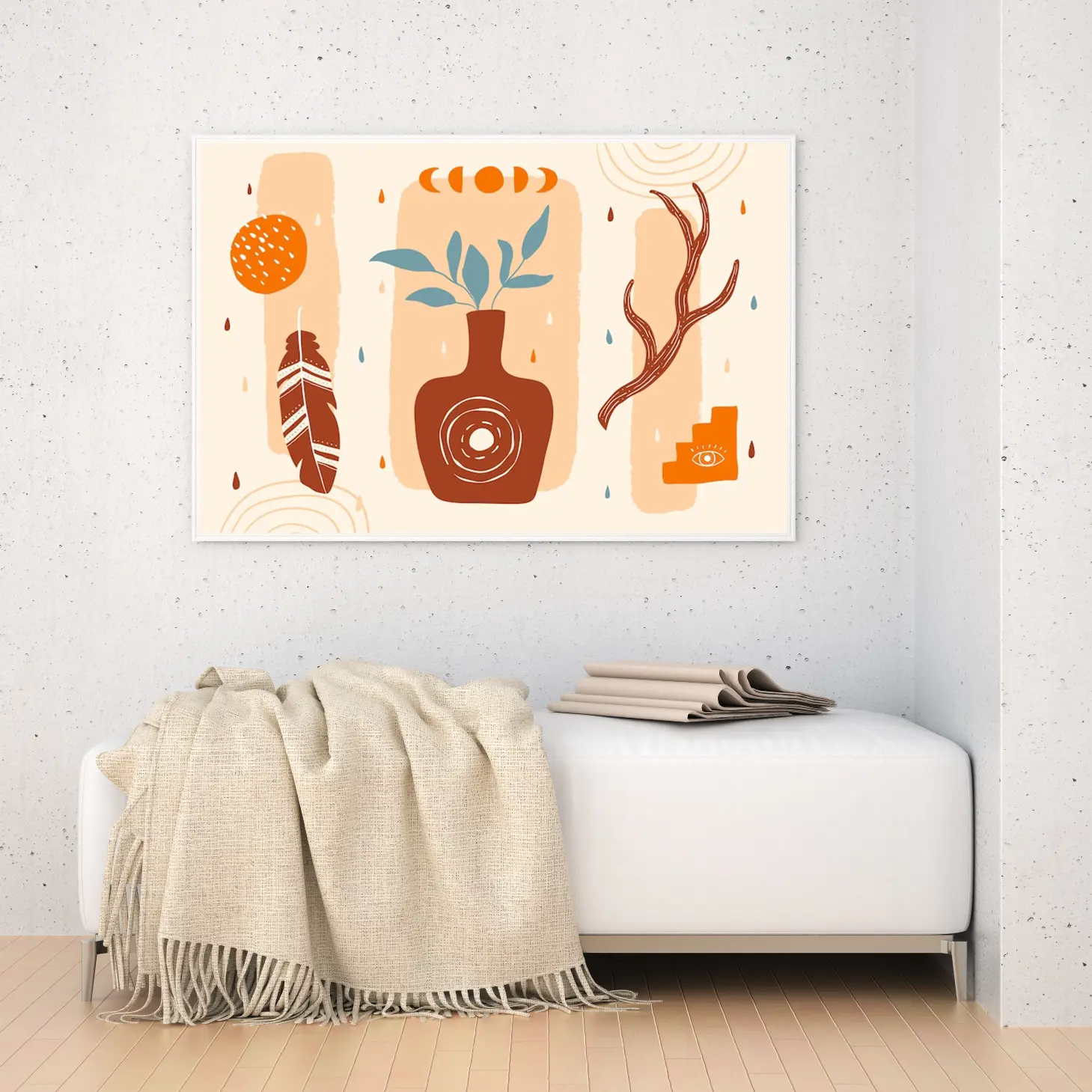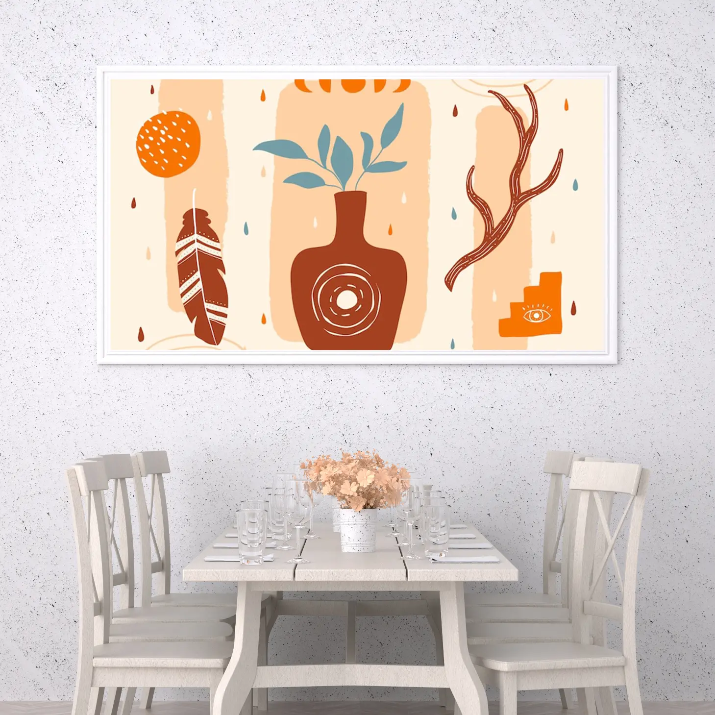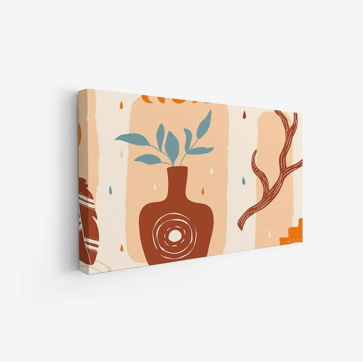 تتألق هذه اللوحة بألوان دافئة وتفاصيل فنية تعكس روح الطبيعة، حيث يظهر إناء مزخرف بأوراق خضراء تتناغم مع خلفية ناعمة من درجات البيج والبرتقالي. تخلق هذه الألوان جوًا مريحًا ومليئًا بالحيوية، مما يجعلها خيارًا مثاليًا لإضفاء لمسة من الأناقة على أي مساحة. إن تأثيرها البصري يساهم في تعزيز الأجواء المنزلية، مما يجعلها قطعة فنية تضفي توازنًا وجمالًا على نمط الحياة.