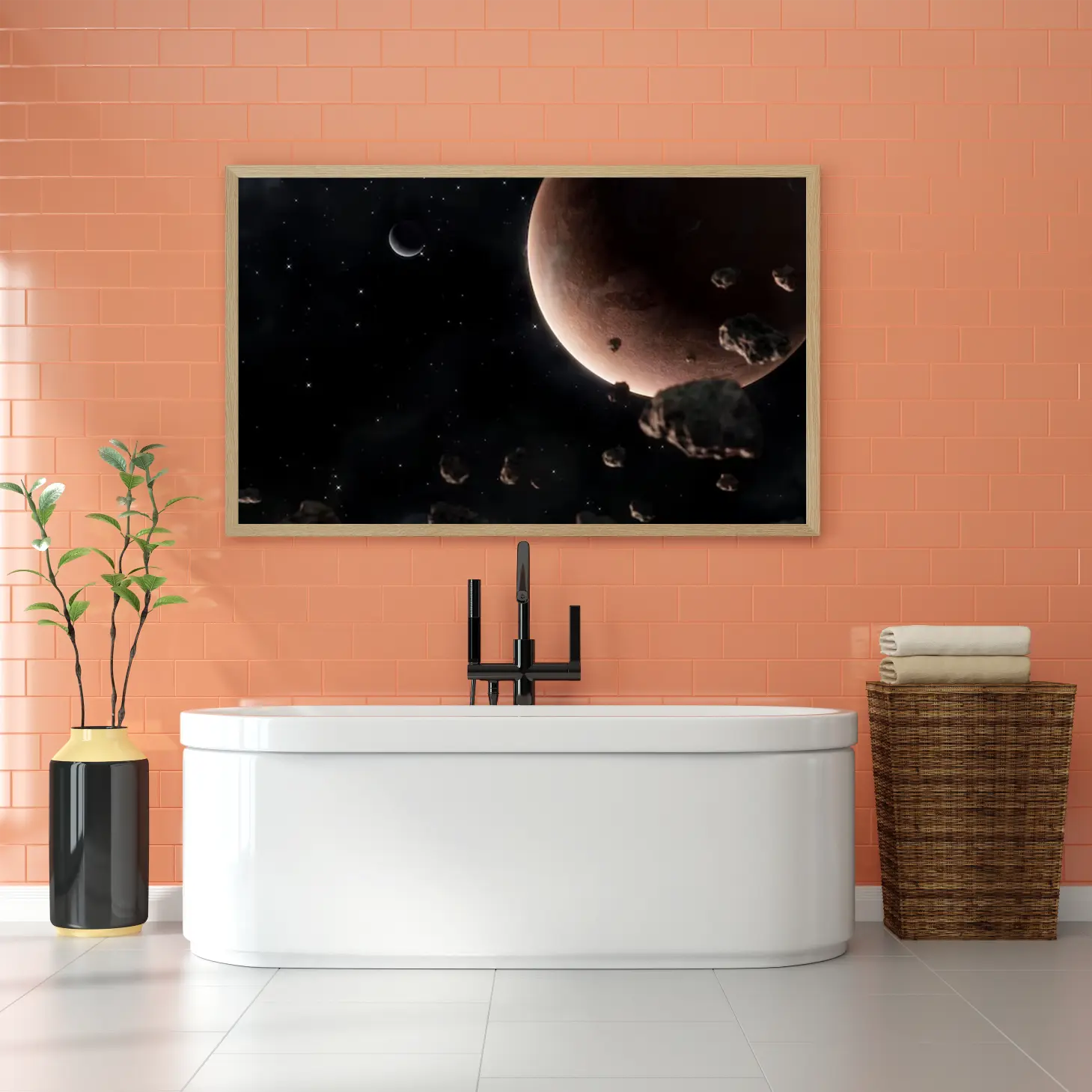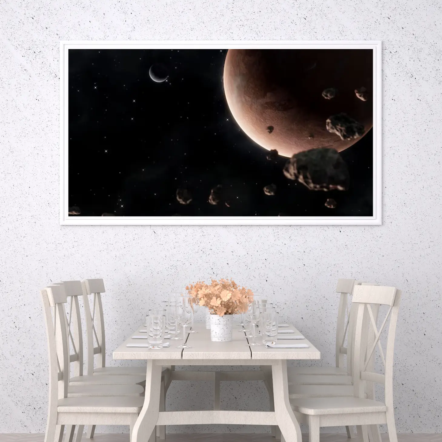 استمتع بجمال الكون مع هذه اللوحة الفنية المذهلة التي تأخذك في رحلة عبر الفضاء. تفاصيل الكواكب والأجرام السماوية تضفي لمسة من الغموض والسحر على أي مساحة، مما يجعلها خيارًا مثاليًا لعشاق الفضاء والفن على حد سواء. اجعل من جدران منزلك نافذة إلى عوالم جديدة.