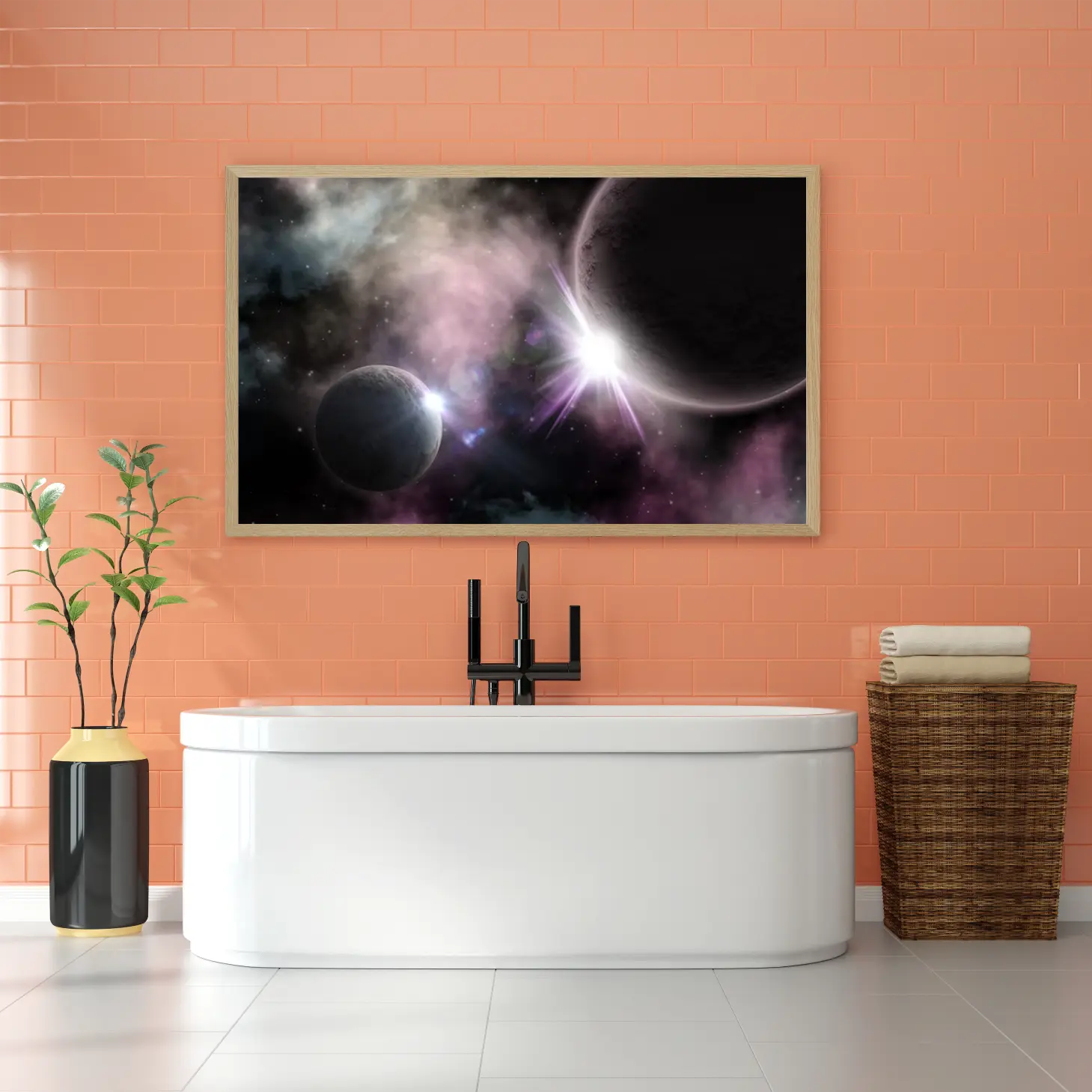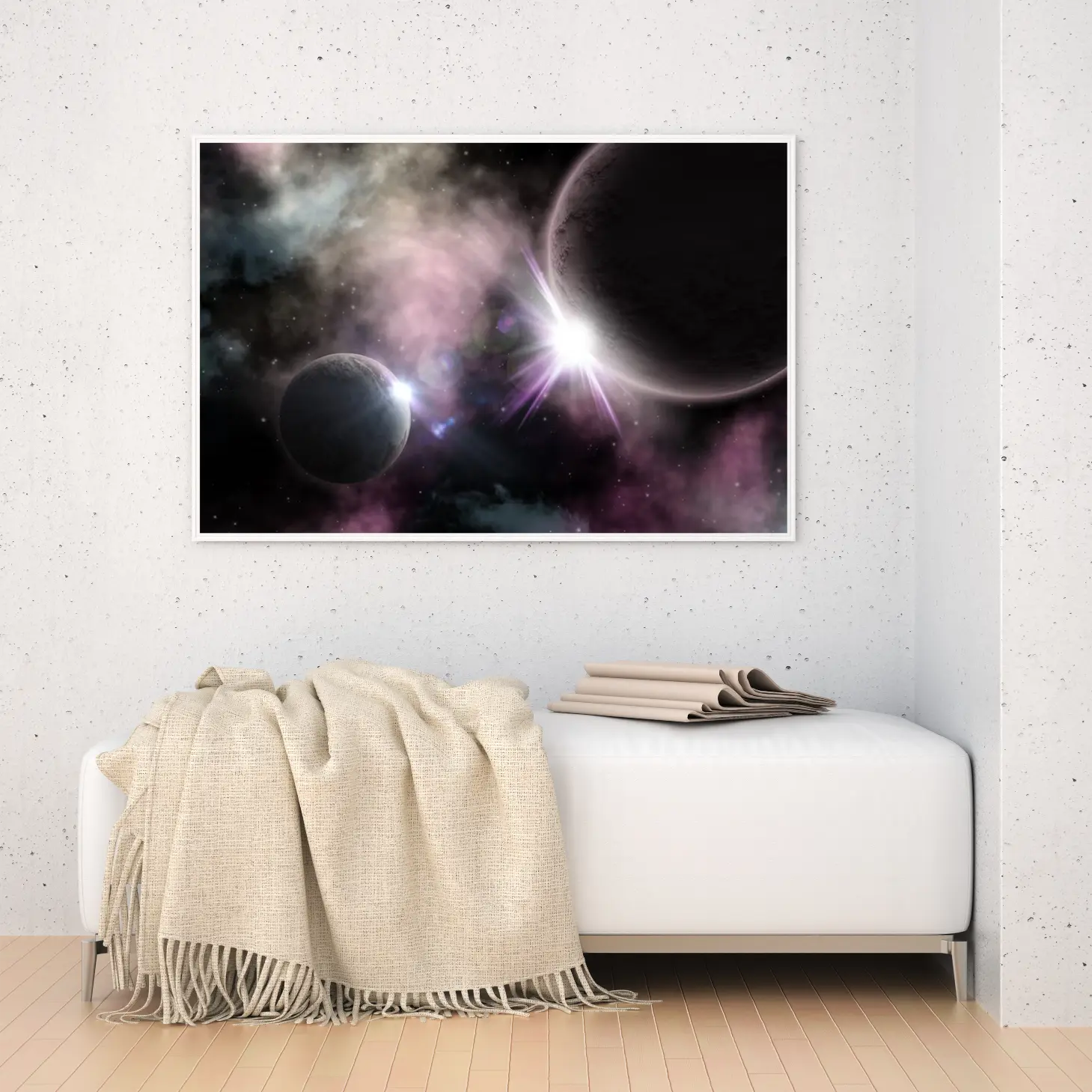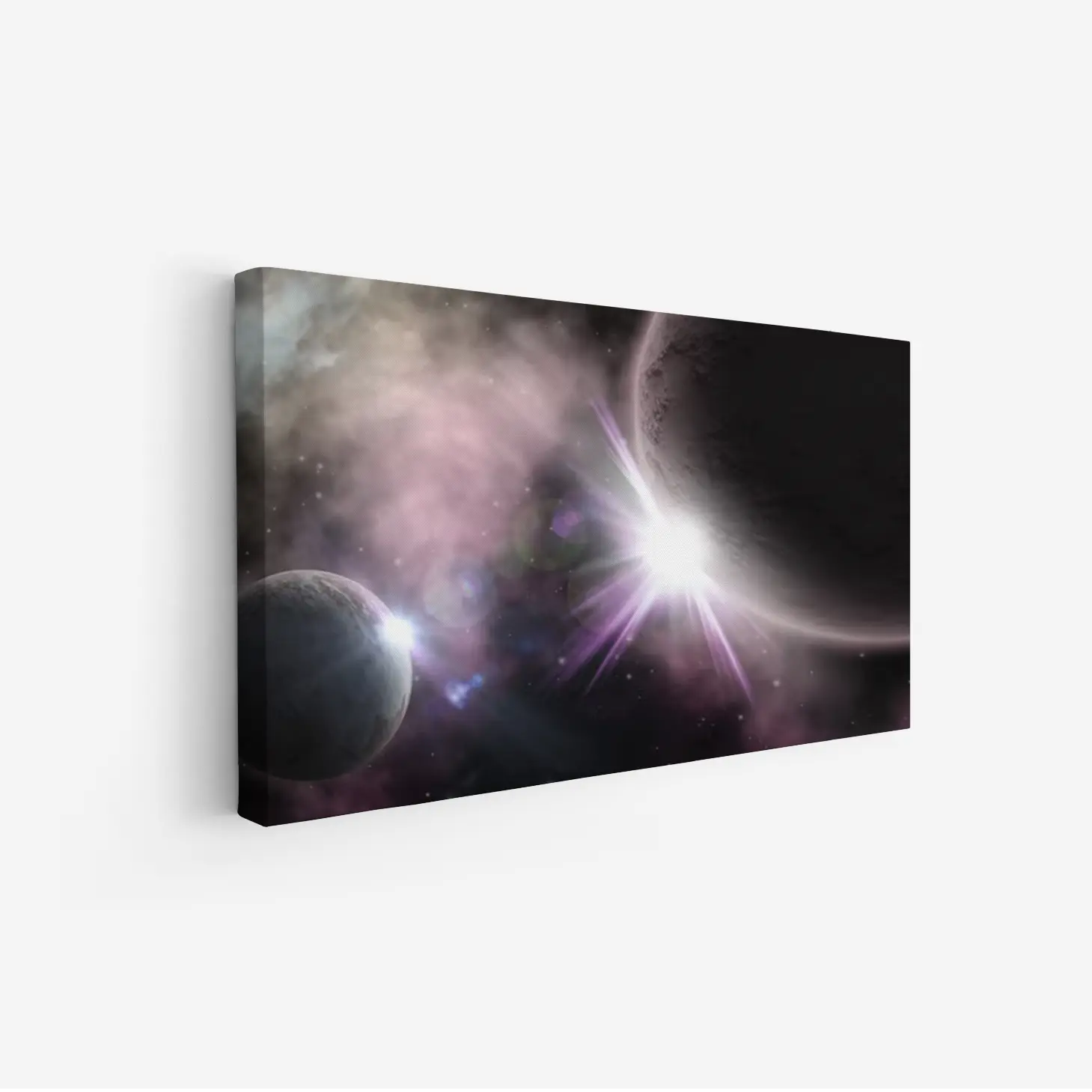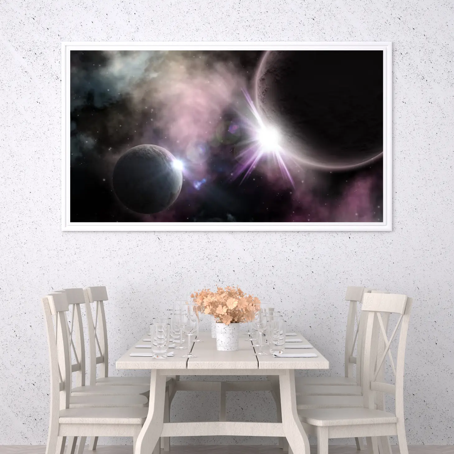 استمتع بجمال الكون مع هذه اللوحة الفنية المذهلة التي تأسر الأنفاس. تجسد الألوان الغامضة والكواكب المتلألئة عمق الفضاء، مما يضفي لمسة من السحر والخيال على أي مساحة. اجعل من جدران منزلك نافذة إلى عوالم جديدة.