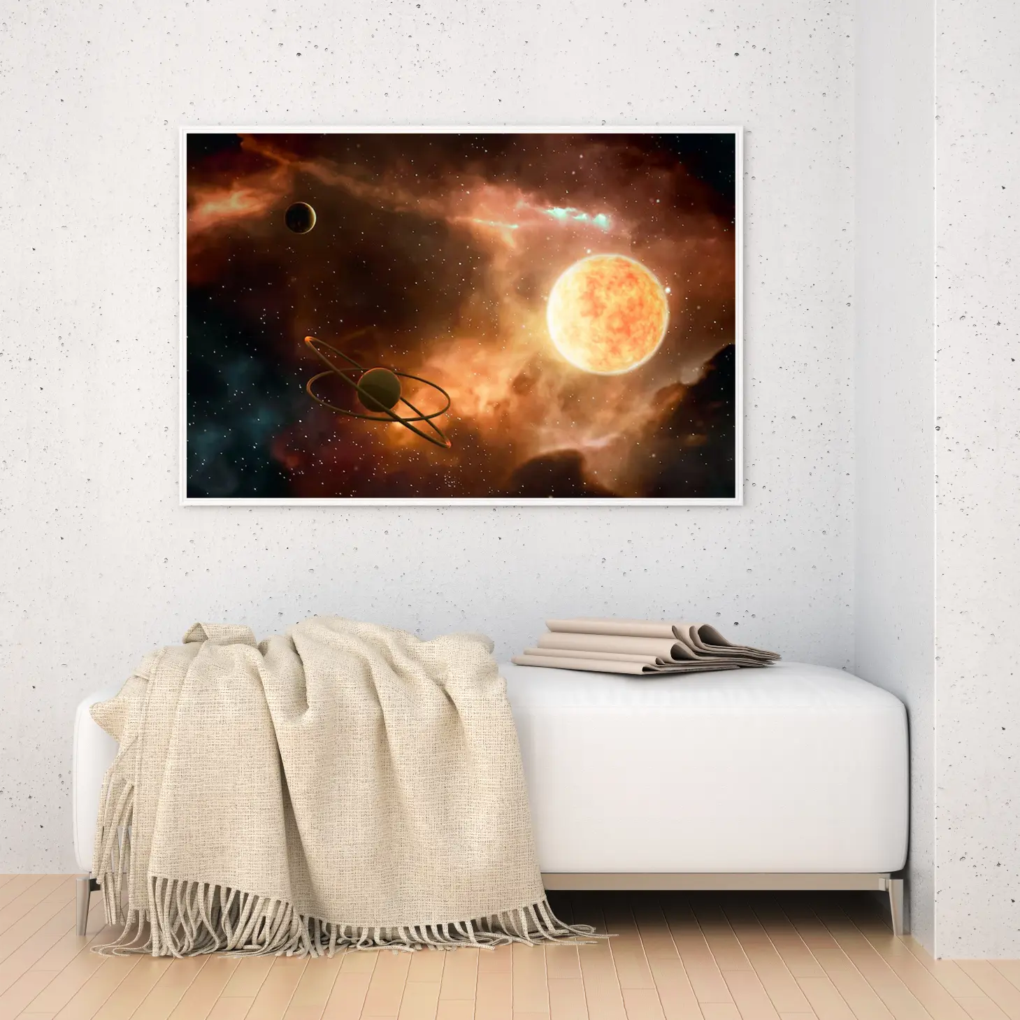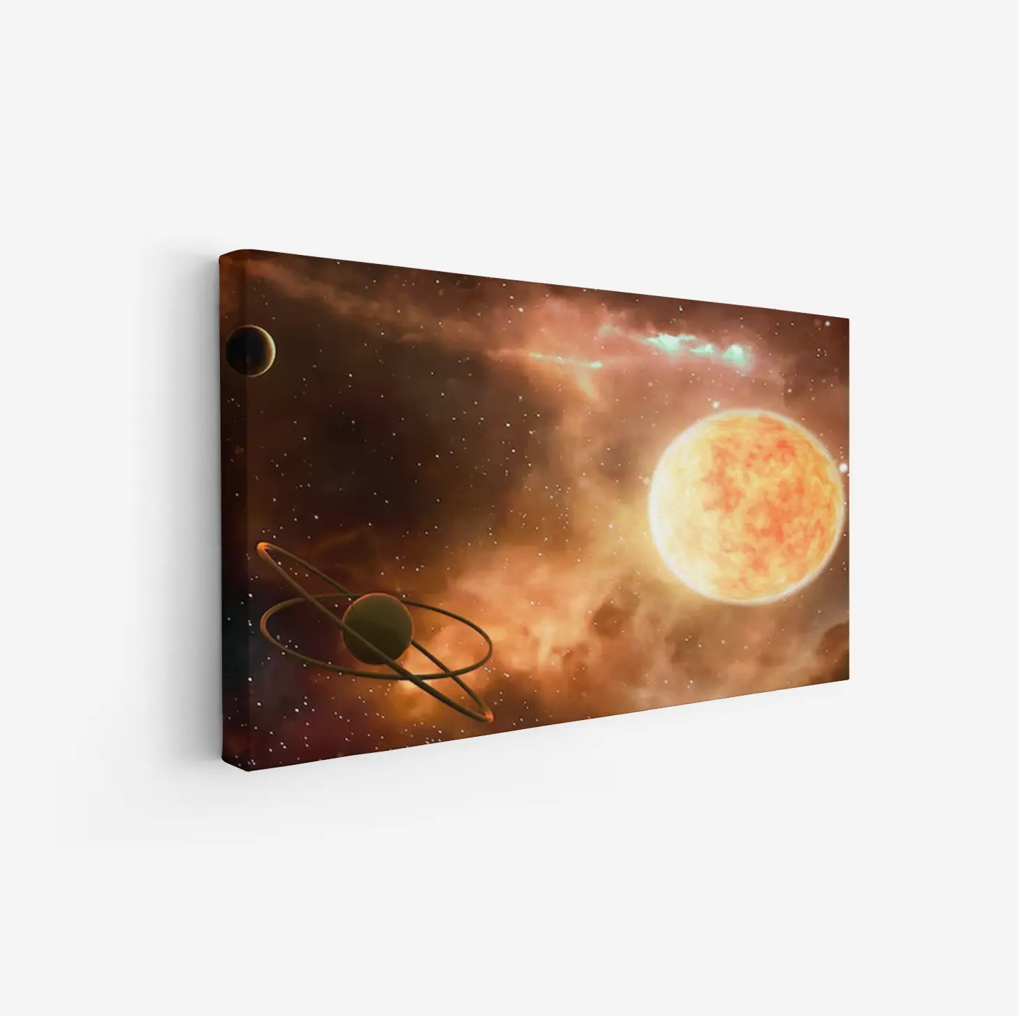 لوحة فضاء ملون بألوان دافئة مع كواكب ونجوم متلألئة، جو مدهش وغامض، مناظر طبيعية، لوحات فنية عصرية، لوحات جدارية للمنزل.