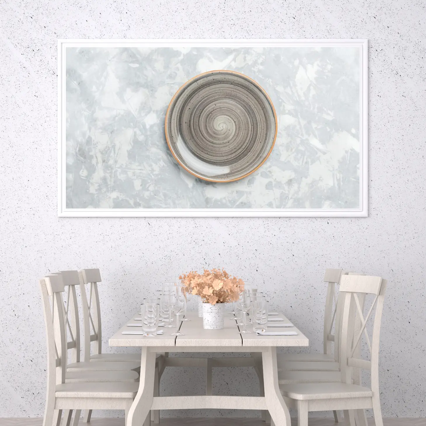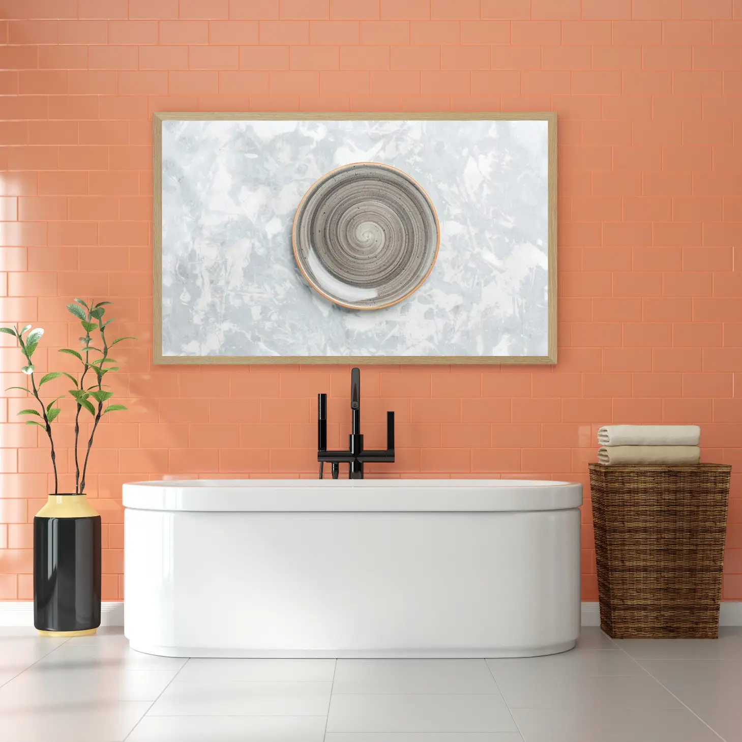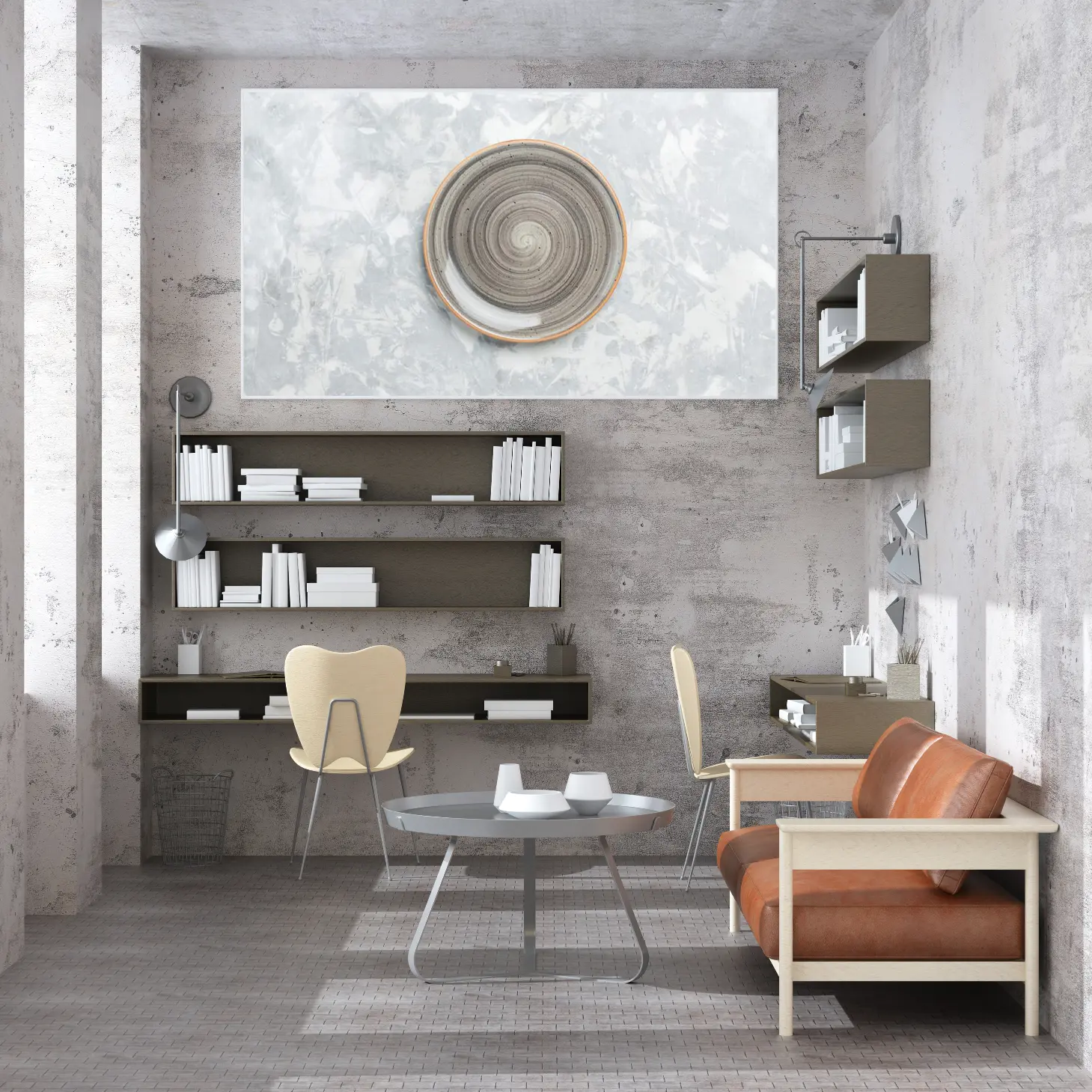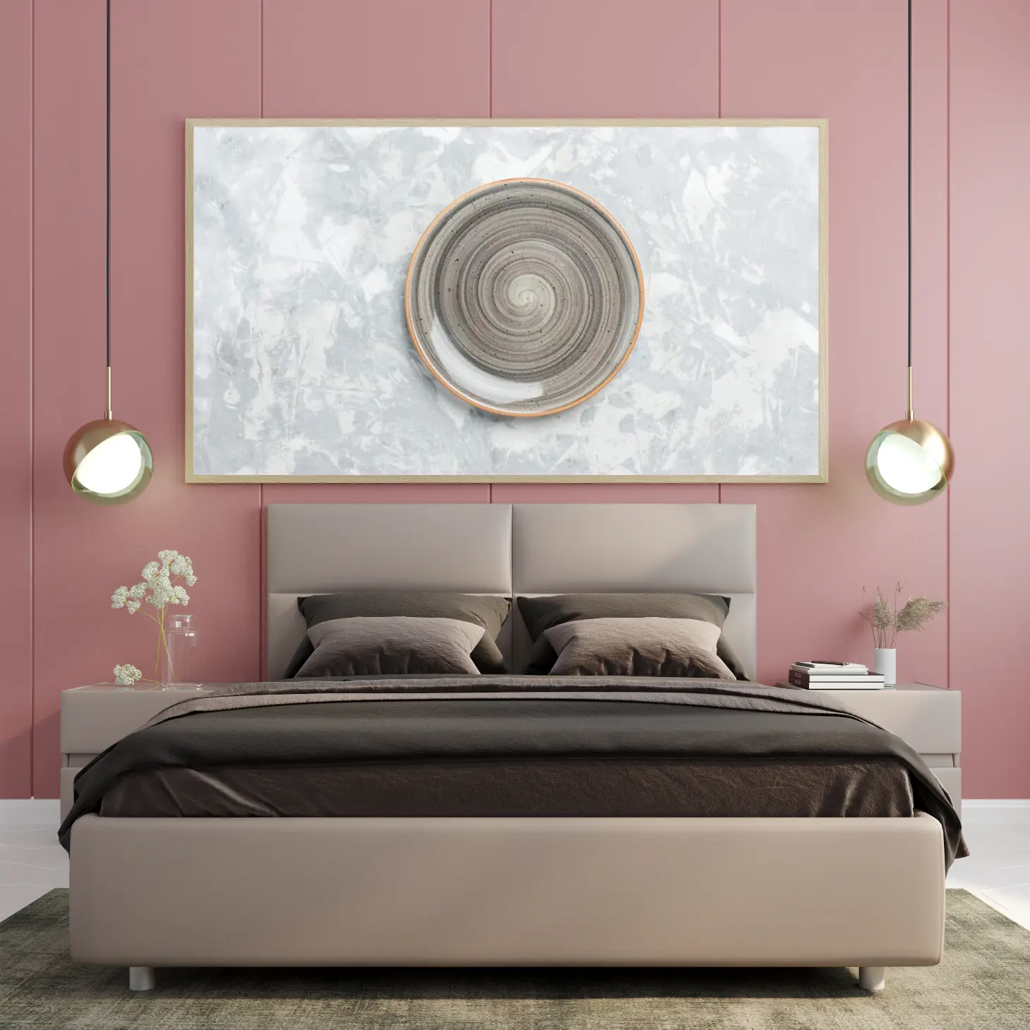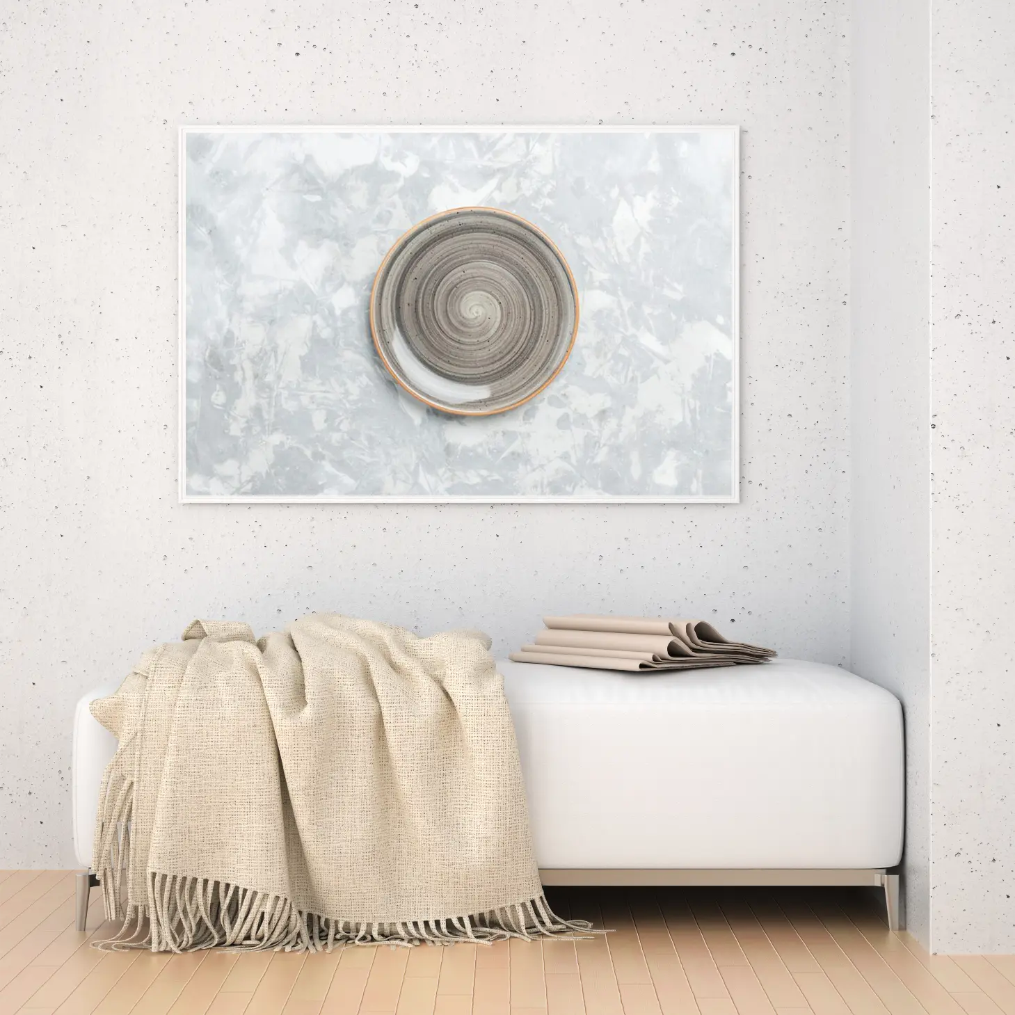 تتجلى في هذه اللوحة الفنية المعاصرة روح الإبداع والتميز، حيث تتوسطها وعاء دائري بتصميم حلزوني يتناغم بشكل رائع مع الخلفية الرمادية المميزة. تعكس الألوان الهادئة والمزج المتناغم بين الظلال المختلفة شعورًا بالسكينة والراحة، مما يجعلها خيارًا مثاليًا لإضفاء لمسة من الأناقة على أي مساحة. إن هذه القطعة الفنية ليست مجرد ديكور جداري، بل هي تعبير عن أسلوب حياة متوازن يدمج بين الجمال والوظيفية.