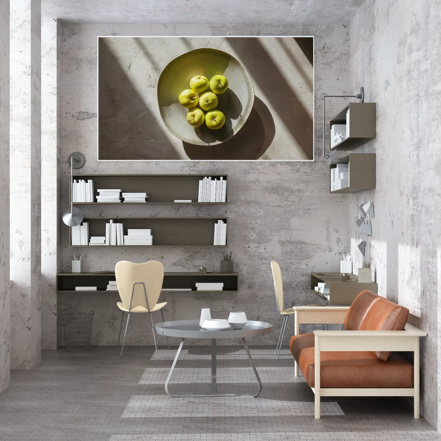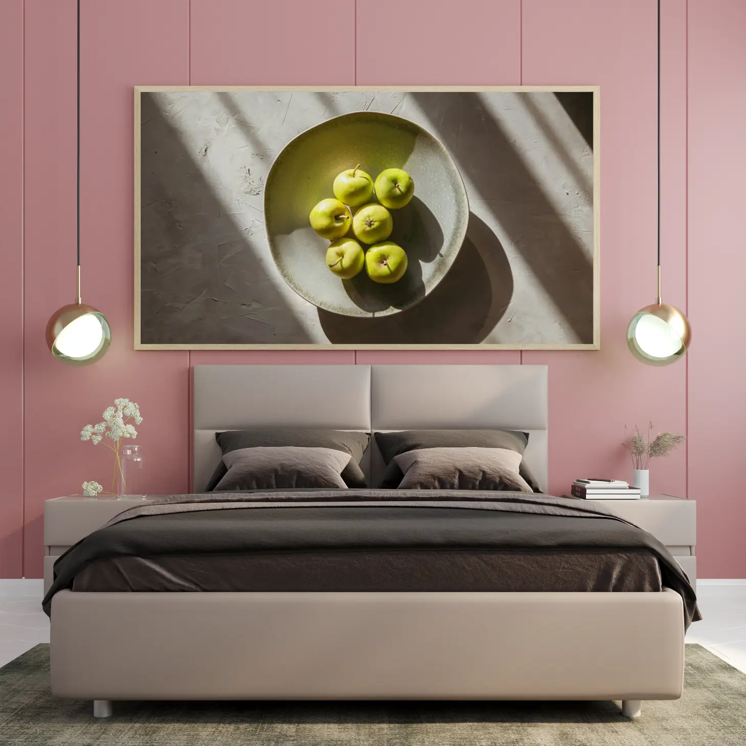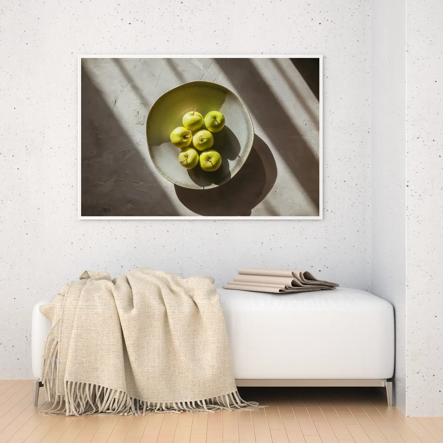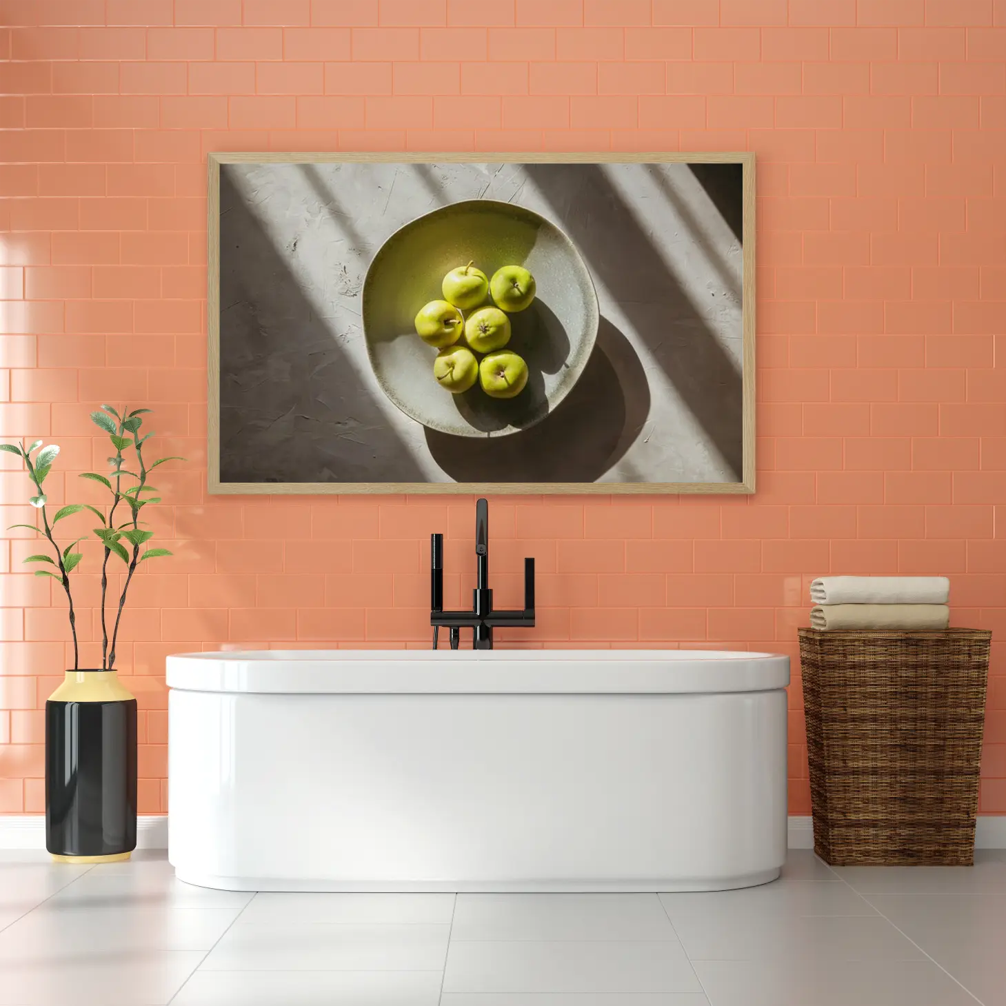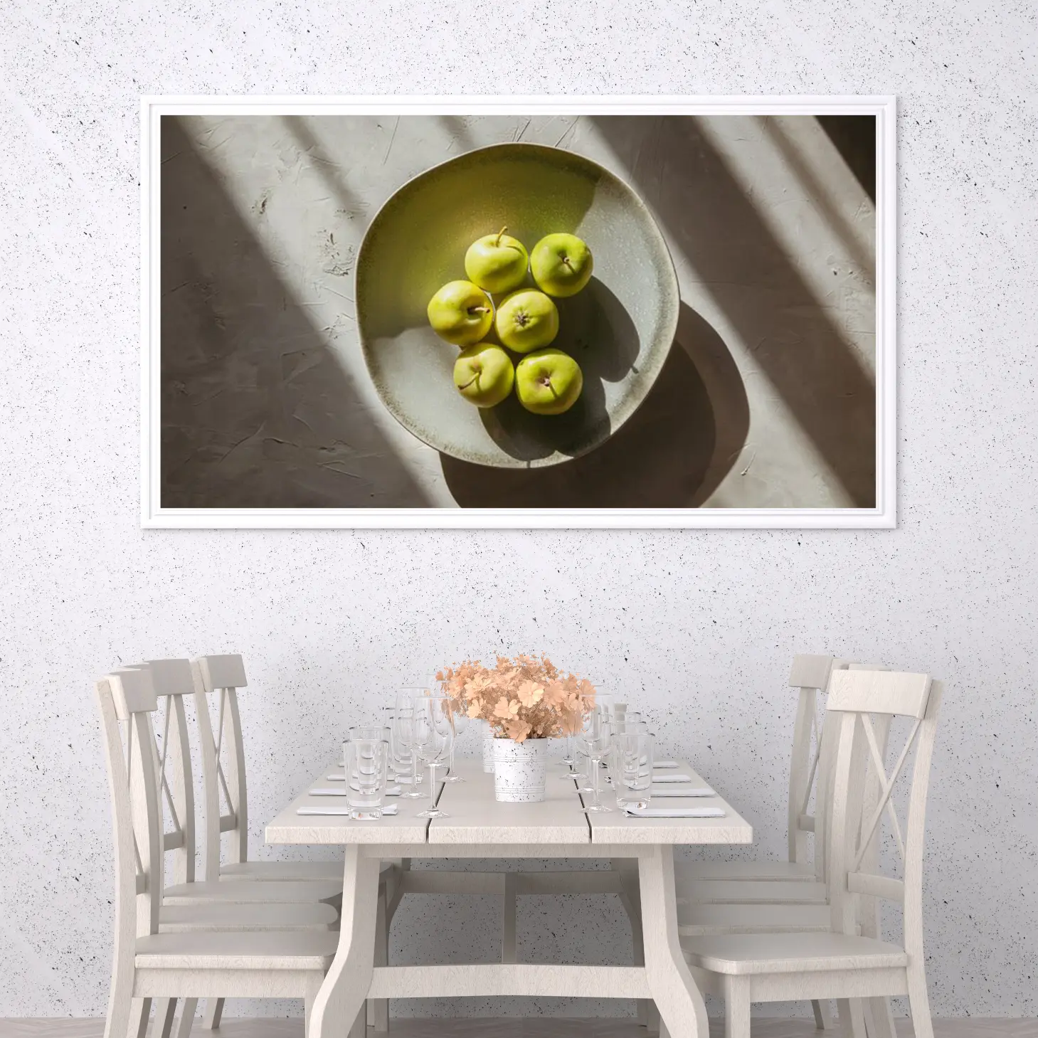 تتجلى في هذه اللوحة الفنية رؤية جمالية مدهشة، حيث تتوسطها مجموعة من التفاح الأخضر اللامع في وعاء بسيط وأنيق. تعكس الألوان الزاهية للتفاح تباينًا رائعًا مع الخلفية الهادئة، مما يضفي شعورًا بالانتعاش والحيوية على أي مساحة تُعرض فيها. إن الإضاءة الطبيعية التي تسلط الضوء على التفاصيل الدقيقة تضفي عمقًا وثراءً على المشهد، مما يجعله نقطة جذب بصرية تعزز من أجواء المكان وتضفي لمسة من الأناقة العصرية.