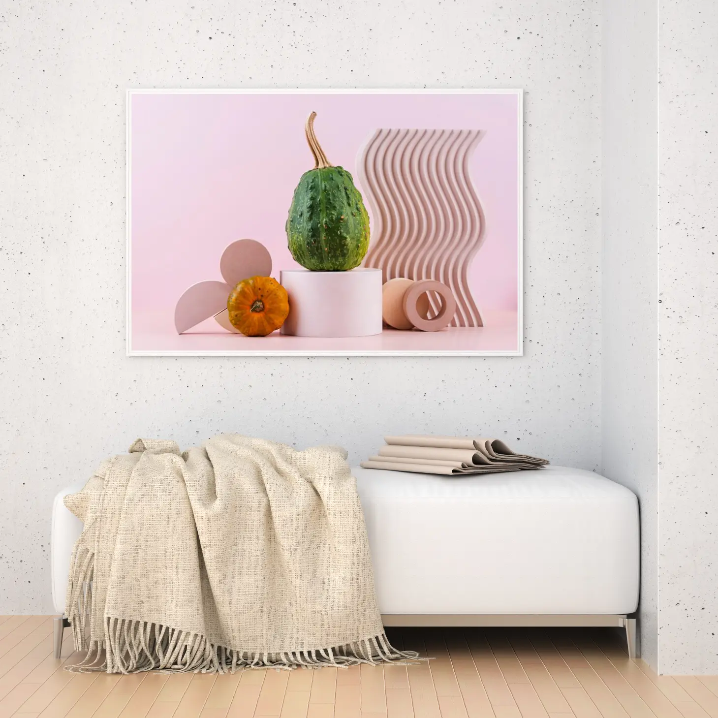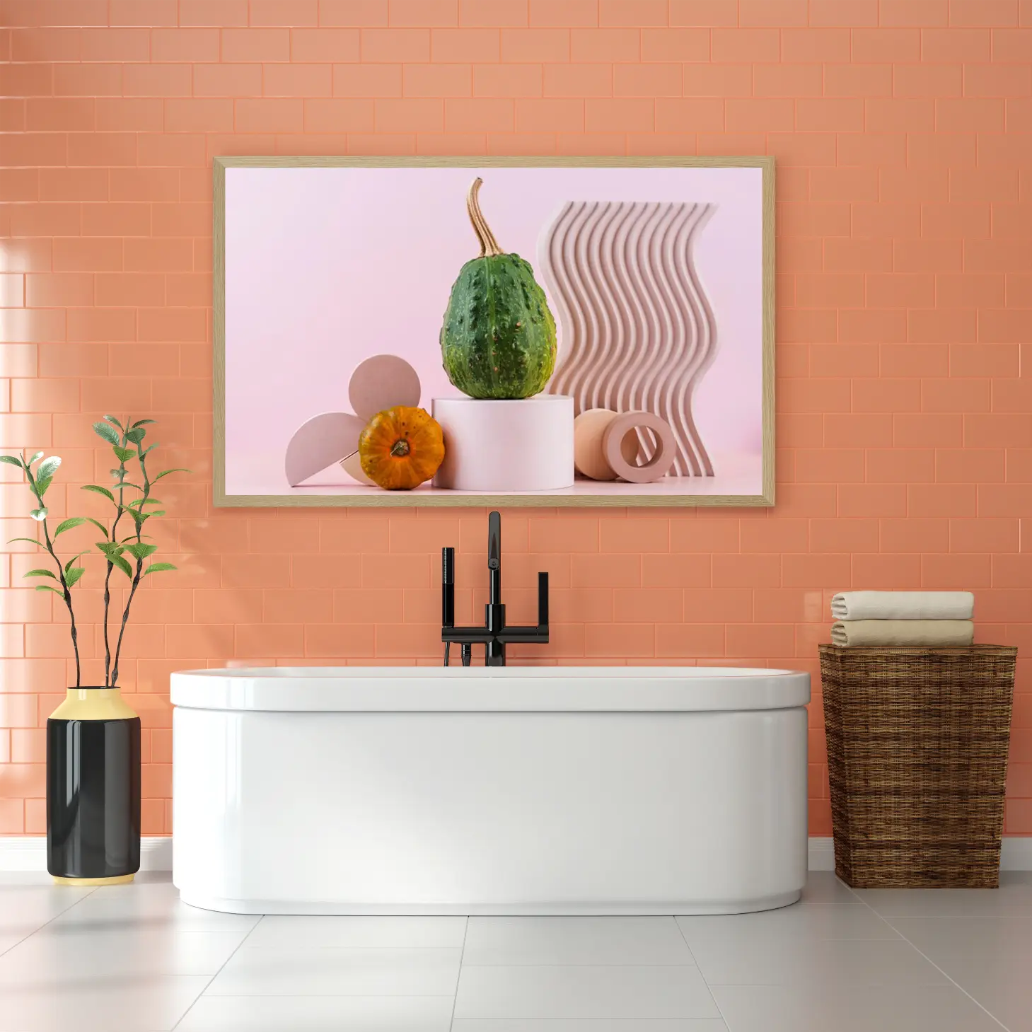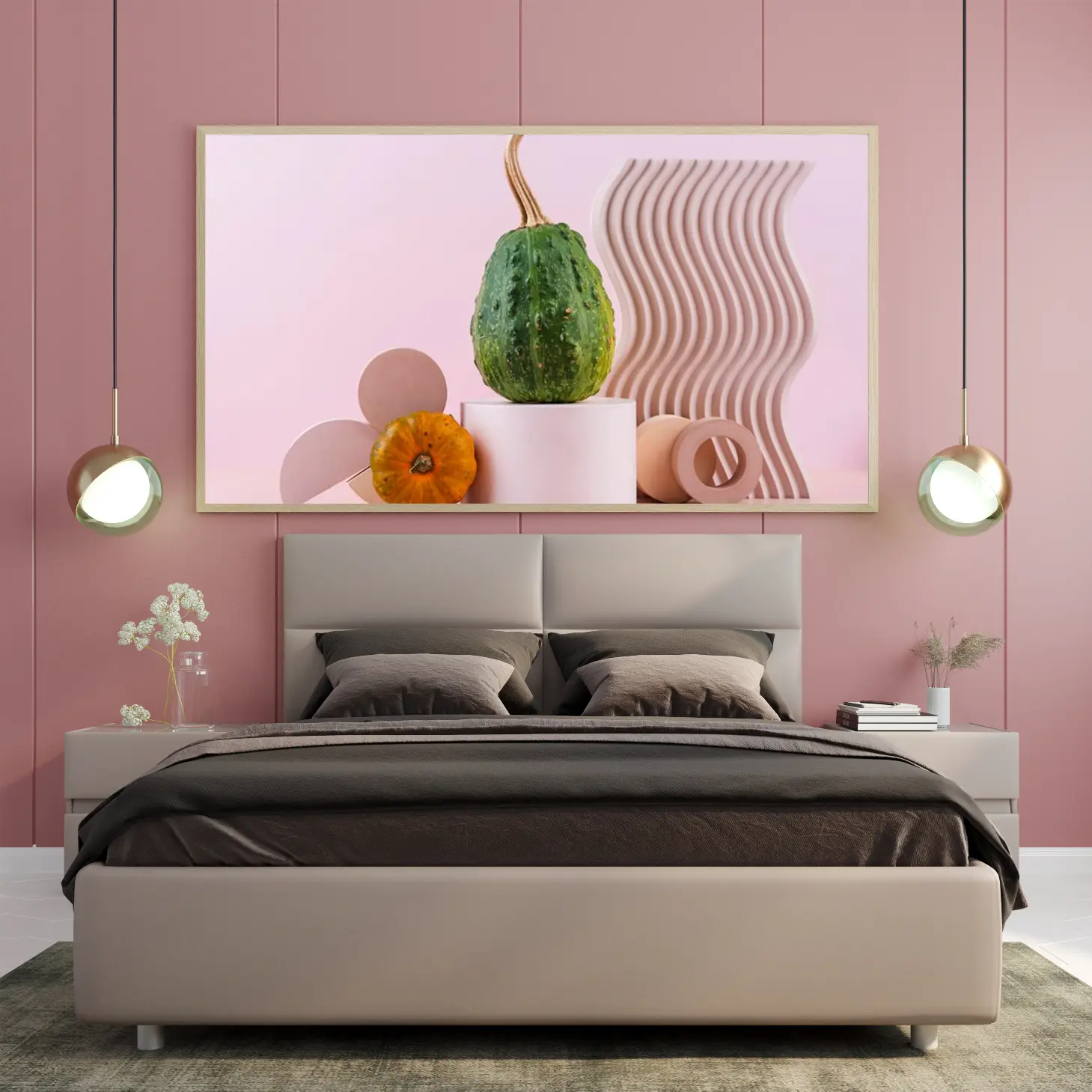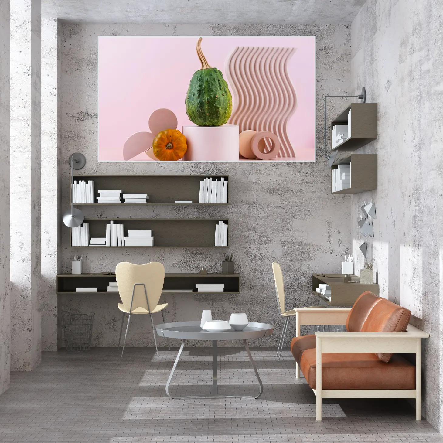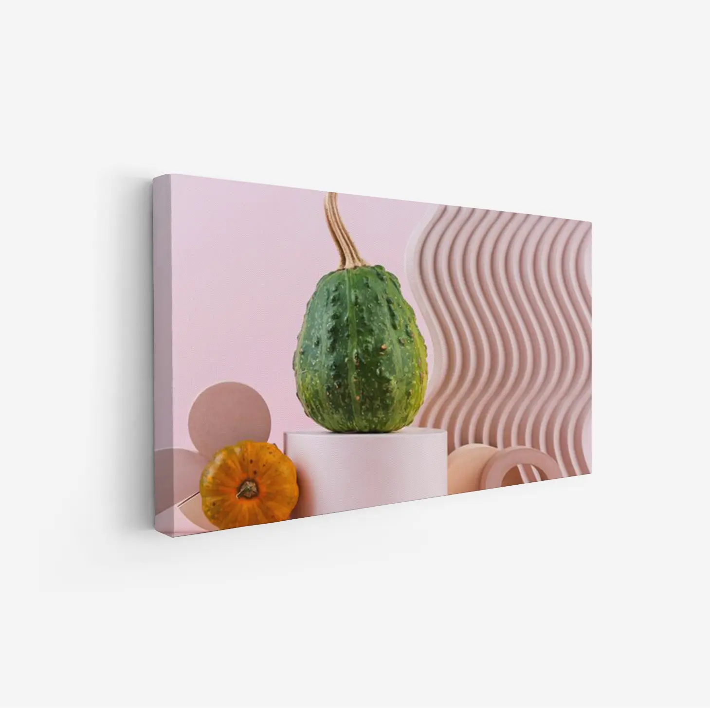 تتجلى في هذه القطعة الفنية لوحة تعكس تناغم الألوان والأشكال، حيث تتوسطها ثمرة قرع خضراء تتألق بتفاصيلها الدقيقة، محاطة بأشكال هندسية ناعمة وألوان دافئة. الخلفية الوردية تضفي شعورًا بالهدوء والراحة، مما يجعلها خيارًا مثاليًا لإضفاء لمسة من الحيوية على أي مساحة. هذه اللوحة ليست مجرد عنصر ديكور، بل هي تعبير عن أسلوب حياة عصري يدمج بين الجمال والابتكار.