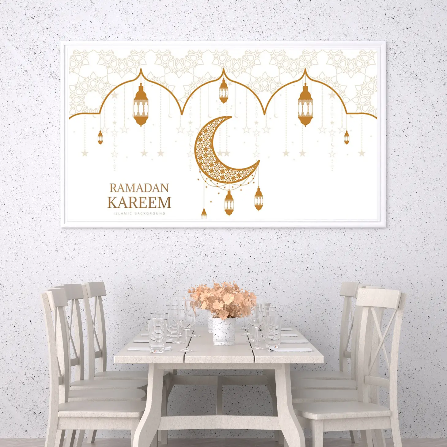 حوّل أجواء منزلك في رمضان إلى مساحة مليئة بالسكينة والروحانية مع لوحة كانفاس رمضانية فاخرة تجمع بين الذوق العصري واللمسة الإسلامية الهادئة. هذه اللوحة مصممة لتكون قطعة ديكور لافتة ولكن ناعمة في نفس الوقت، تناسب ديكور رمضان في الصالة، المجلس، الممرات، أو غرفة الطعام، وتضيف إحساسًا دافئًا مع الإضاءة المنزلية.