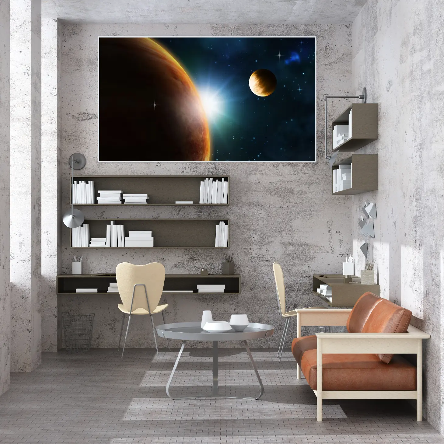 استمتع بجمال الكون مع هذه اللوحة الفنية الرائعة التي تجسد عظمة الكواكب في الفضاء. تضفي الألوان الزاهية والتفاصيل الدقيقة لمسة من السحر على أي مساحة، مما يجعلها خيارًا مثاليًا لعشاق الفضاء والفن على حد سواء. اجعل من جدران منزلك نافذة إلى عالم من الإلهام والجمال.
