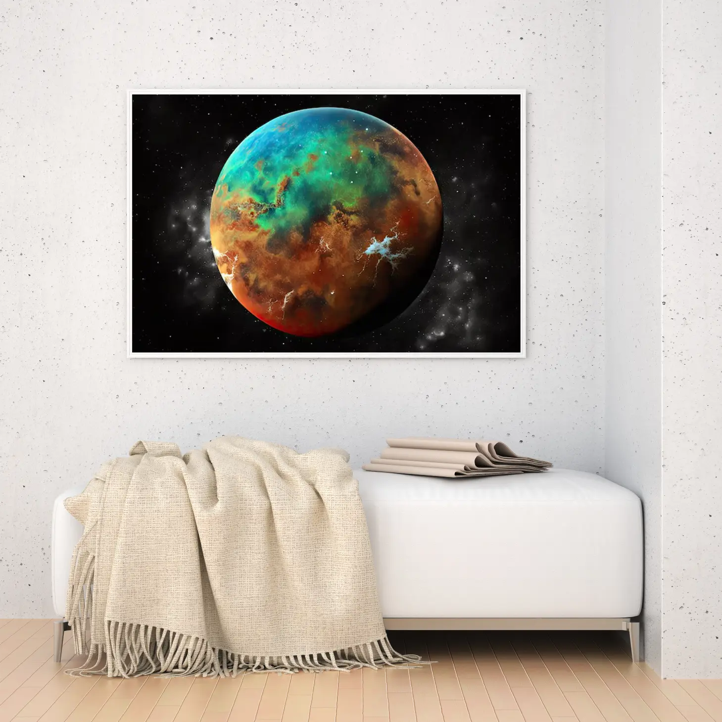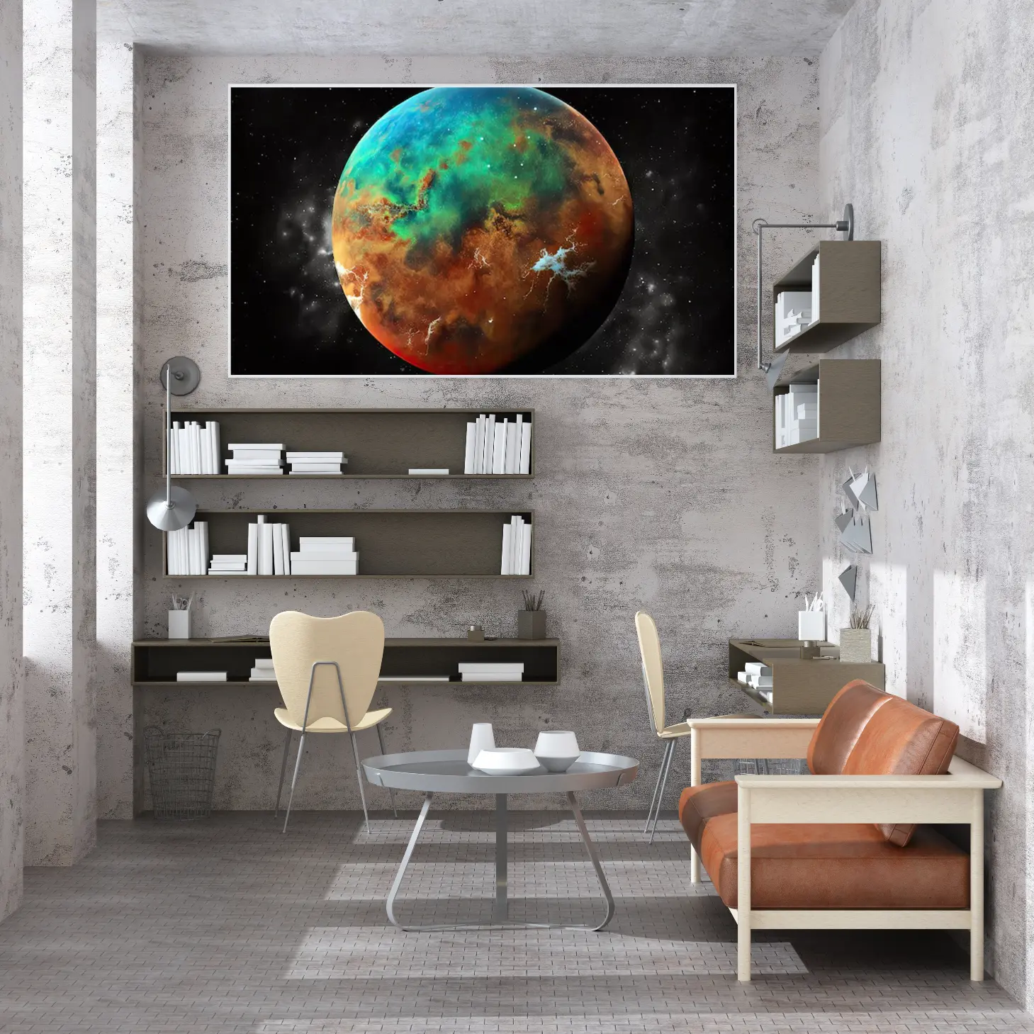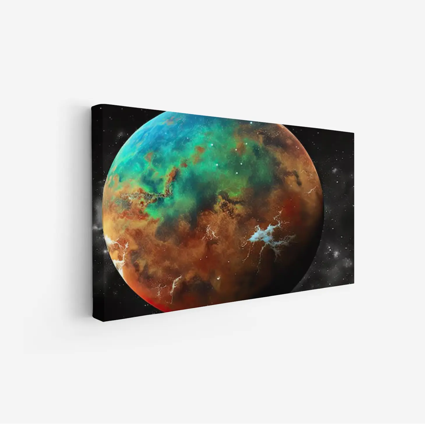 لوحة كواكب ملونة بتدرجات زاهية من الأزرق والأخضر والبرتقالي، تعكس جمال الفضاء، مناظر طبيعية، لوحات فنية عصرية، لوحات جدارية للمنزل، لوحات مودرن.