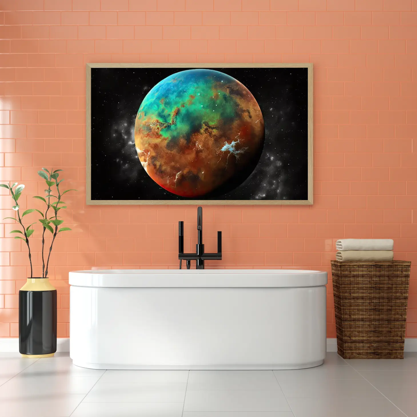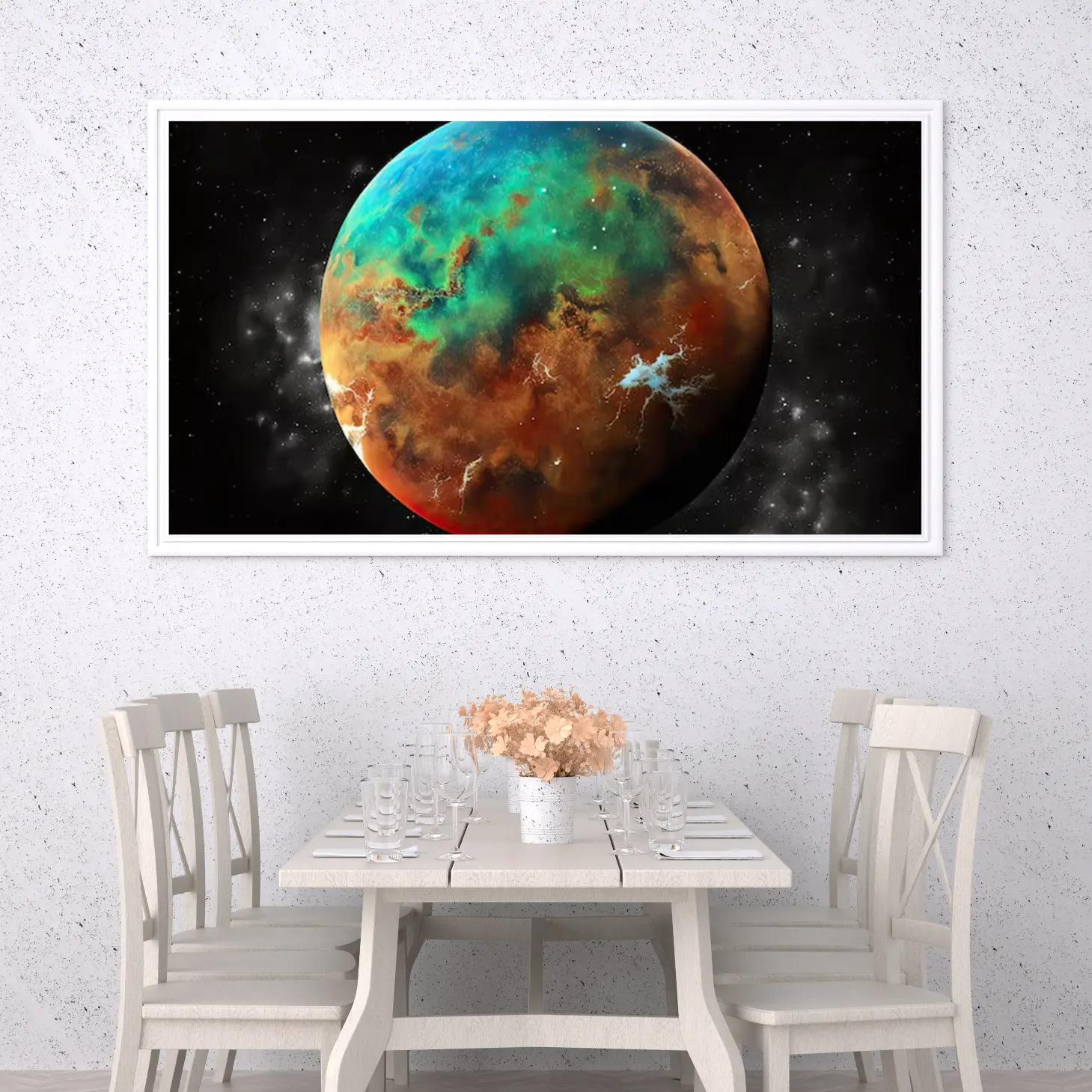 استمتع بجمال الكون مع هذه اللوحة الفنية المذهلة التي تجسد كوكبًا ملونًا بألوان زاهية. تضفي تفاصيلها الفريدة لمسة من السحر والغموض على أي مساحة، مما يجعلها الخيار المثالي لعشاق الفضاء والفن. اجعل جدرانك تتحدث عن إبداعك وذوقك الرفيع.