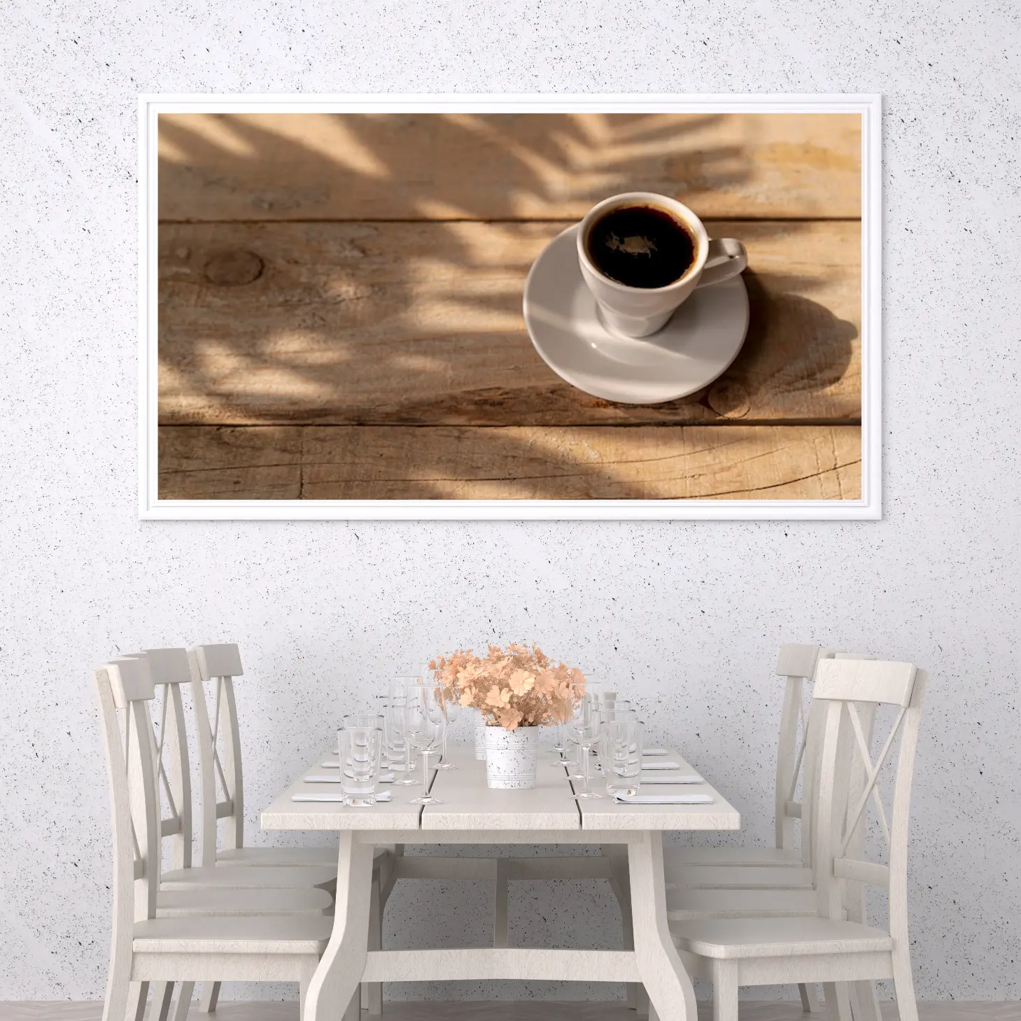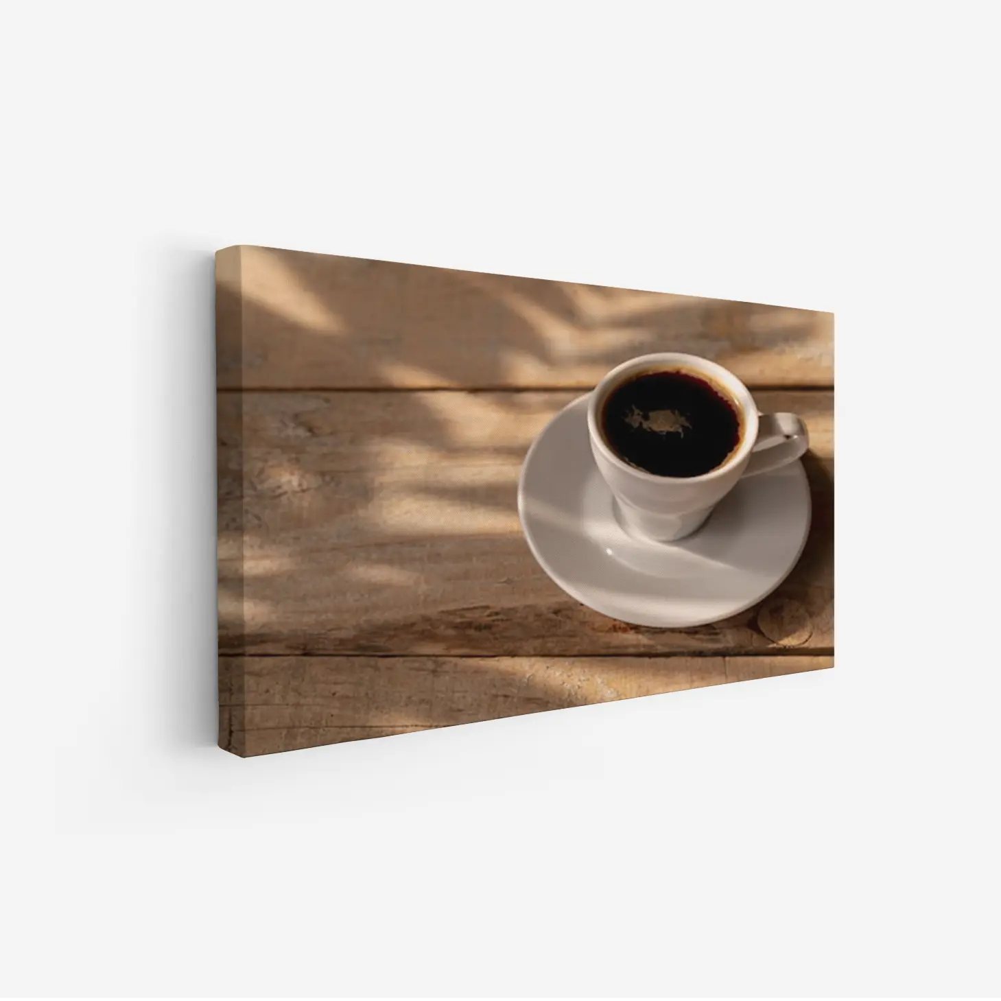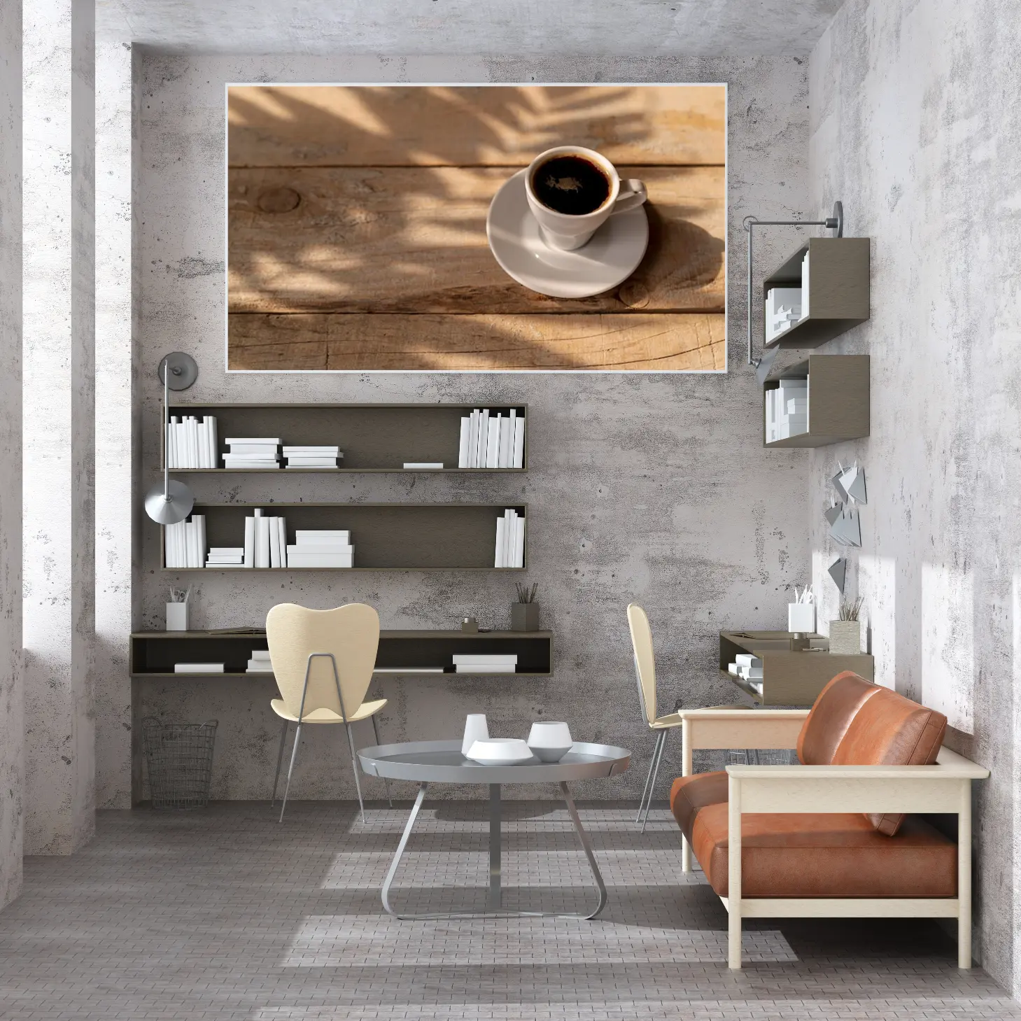 تتجلى في هذه اللوحة الفنية لحظة ساحرة من الحياة اليومية، حيث تتوسط فنجان القهوة الأبيض الأنيق صحنه، على خلفية من الخشب الطبيعي الذي يضفي دفئًا وراحة على الأجواء. تبرز الأضواء والظلال المتناغمة، مما يخلق إحساسًا بالسكينة والهدوء، ويعكس نمط حياة متوازن يجمع بين البساطة والأناقة. إن هذه القطعة الفنية ليست مجرد ديكور جداري، بل هي تعبير عن لحظات الاسترخاء والتأمل التي نحتاجها في حياتنا المعاصرة.
