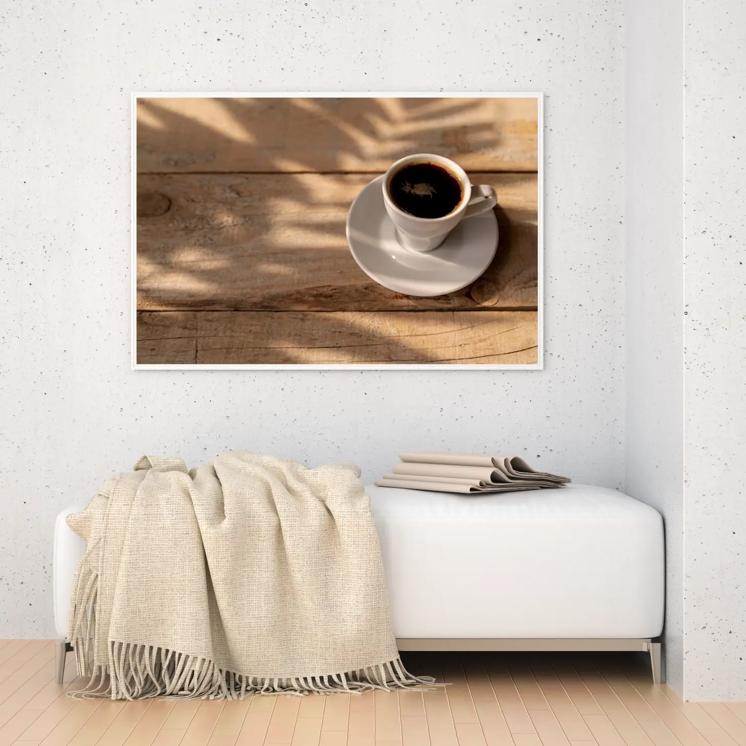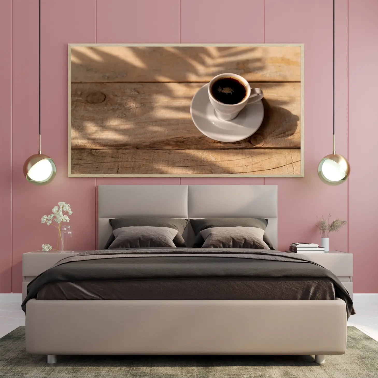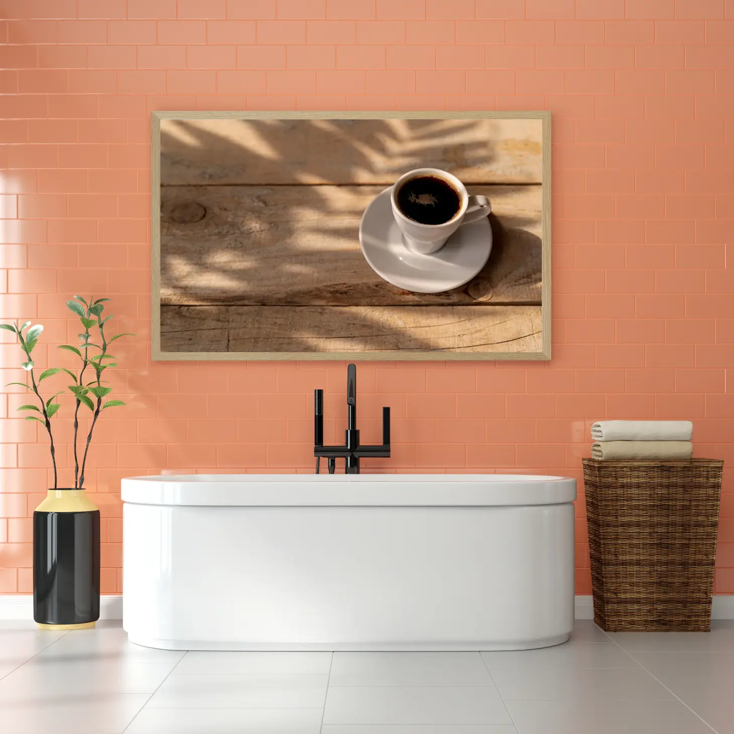 تتجلى في هذه اللوحة الفنية لحظة ساحرة من الحياة اليومية، حيث تتوسط فنجان القهوة الأبيض الأنيق صحنه، على خلفية من الخشب الطبيعي الذي يضفي دفئًا وراحة على الأجواء. تبرز الأضواء والظلال المتناغمة، مما يخلق إحساسًا بالسكينة والهدوء، ويعكس نمط حياة متوازن يجمع بين البساطة والأناقة. إن هذه القطعة الفنية ليست مجرد ديكور جداري، بل هي تعبير عن لحظات الاسترخاء والتأمل التي نحتاجها في حياتنا المعاصرة.