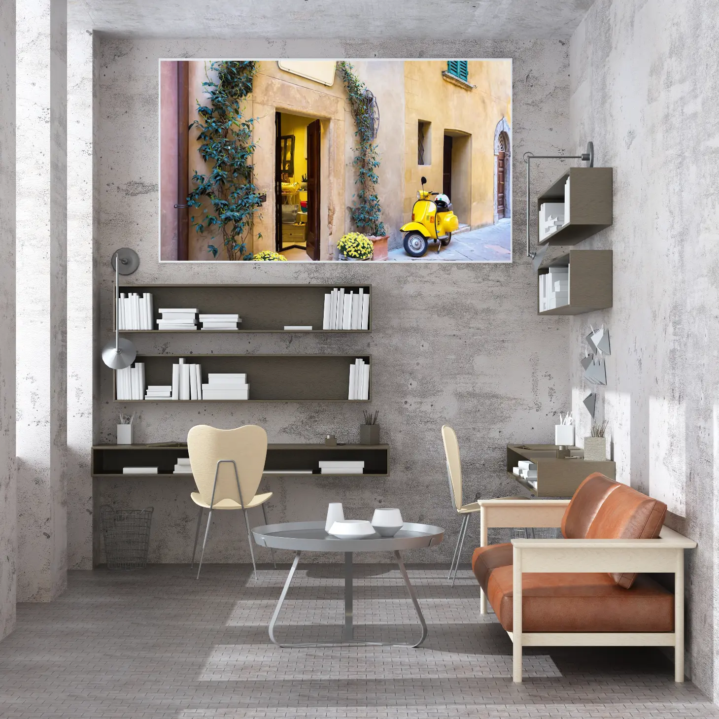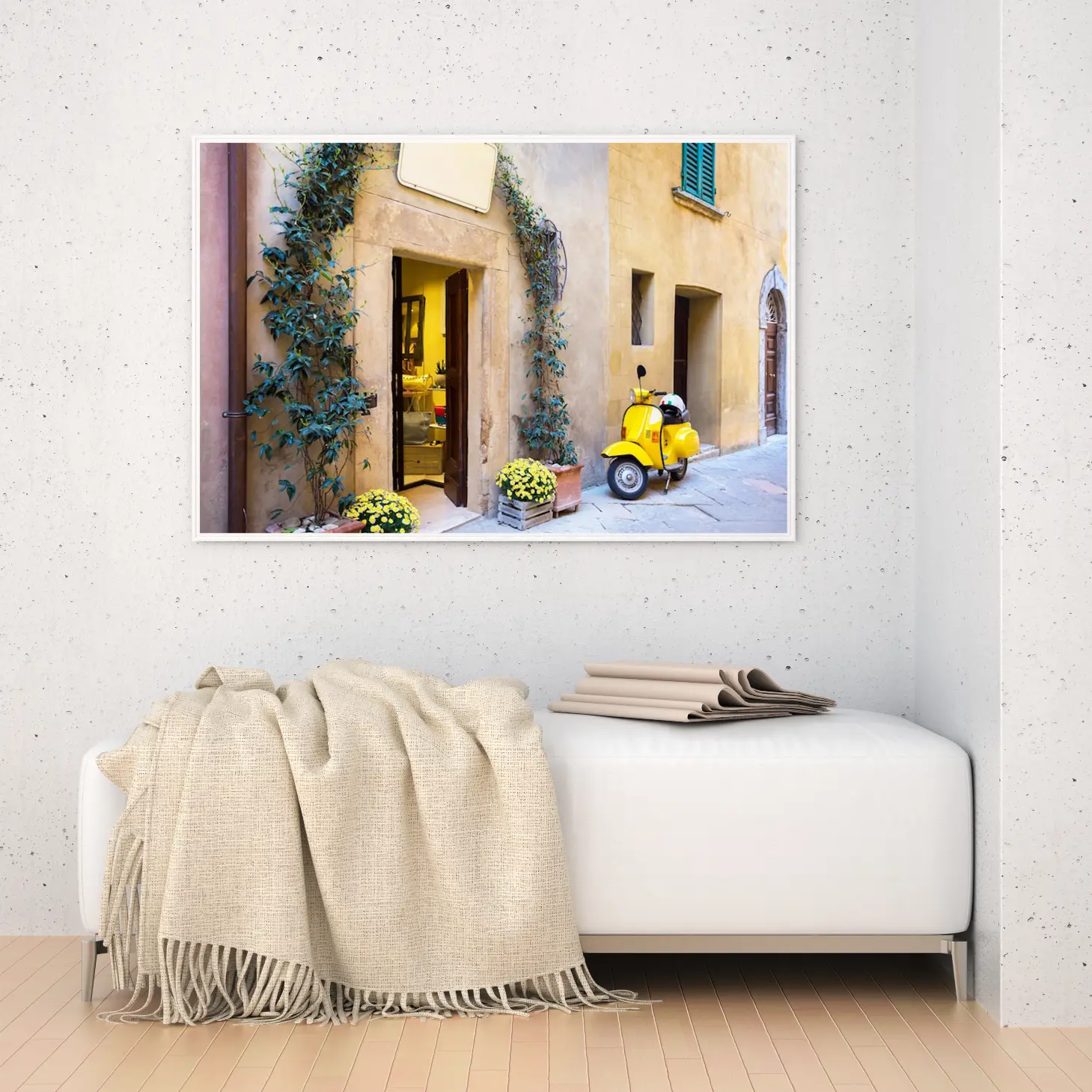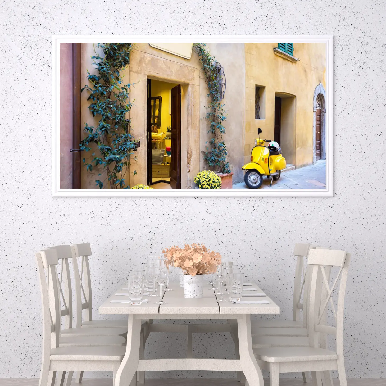 استمتع بجمال هذه اللوحة التي تجسد لحظة ساحرة من الحياة اليومية، حيث يلتقي الأصفر الزاهي لجهاز السكوتر مع جدران المبنى الدافئة والنباتات المتسلقة. تتوفر هذه التحفة الفنية بمقاسات متعددة وإطارات أنيقة، مما يجعلها خيارًا راقيًا يُقدَّم بثقة كهدية تعبّر عن الذوق الرفيع في المناسبات الخاصة.
