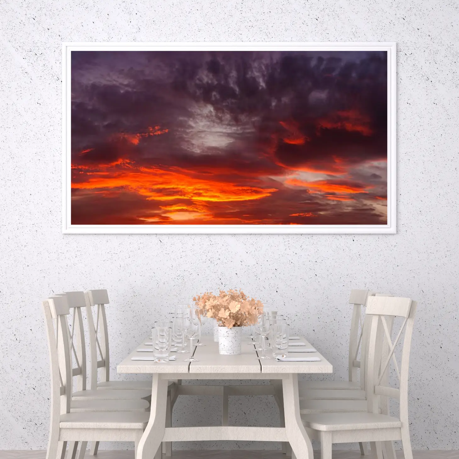لوحة منظر ليلي بألوان دافئة من البرتقالي والأحمر مع سحب داكنة، تعكس أجواء ساحرة، لوحات طبيعة، لوحات كانفاس.