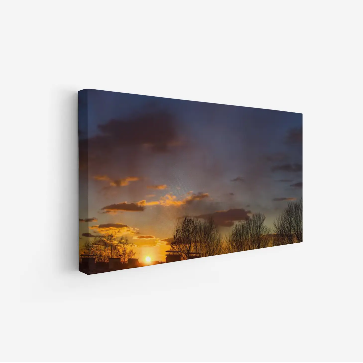 لوحة منظر ليلي بألوان دافئة وغائمة مع شمس غاربة خلف الأشجار، لوحات مناظر طبيعية، لوحات كانفاس.