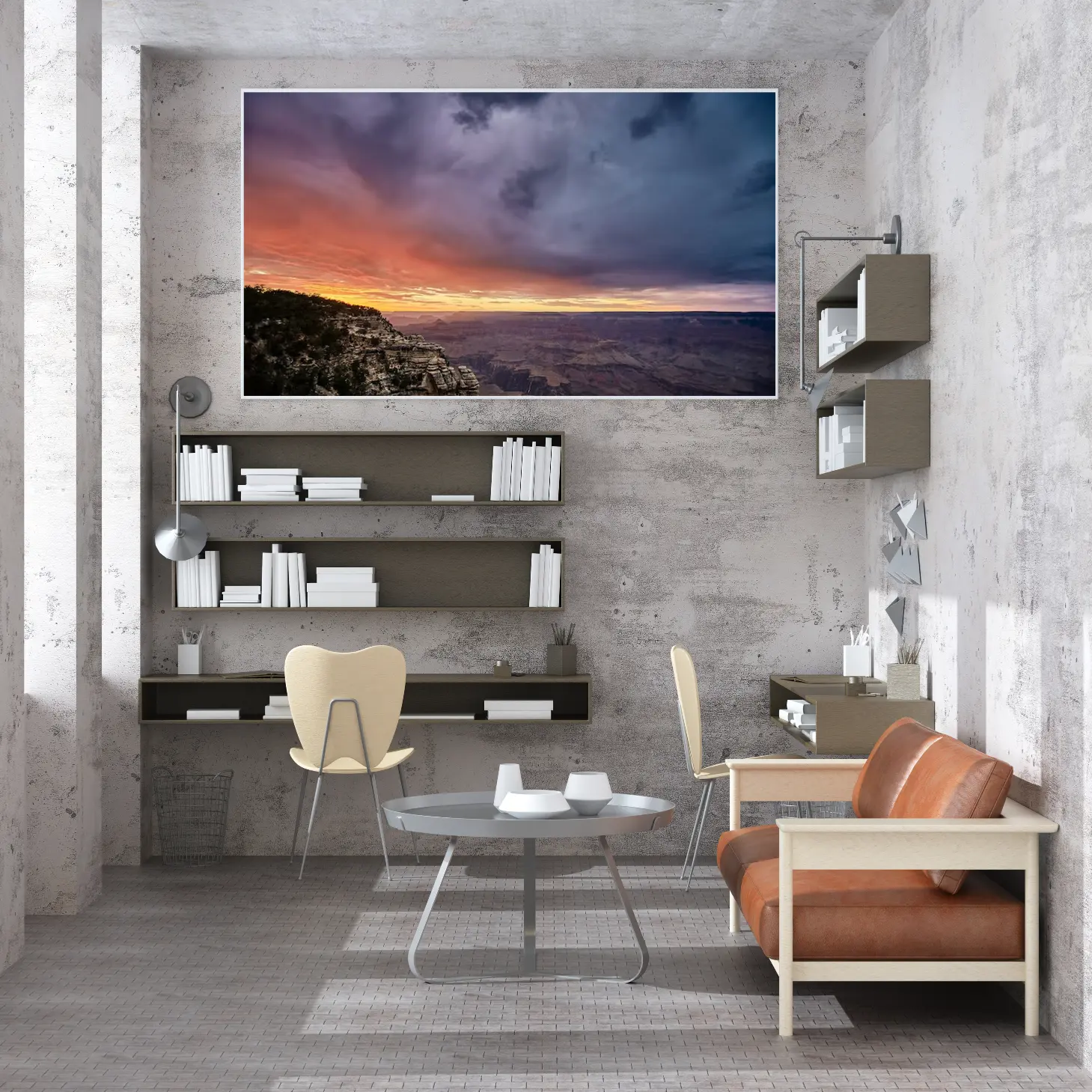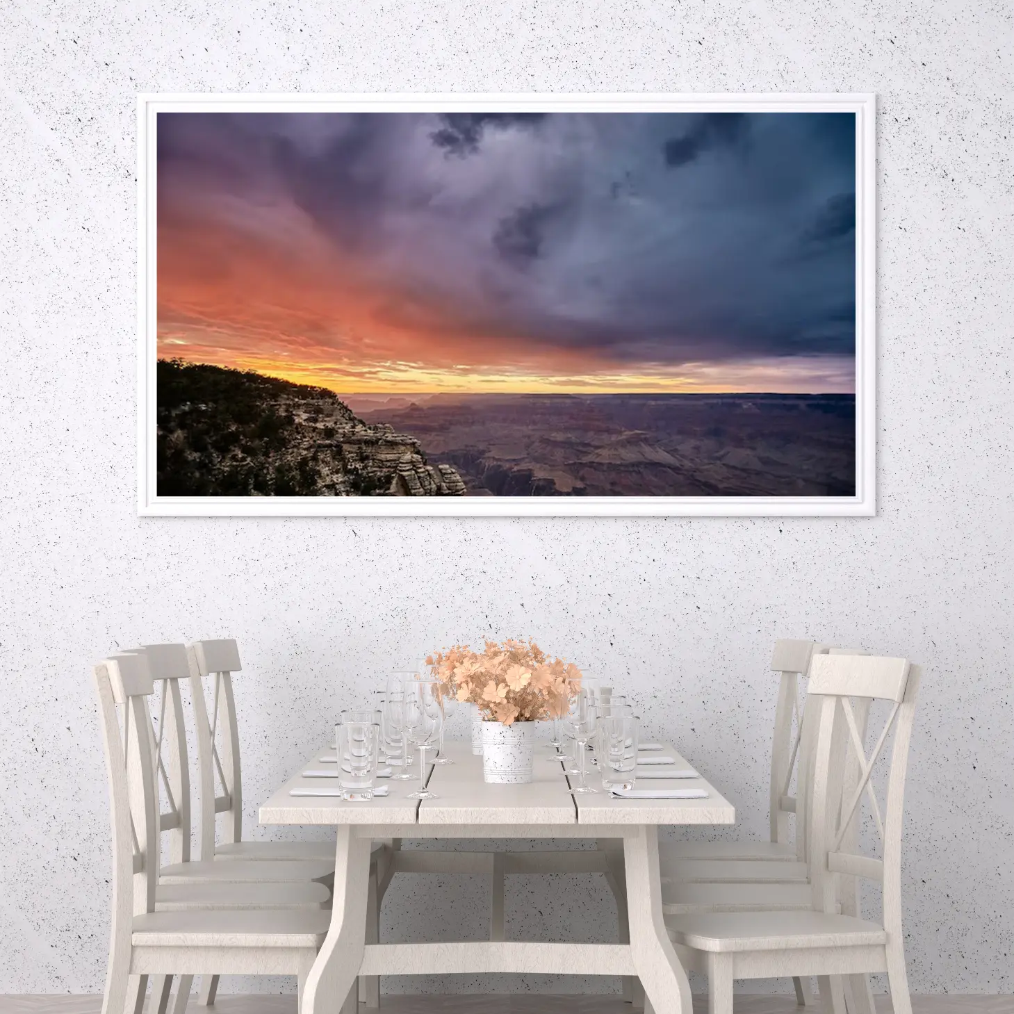 تجسد هذه اللوحة جمال الطبيعة الخلابة، حيث تتناغم ألوان الغروب الساحرة مع تضاريس الجبال الوعرة، مما يخلق إحساسًا بالهدوء والسكون. تعكس الألوان الدافئة للغروب شعورًا بالراحة والسكينة، مما يجعلها خيارًا مثاليًا لإضفاء لمسة من الجمال على أي مساحة. إن تأثير هذه القطعة الفنية على أجواء المكان لا يُضاهى، حيث تضفي لمسة من الأناقة والرقي على نمط الحياة.