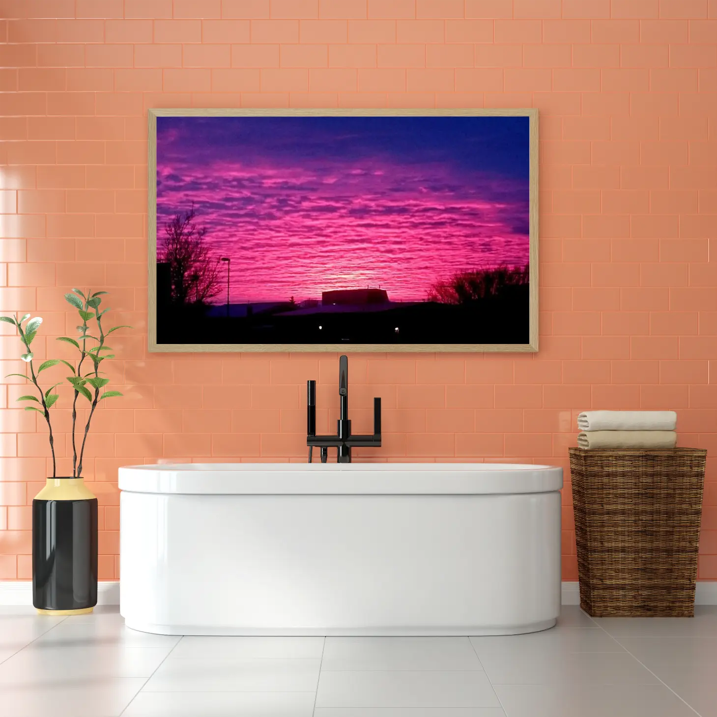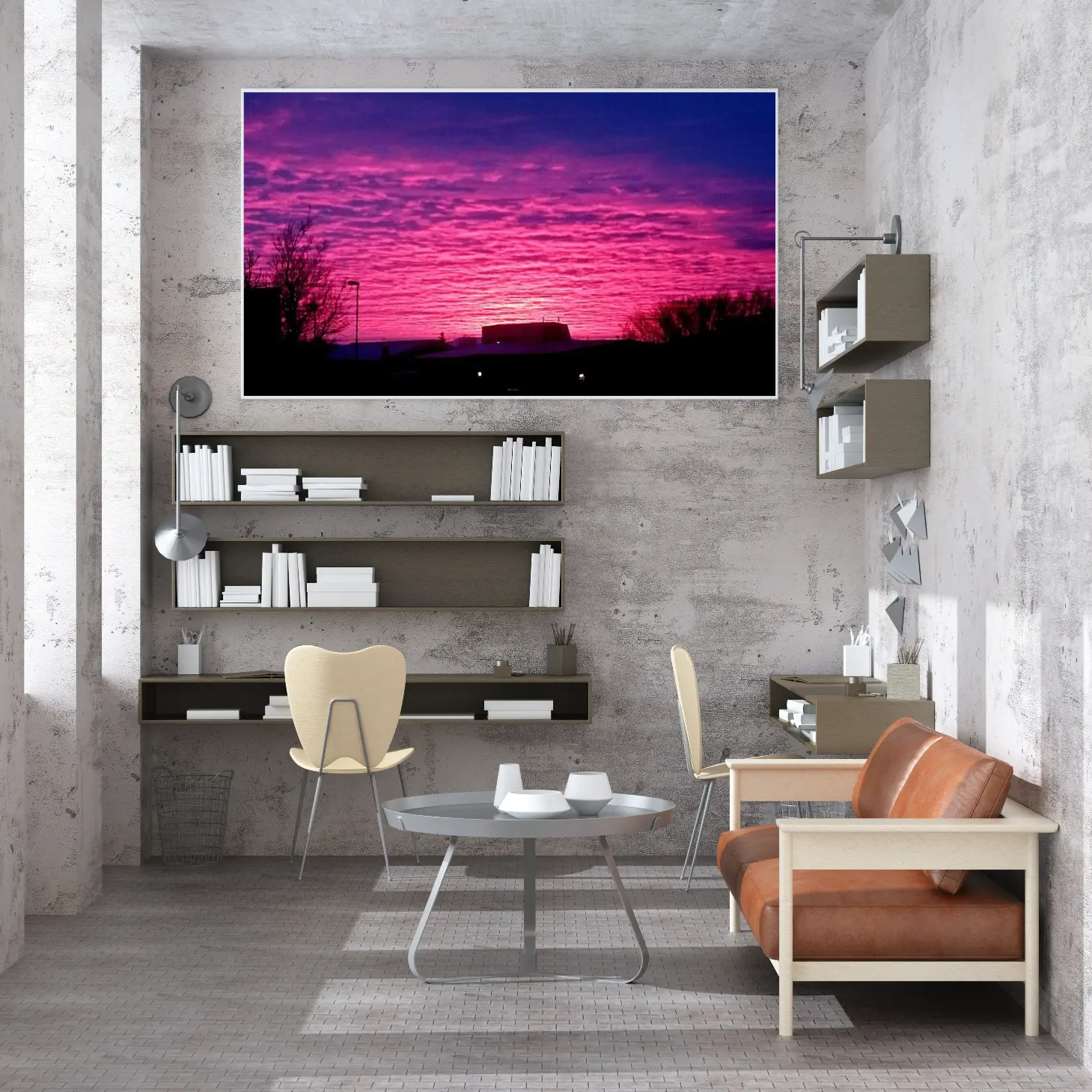 تتجلى في هذه اللوحة ألوان الغروب الساحرة، حيث تتناغم درجات الأرجواني والوردي مع السماء، مما يخلق إحساسًا بالهدوء والسكون. تعكس الأجواء العامة للمشهد جمال الطبيعة في أبهى صورها، مما يجعلها إضافة مثالية لأي مساحة. إن تأثير هذه اللوحة على المكان لا يقتصر فقط على الجمال البصري، بل يمتد ليشمل تعزيز نمط الحياة الهادئ والمريح، مما يجعلها خيارًا مثاليًا لمن يسعى لإضفاء لمسة من السحر على منزله.