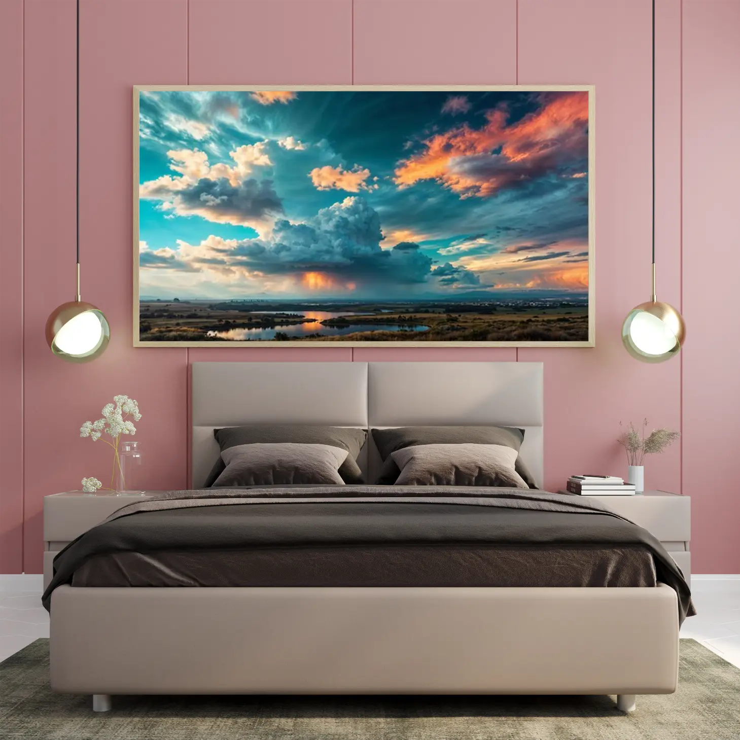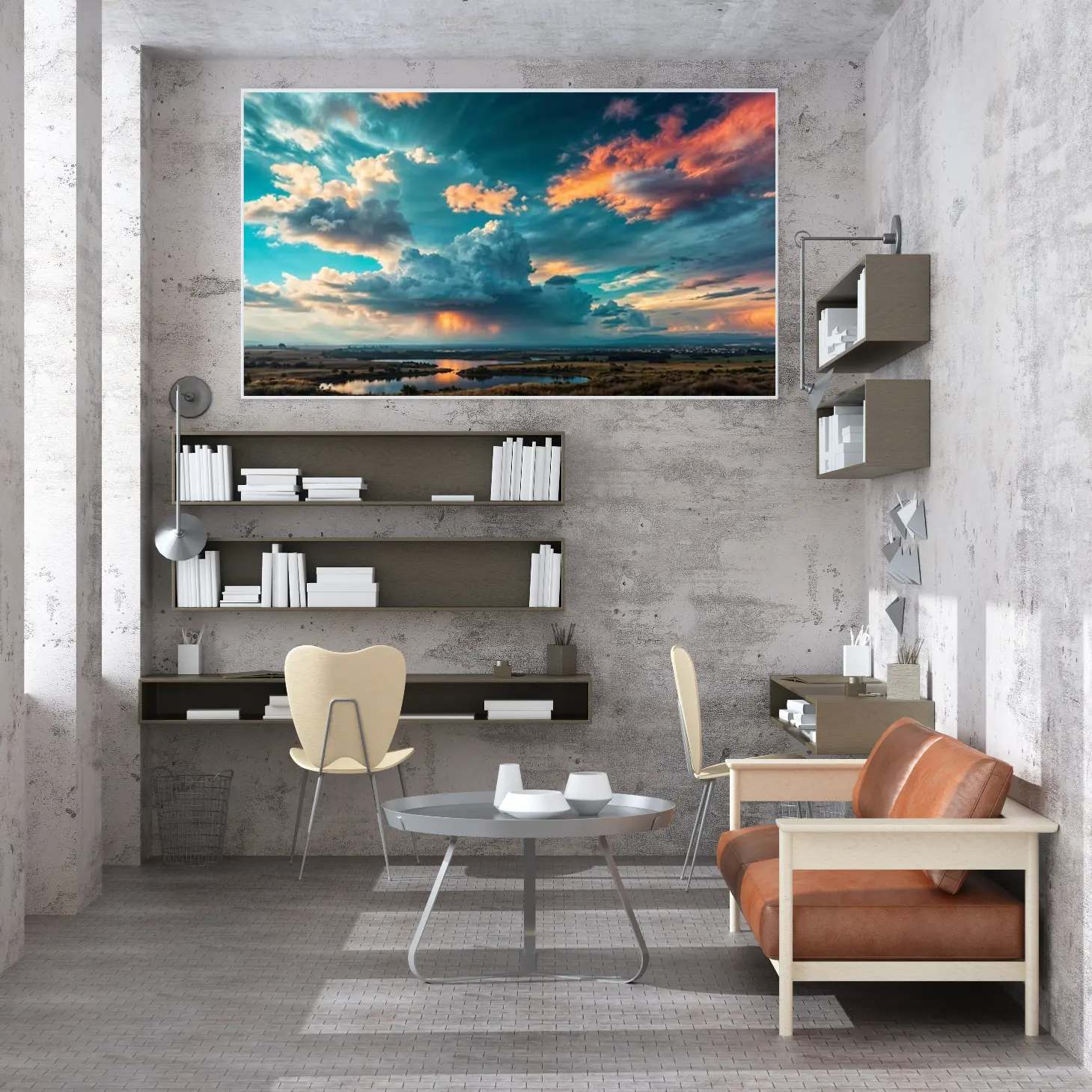 تتجلى في هذه اللوحة الفنية مشاهد طبيعية تأسر الأنفاس، حيث تتناغم الألوان الزاهية مع تفاصيل السماء المليئة بالسحب المتنوعة. تعكس الأجواء العامة شعورًا بالهدوء والسكينة، مما يجعلها إضافة مثالية لأي مساحة. تساهم هذه القطعة في خلق جو من الإلهام والتأمل، مما يعزز نمط الحياة الهادئ والمريح.