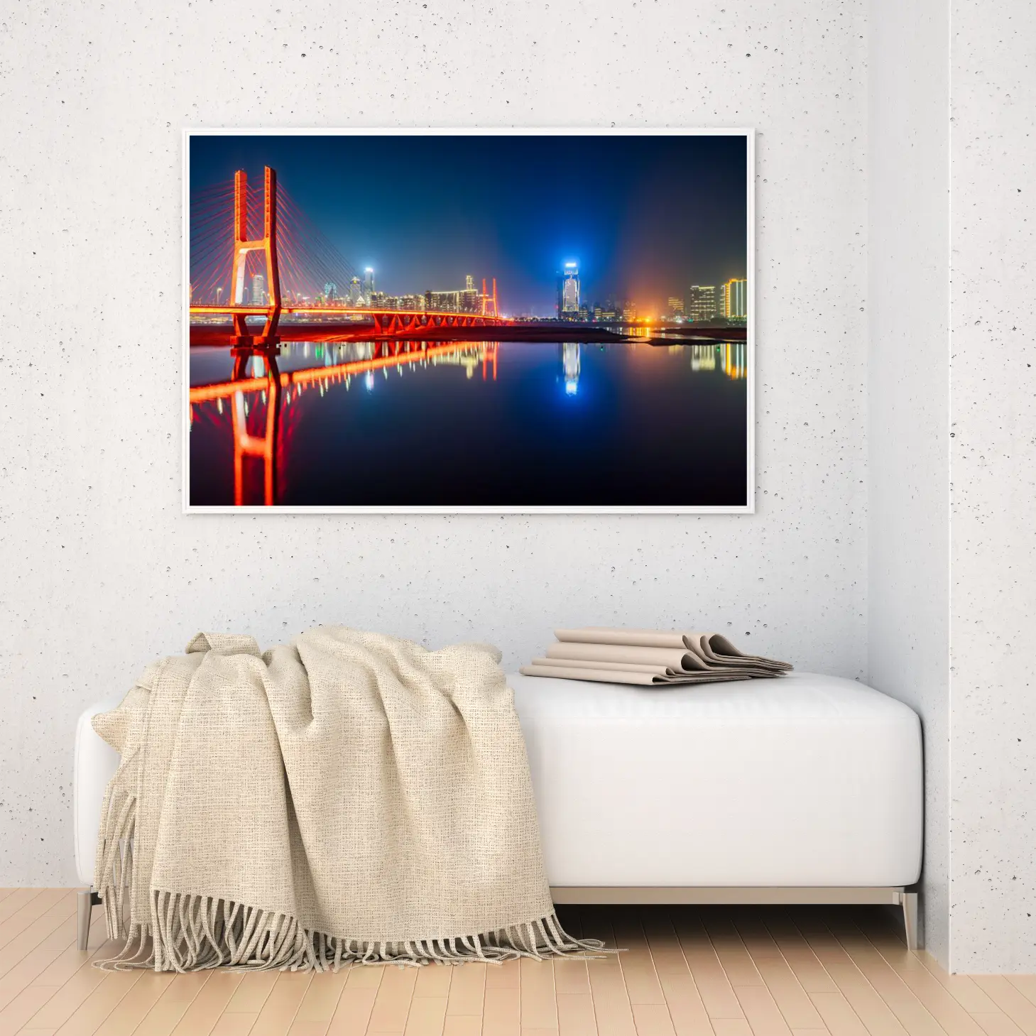استمتع بجمال مدينة تتلألأ تحت ضوء القمر، حيث ينعكس جسرٌ مذهل بألوانه الزاهية على صفحة الماء الهادئة. هذه اللوحة الفاخرة، المتاحة بمقاسات متعددة وإطارات أنيقة، تُعد خيارًا مثاليًا لإضفاء لمسة من الرقي على أي مساحة، مما يجعلها هدية تعبّر عن الذوق الرفيع في المناسبات الخاصة.