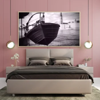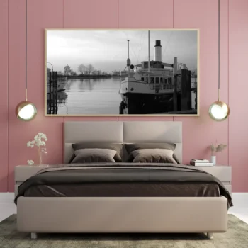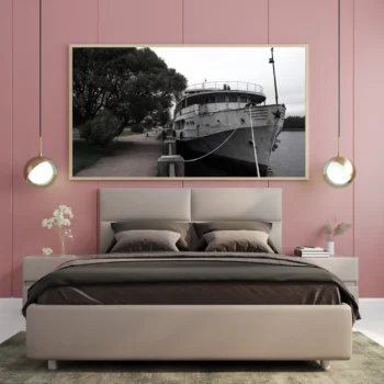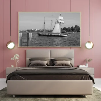 لوحة بحرية بسفينة قديمة تتأرجح بلطف في المياه الهادئة، بألوان رمادية وبيضاء، جو هادئ ومريح، لوحات طبيعة، لوحات كانفاس.