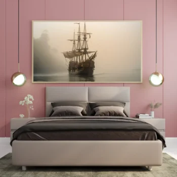 لوحة بحرية بسفينة قديمة تبحر في ضباب كثيف بألوان دافئة، تعكس أجواء الغموض والسحر، لوحات فنية مودرن، لوحات كانفاس.