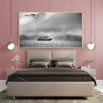 لوحة بحرية بسفينة في أجواء ضبابية مع تدرجات رمادية، تعكس هدوء البحر، لوحات مناظر طبيعية، لوحات كانفاس.