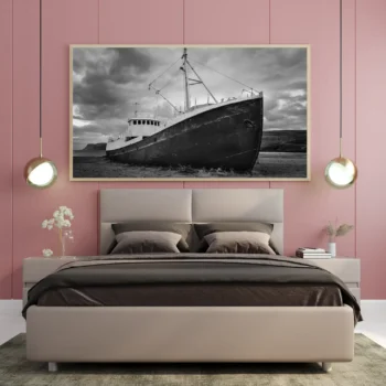 لوحة بحرية بسفينة قديمة بلونين أبيض وأسود تحت سماء غائمة، أجواء هادئة ومؤثرة، لوحات جدارية، لوحات كانفاس.