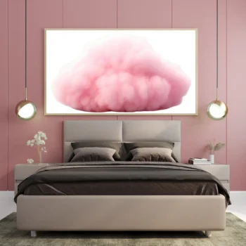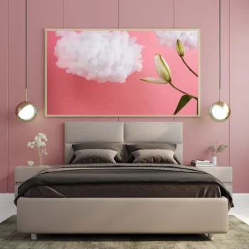 لوحة طبيعة هادئة بألوان وردية وزهور بيضاء مع سحب ناعمة، تعكس أجواء السكون والجمال، لوحات فنية مودرن، لوحات كانفاس.