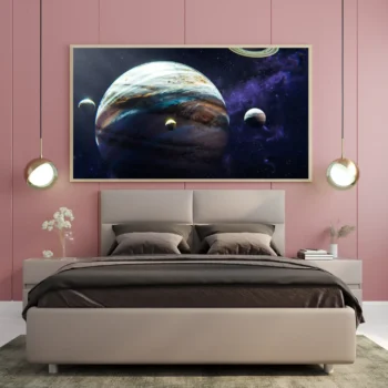 لوحة كواكب في الفضاء مع تفاصيل دقيقة للأقمار والنجوم، ألوان داكنة وزرقة عميقة، جو غامض وفضائي، مناظر طبيعية، لوحات فنية عصرية، لوحات جدارية للمنزل، لوحات أنيقة.
